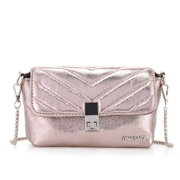 Cartera confeccionada en P U (simil cuero) color rosa con acabado metálico, su diseño presenta un efecto acolchado con patrón geométrico, lo que le aporta un estilo sofisticado y moderno.