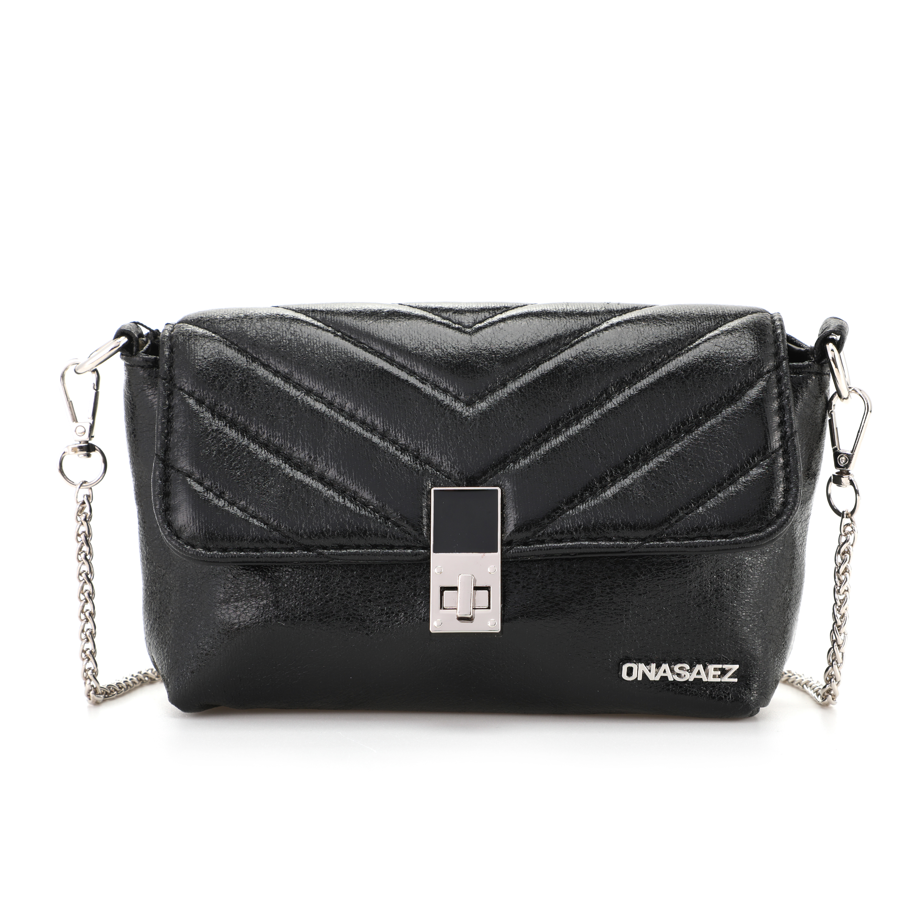 Cartera confeccionada en P U (simil cuero) color negra con acabado metálico, su diseño presenta un efecto acolchado con patrón geométrico, lo que le aporta un estilo sofisticado y moderno.