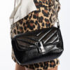 Sistema de apertura con cierre y solapa, y correa de cadena para colgar al hombro.