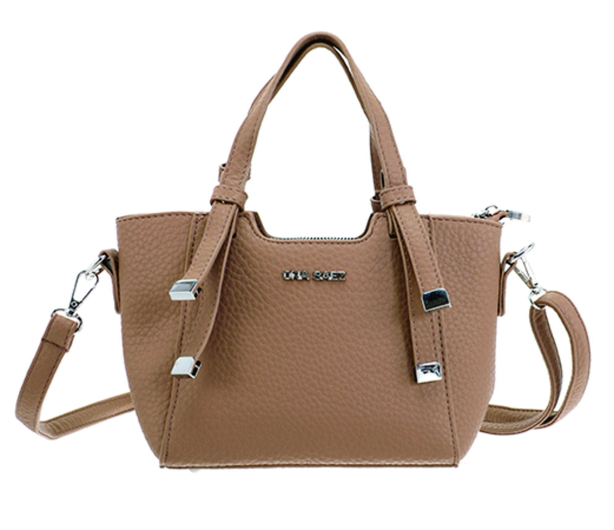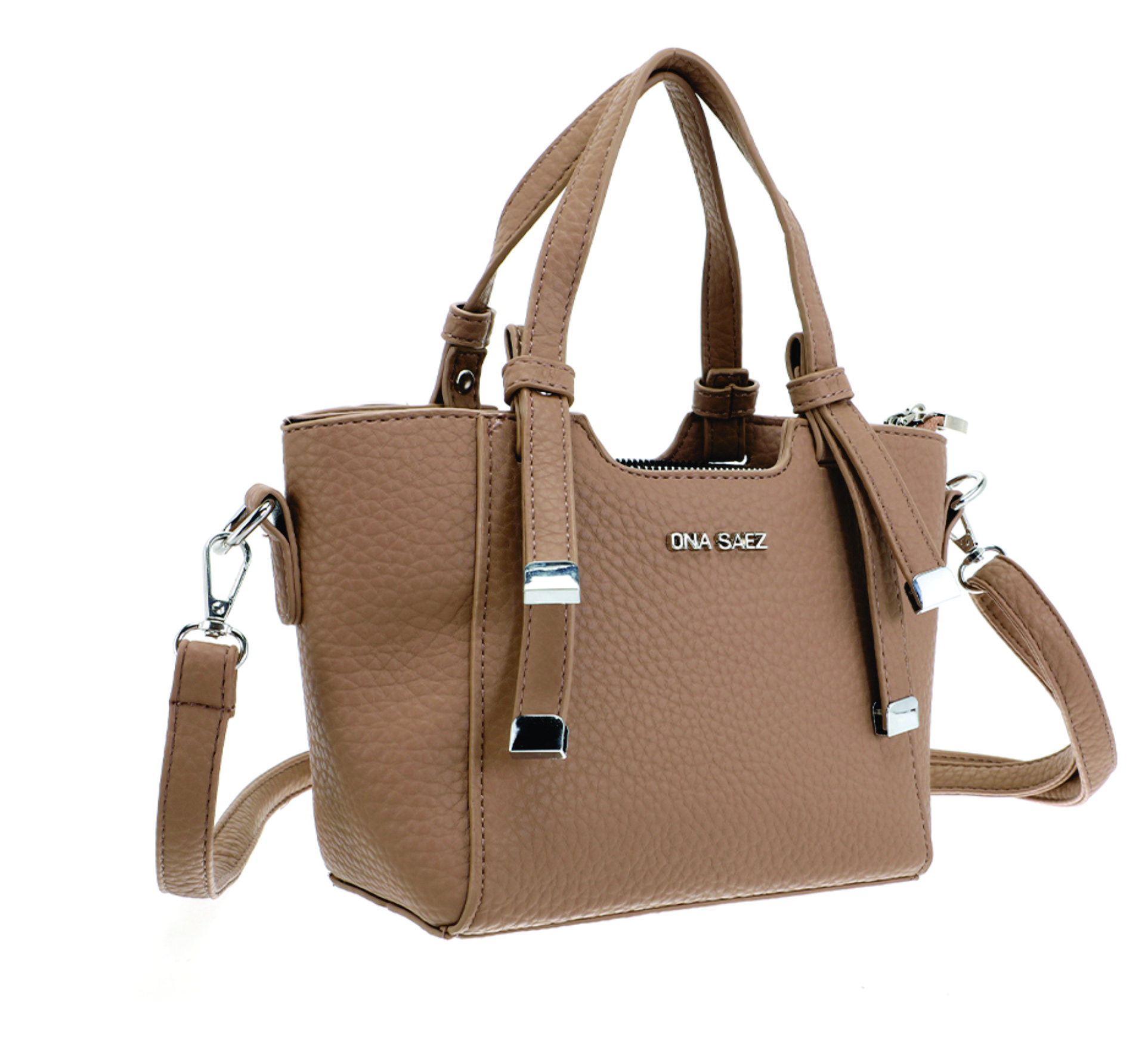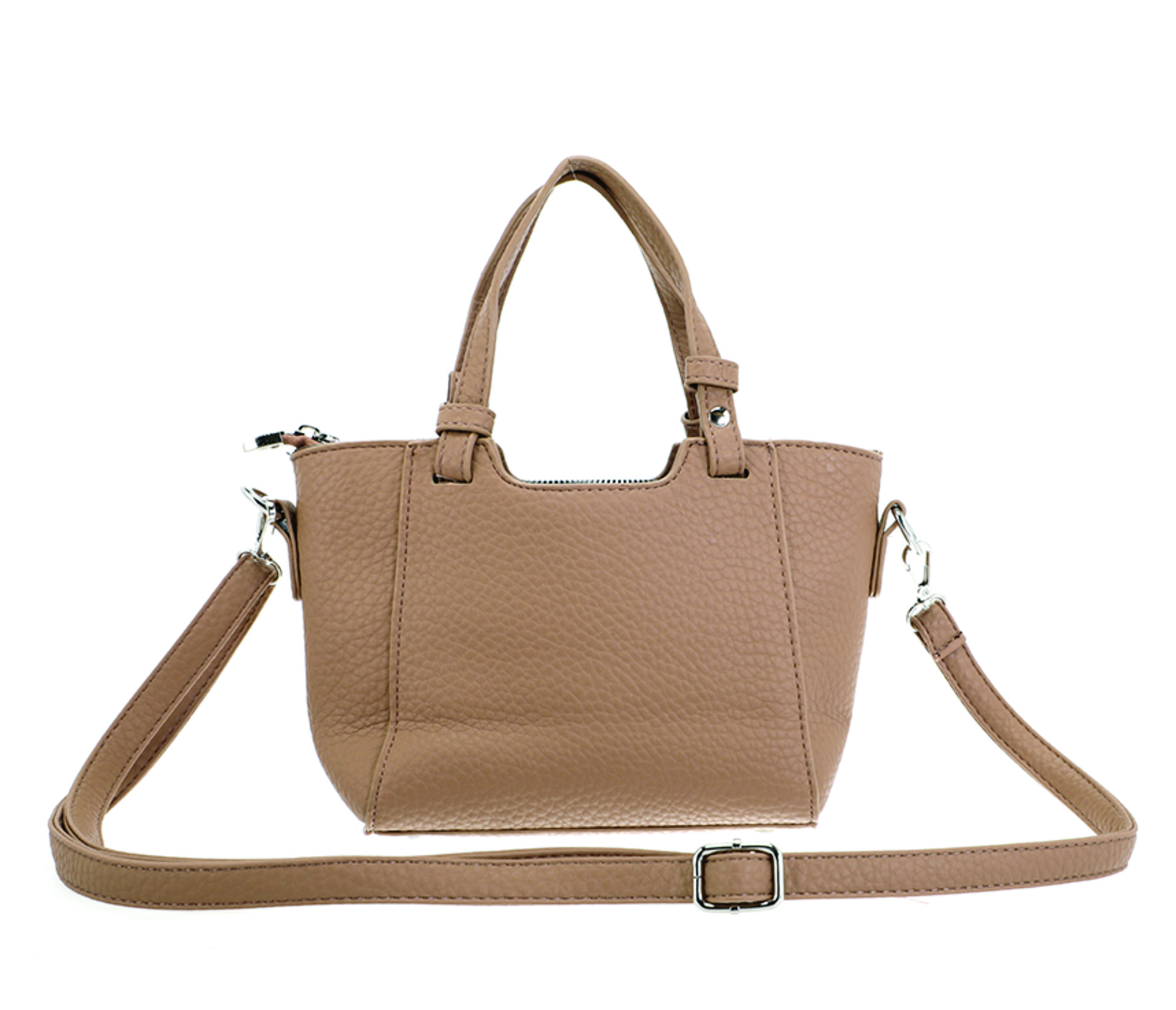 Mini cartera tipo tote bag confeccionada en material símil cuero con textura graneada. Su diseño estructurado y moderno se destaca por las manijas cortas rígidas y la correa larga regulable y desmontable, que permite llevarla cruzada o al hombro.