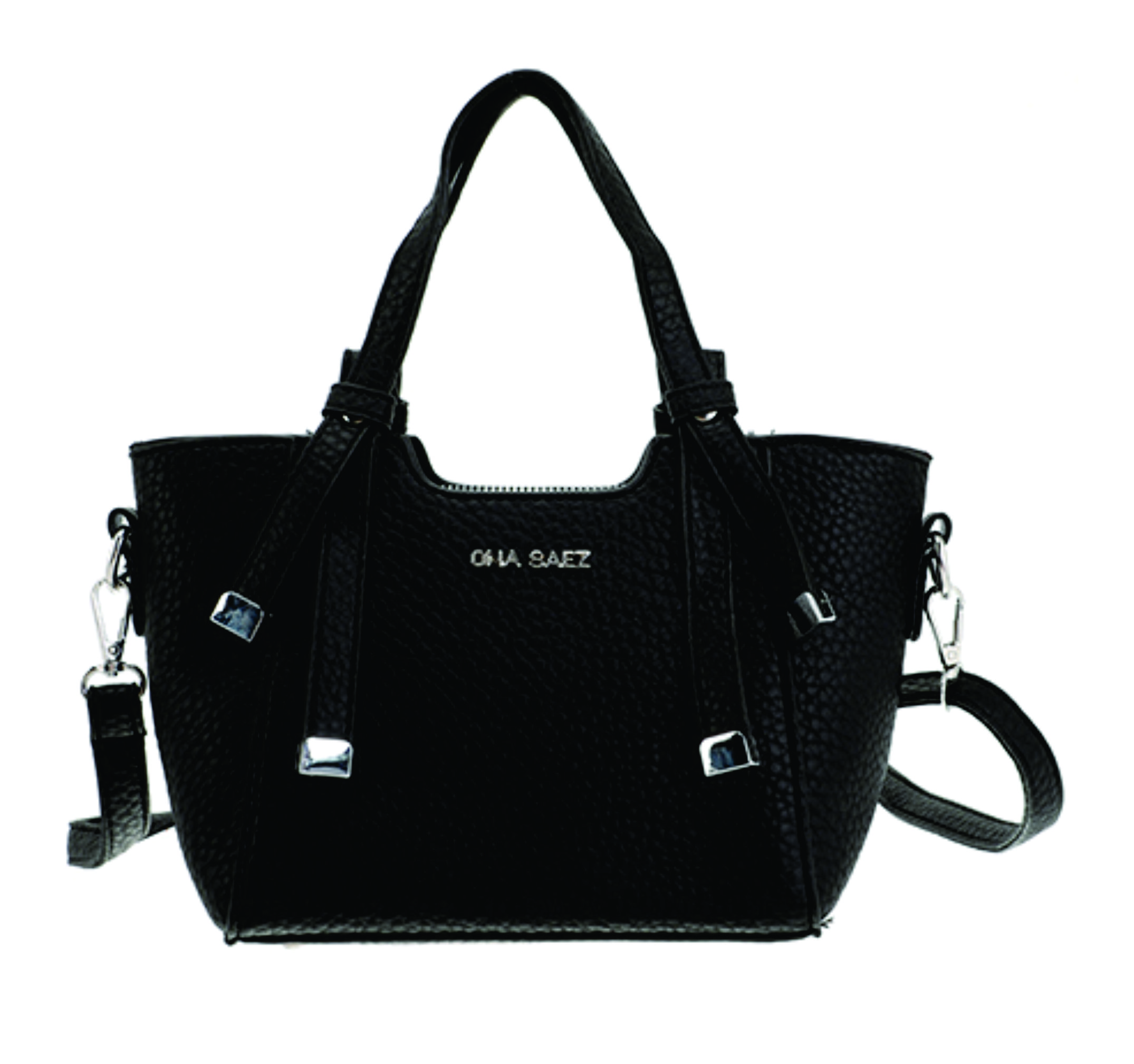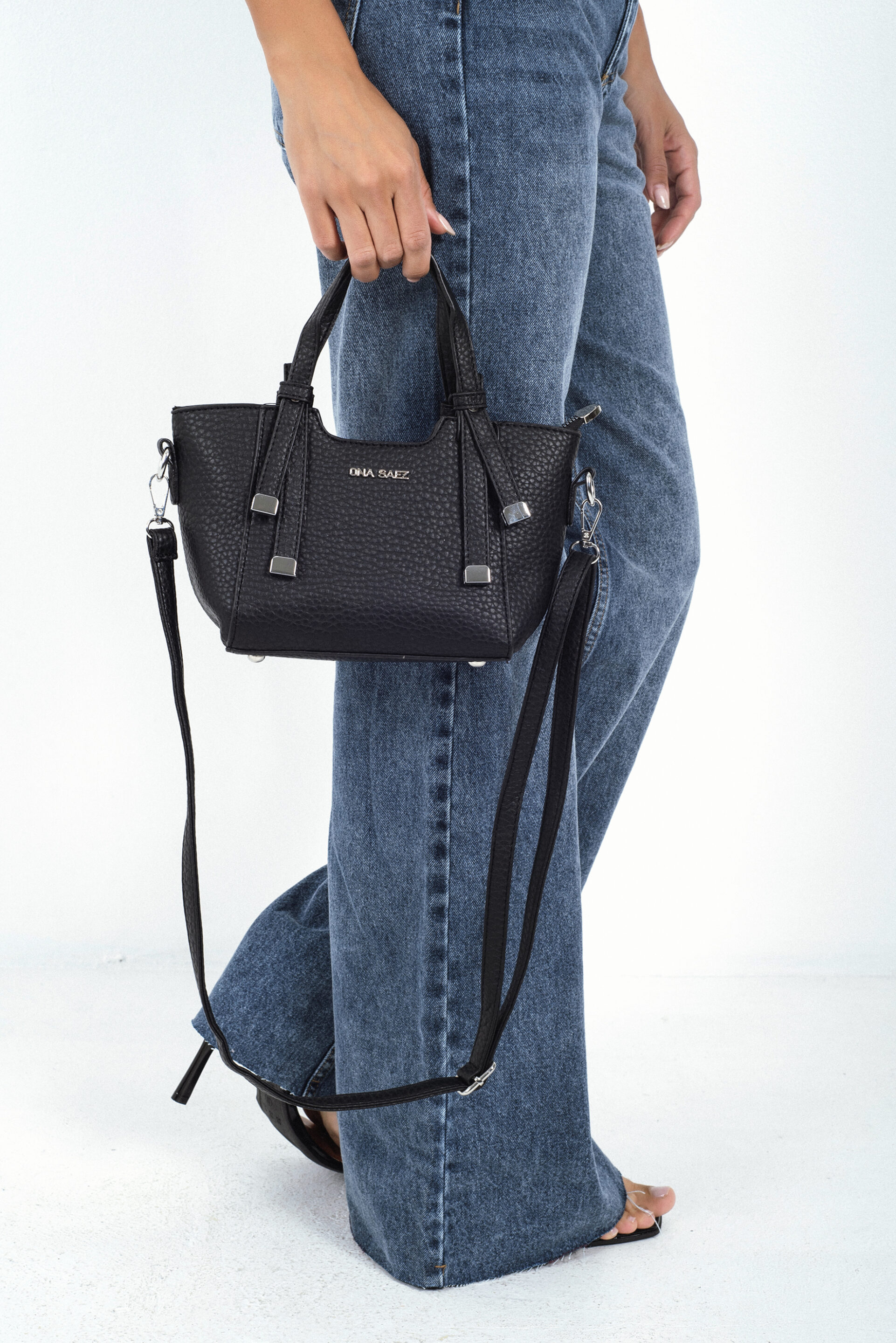 Mini cartera tipo tote bag confeccionada en material símil cuero con textura graneada. Su diseño estructurado y moderno se destaca por las manijas cortas rígidas y la correa larga regulable y desmontable, que permite llevarla cruzada o al hombro.