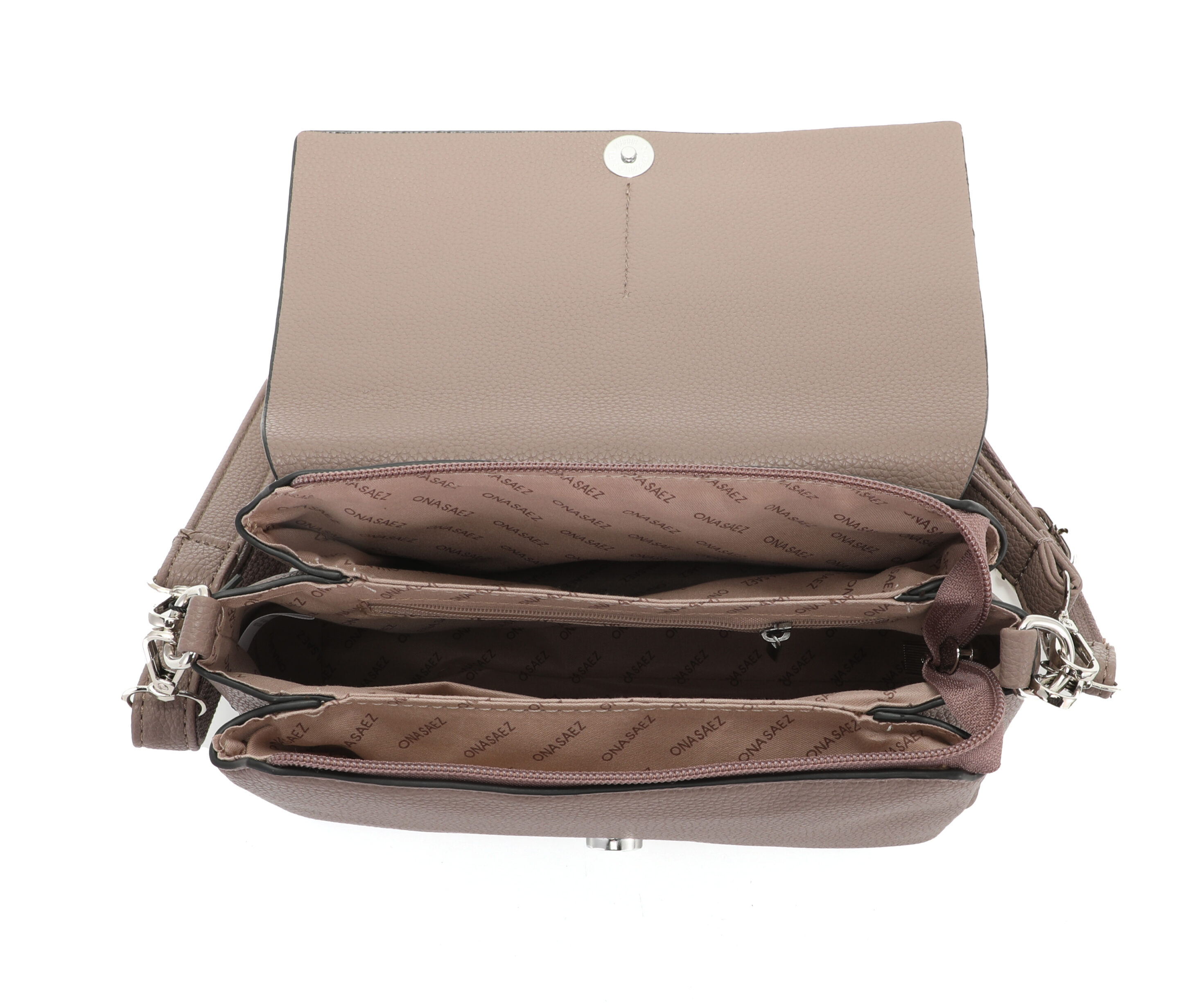 Cuenta con doble correa, una corta para mano y una mas larga que permite llevarla tanto al hombro como cruzada, tiene varios compartimentos interiores que facilitan la organización de objetos personales.