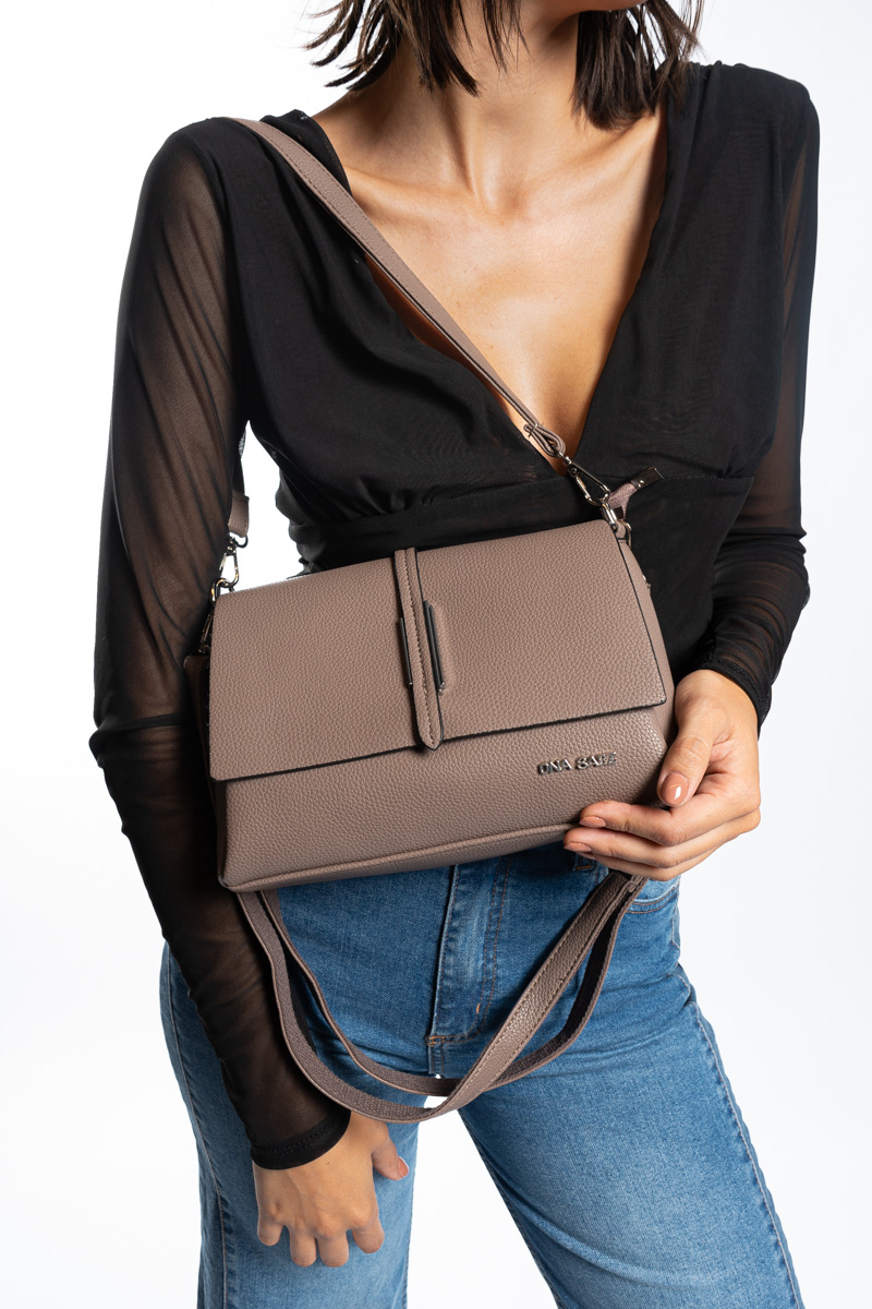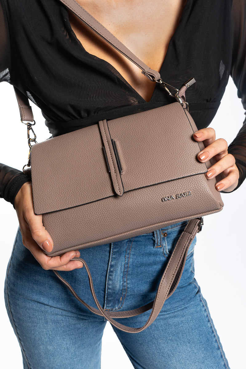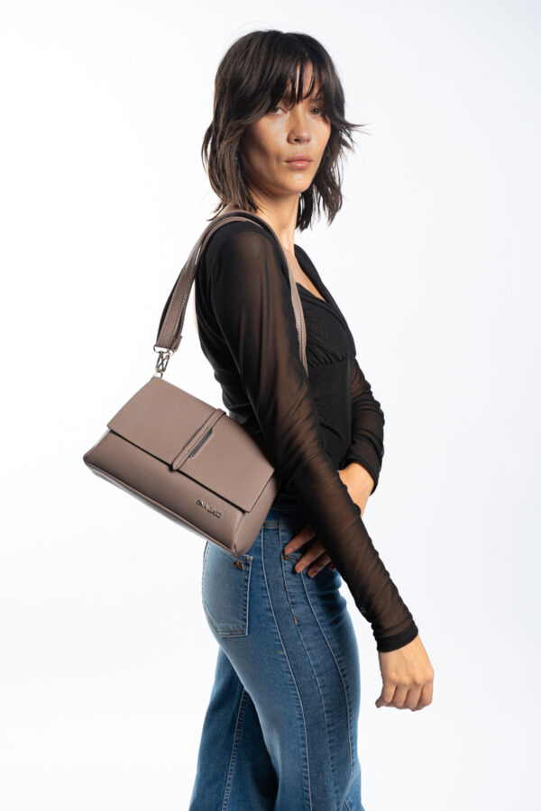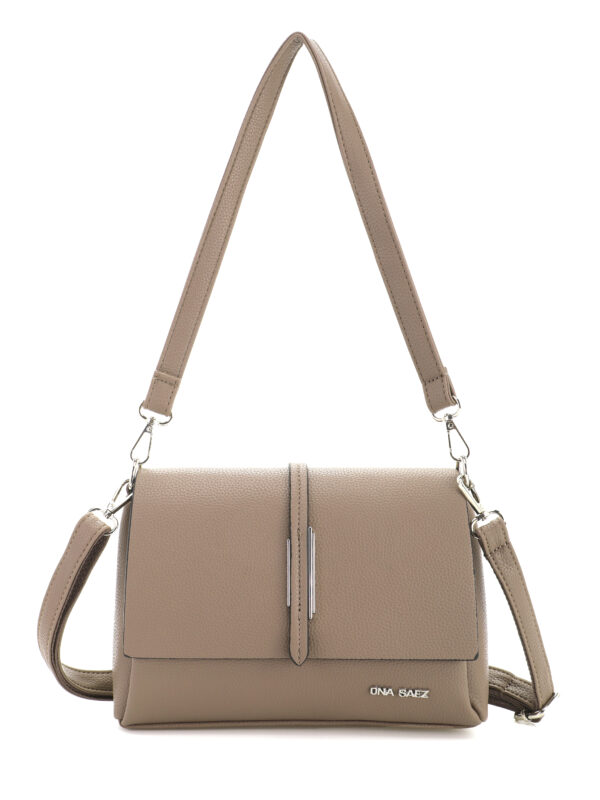 Cartera de tamaño mediano confeccionada en P U (simil cuero) color visón. Su diseño presenta un cuerpo estructurado con solapa y cierre de broche metálico al frente.