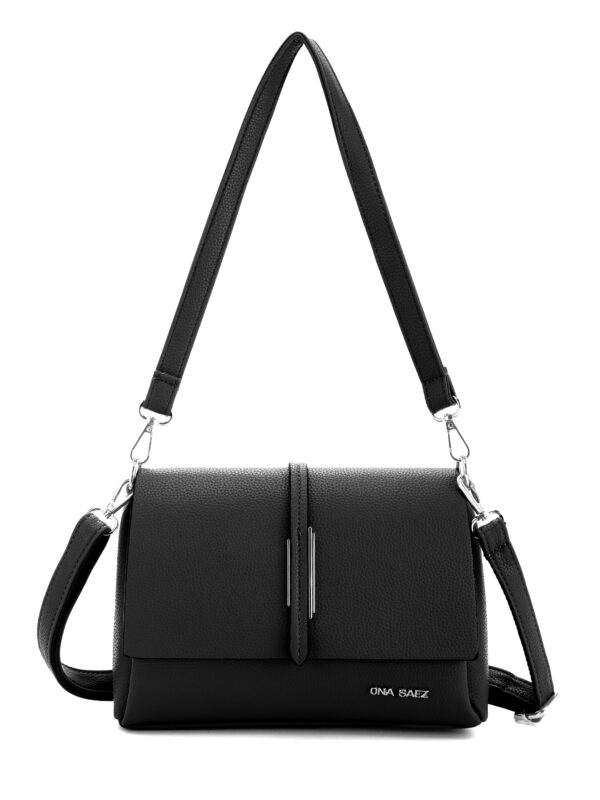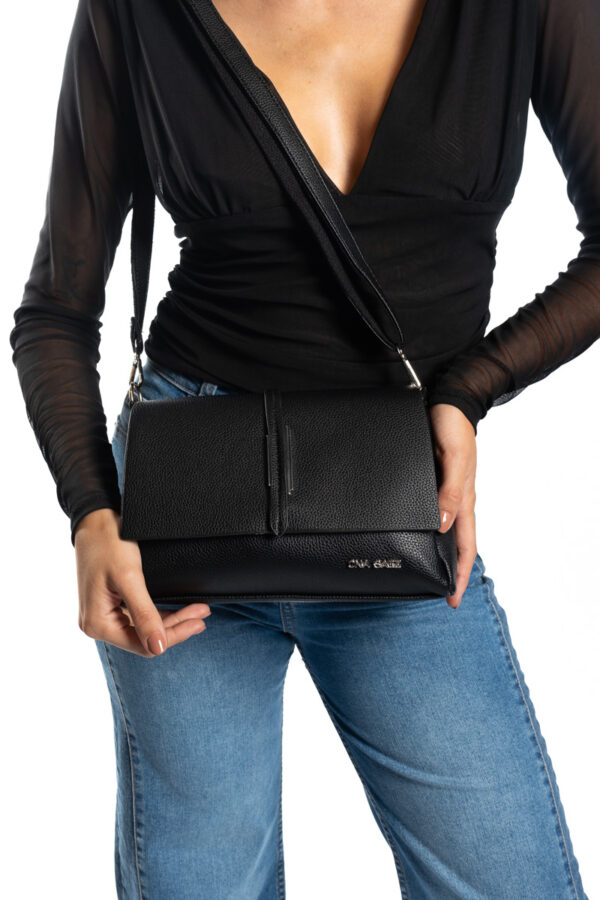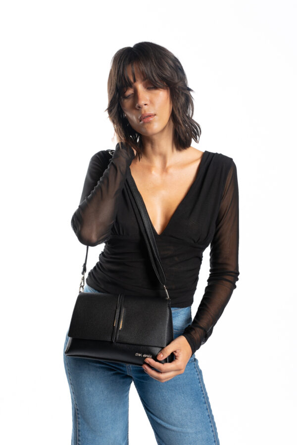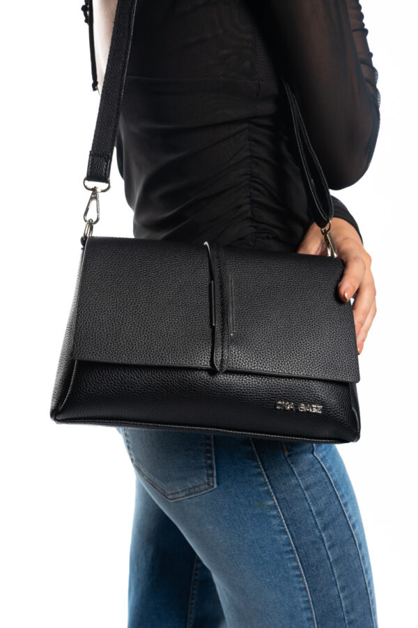Cartera de tamaño mediano confeccionada en P U (simil cuero) color negra. Su diseño presenta un cuerpo estructurado con solapa y cierre de broche metálico al frente.