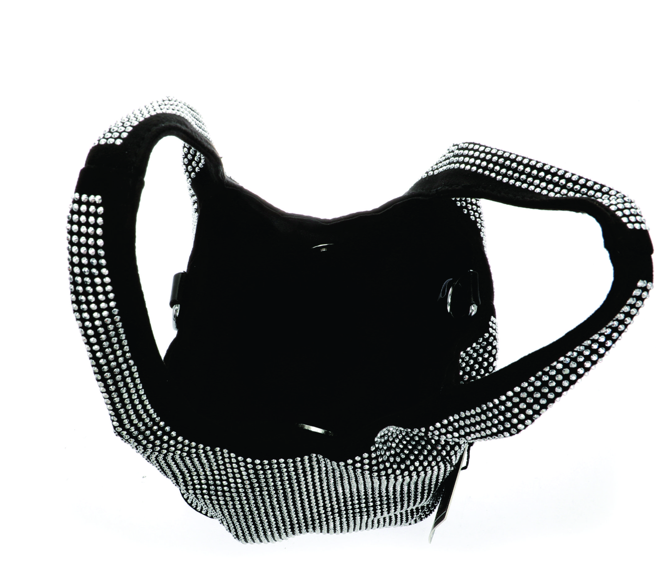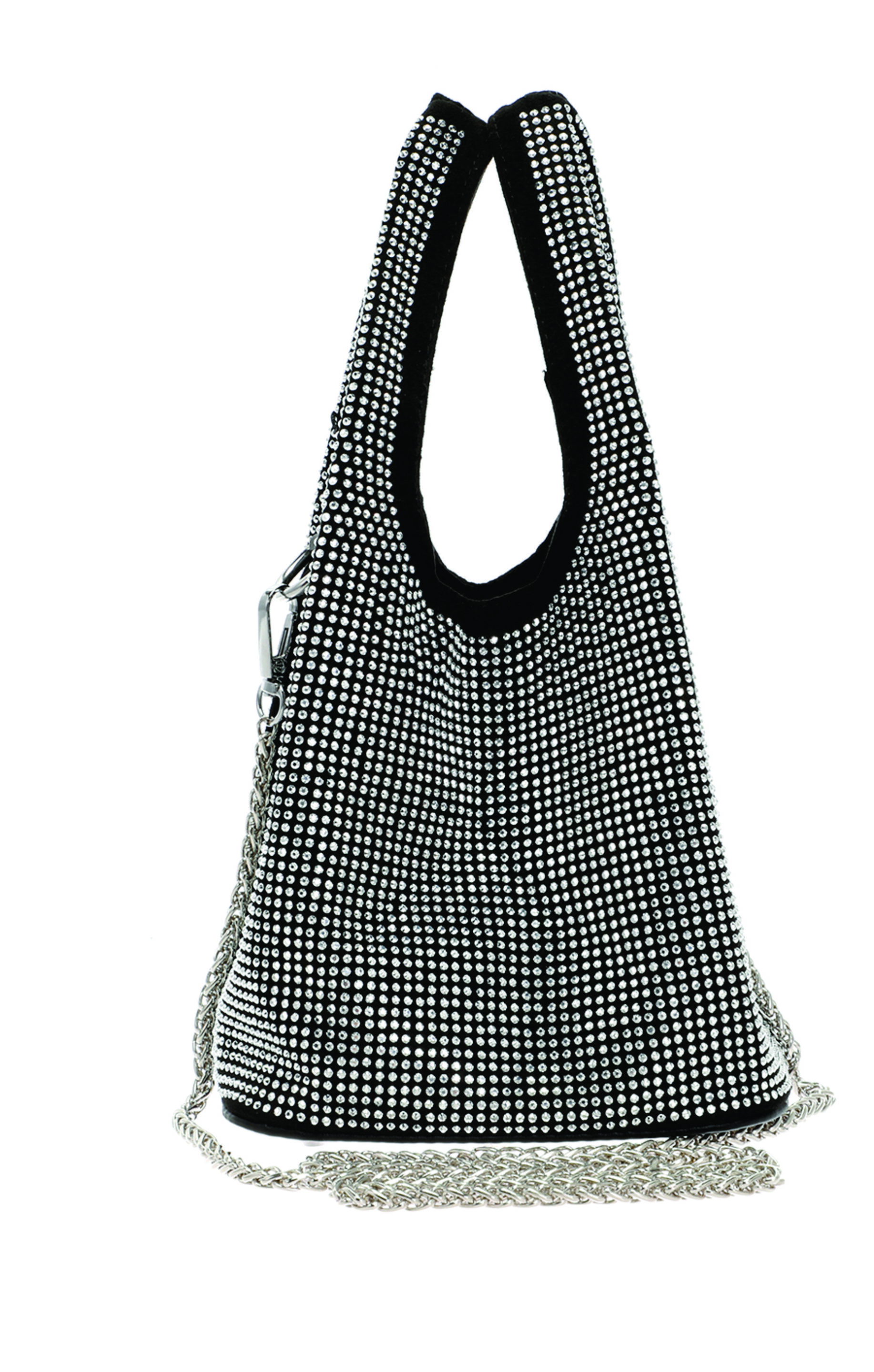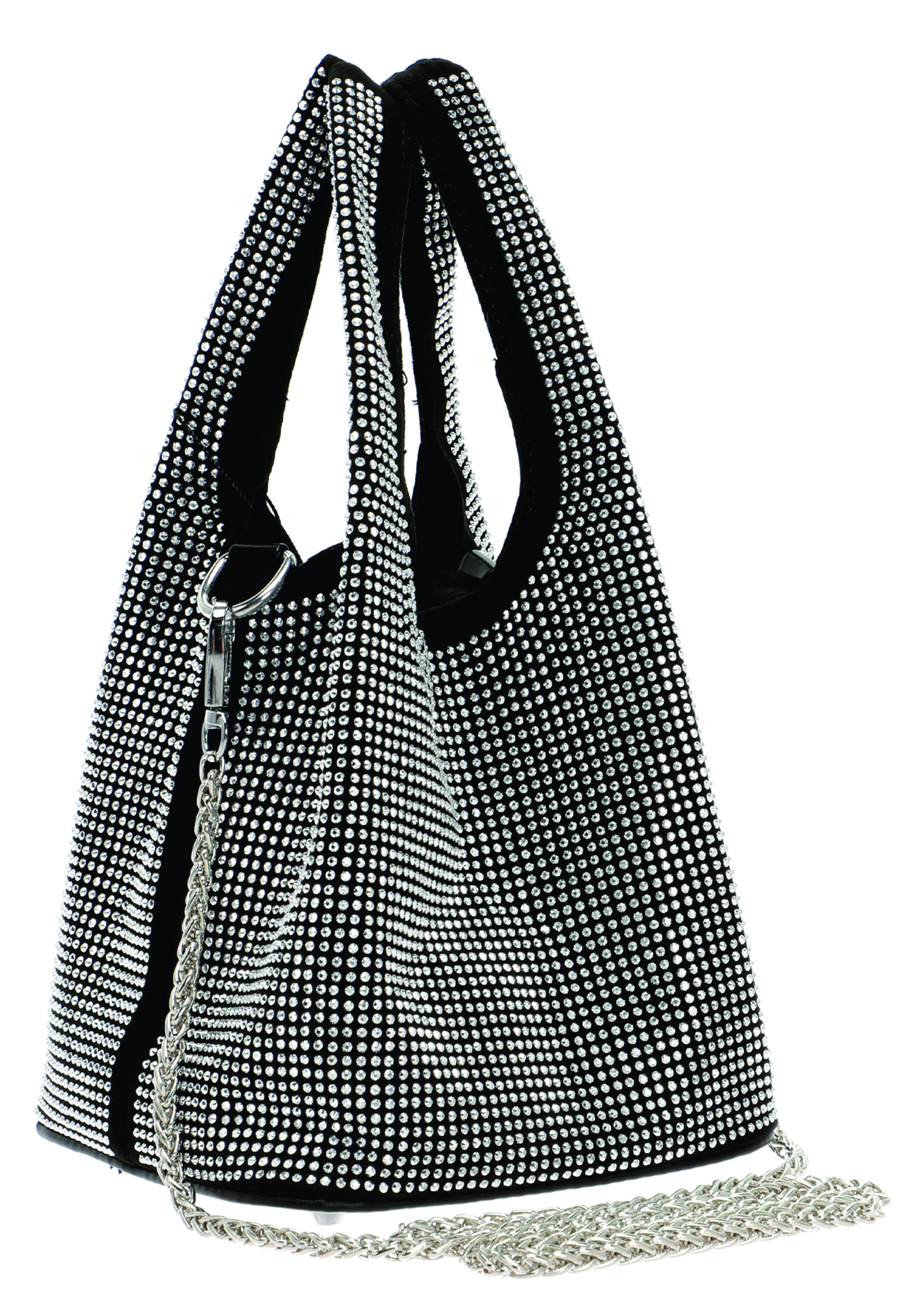 Cartera de noche estilo mini-tote, confeccionada en base textil reforzada y completamente recubierta en strass plateados que generan un brillo máximo. Su estructura semirrígida mantiene la forma, mientras que las manijas cortas permiten llevarla cómodamente en la mano con un look elegante y moderno.