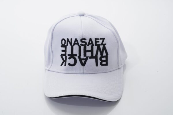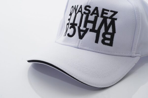 Gorra de gabardina 100% algodón, blanca, con visera curva y bordado 3D en contraste. Diseño moderno y sofisticado, combinada con chaqueta de cuero para un look urbano.
