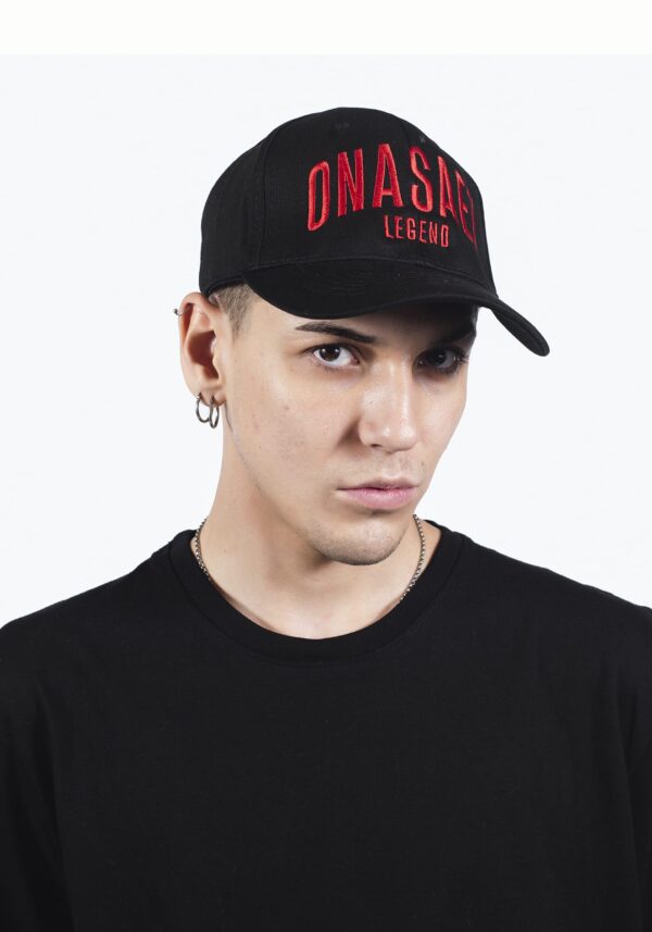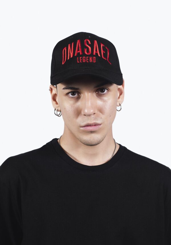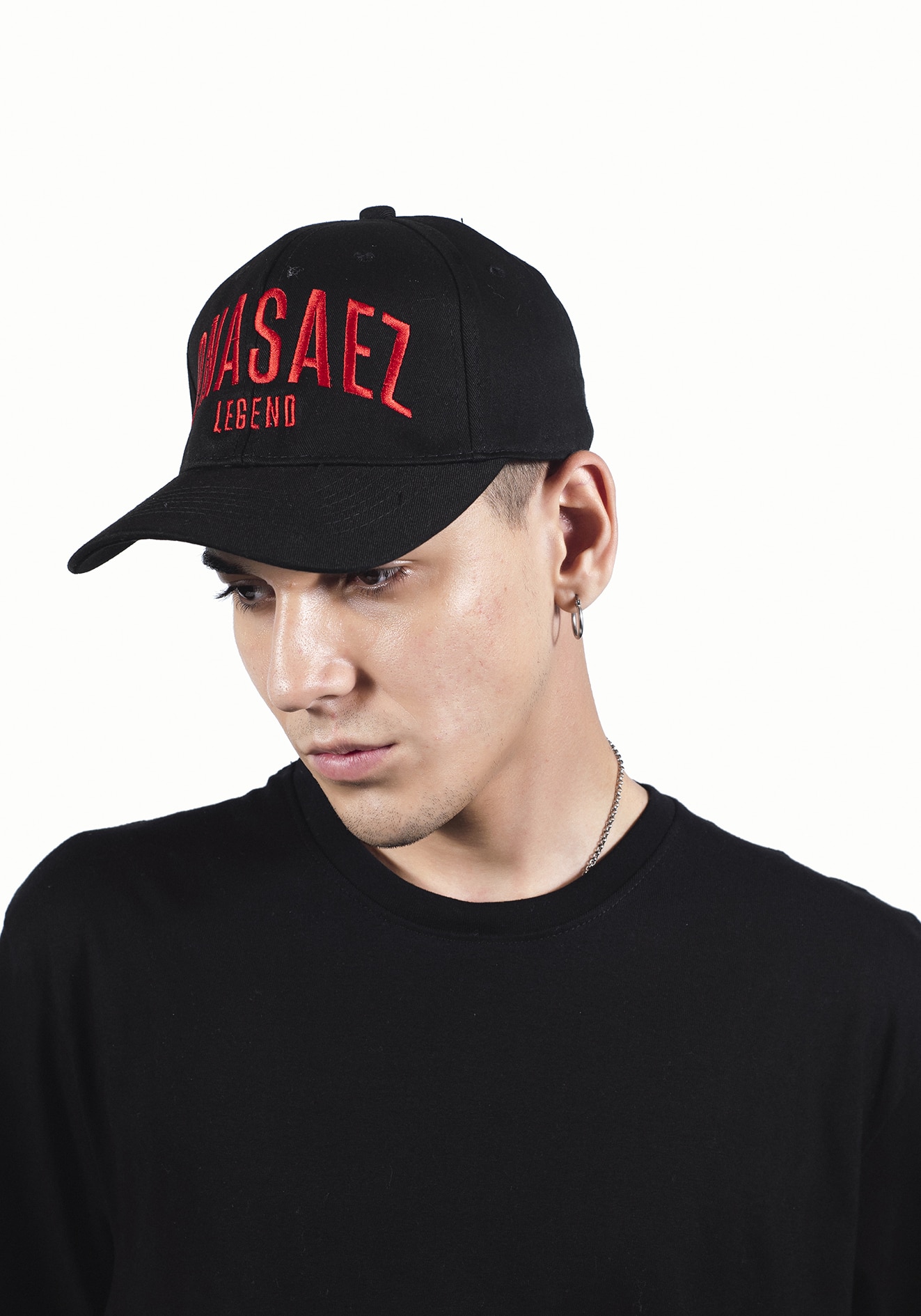 Gorra de gabardina 100% algodón, negra, con visera curva y bordado 3D en contraste. Diseño moderno y sofisticado, combinada con chaqueta de cuero para un look urbano.