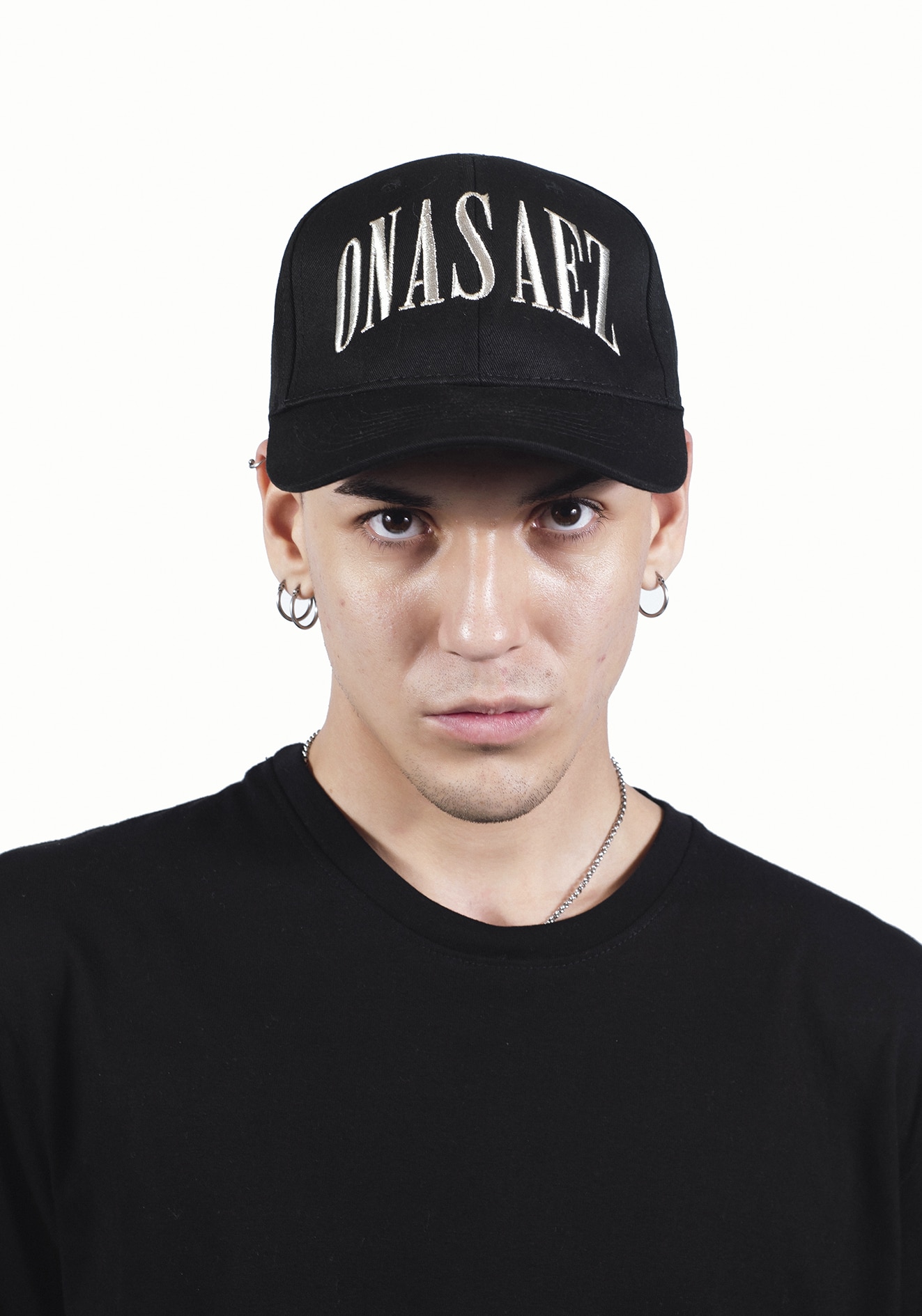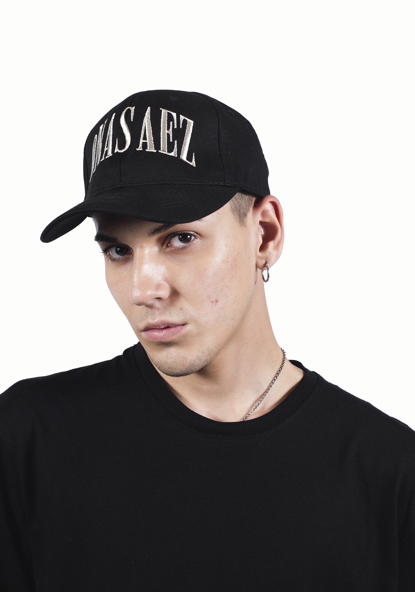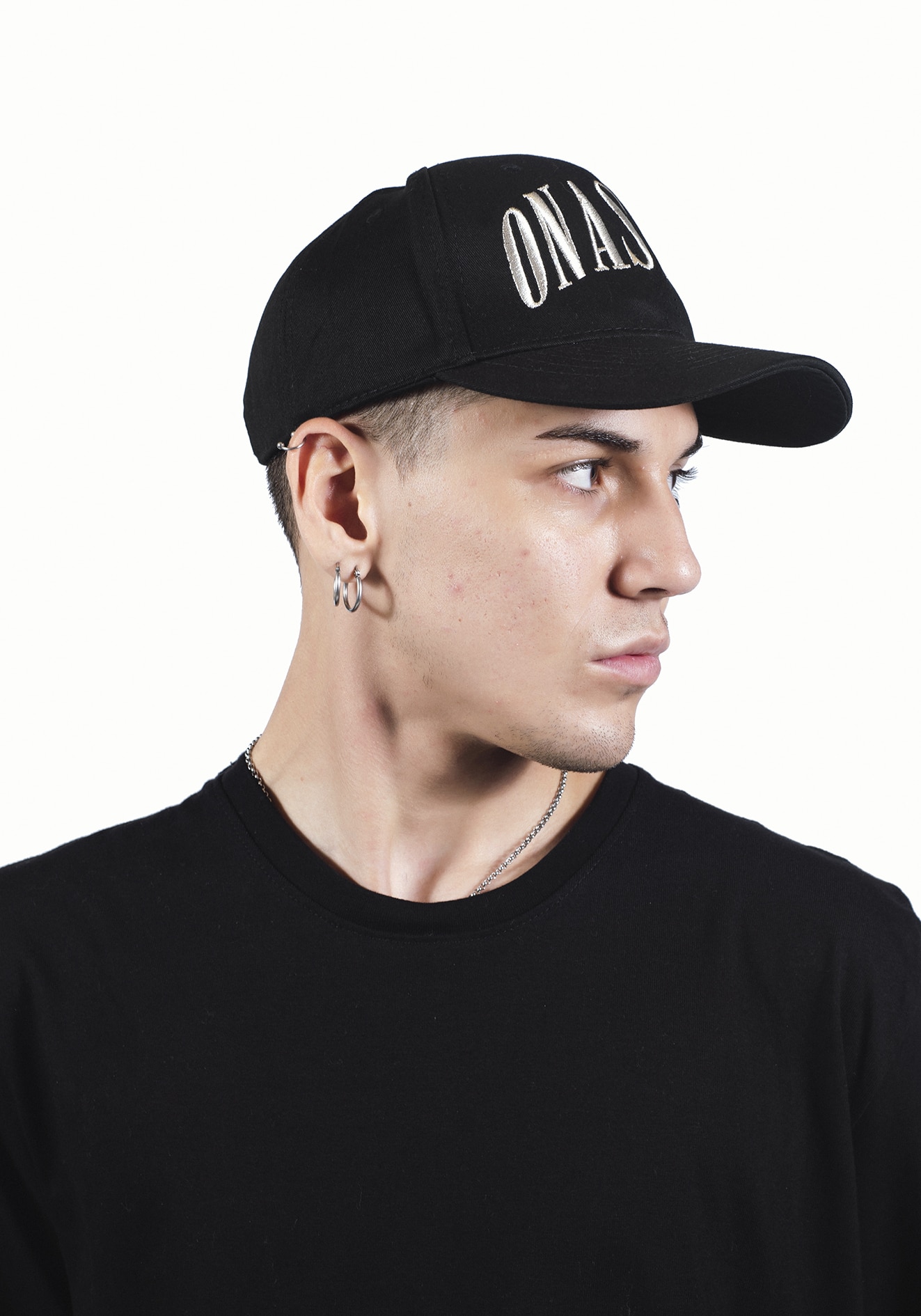Gorra de gabardina 100% algodón, negra, con visera curva y bordado 3D en contraste. Diseño moderno y sofisticado, combinada con chaqueta de cuero para un look urbano.