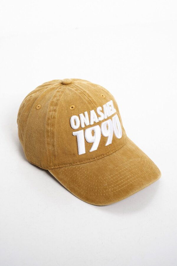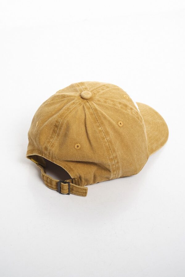 Gorra de gabardina 100% algodón Diseño vintage gastado color amarillo, con bordado en relieve 3D del logo a contra tono. Diseño estructurado, visera curva y ajuste trasero para un calce cómodo y versátil.