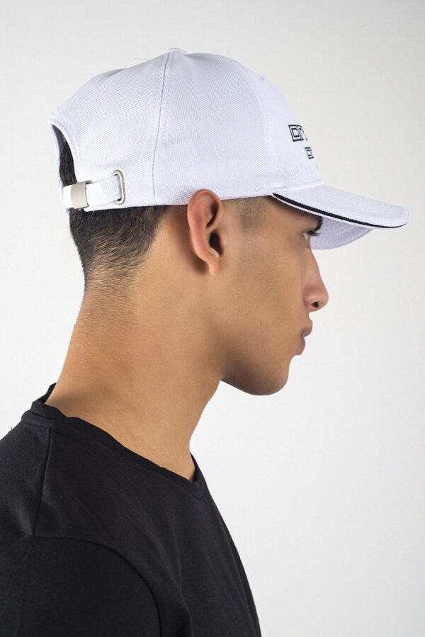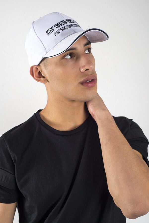 Gorra de gabardina 100% algodón, blanca, con visera curva y bordado 3D en contraste. Diseño moderno y sofisticado, combinada con chaqueta de cuero para un look urbano.