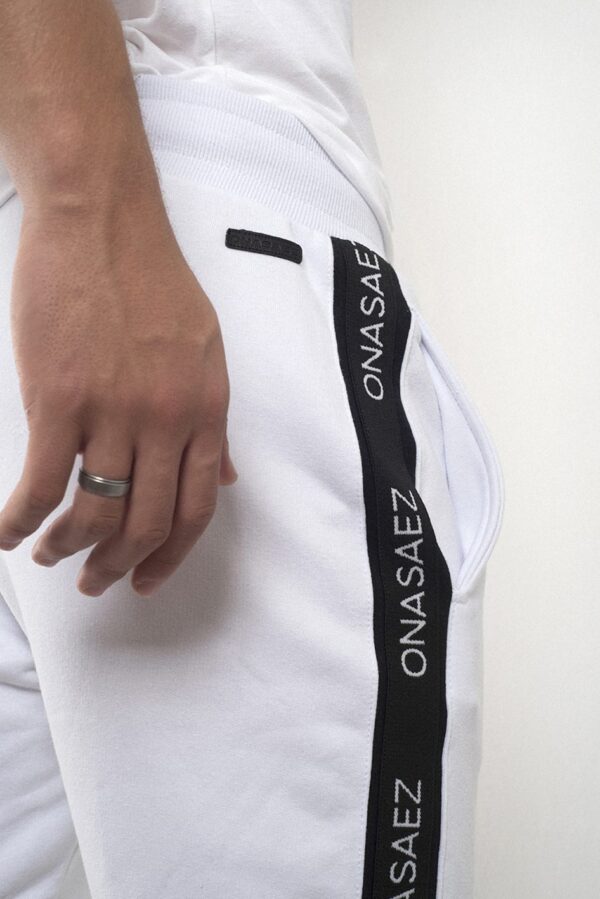 Detalle de recorte a contra tono y cinta de marca bordada a los costados.