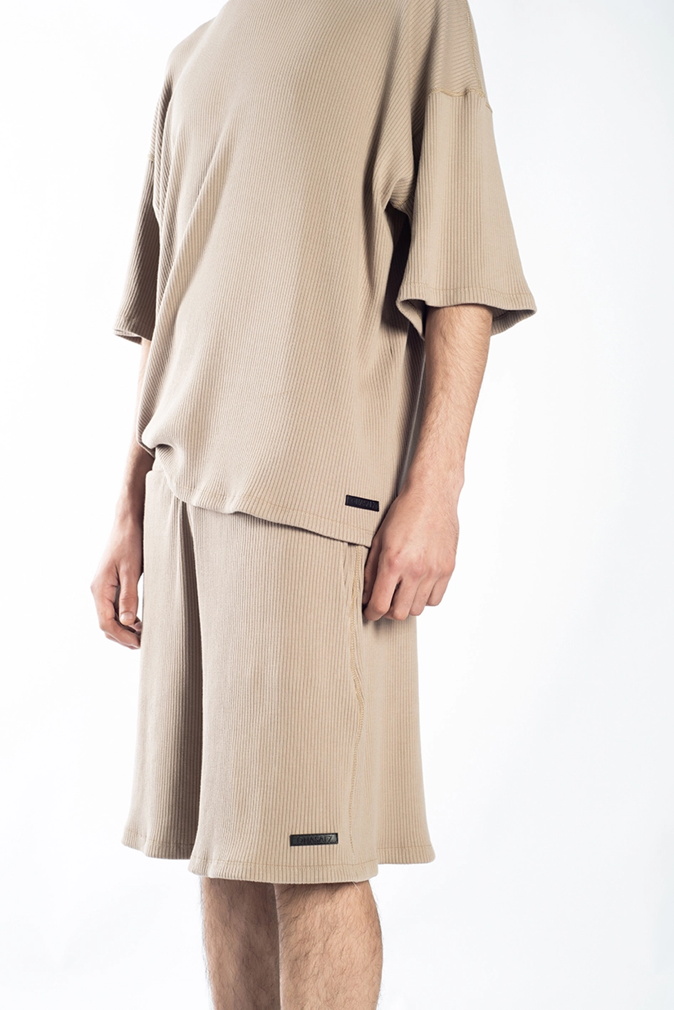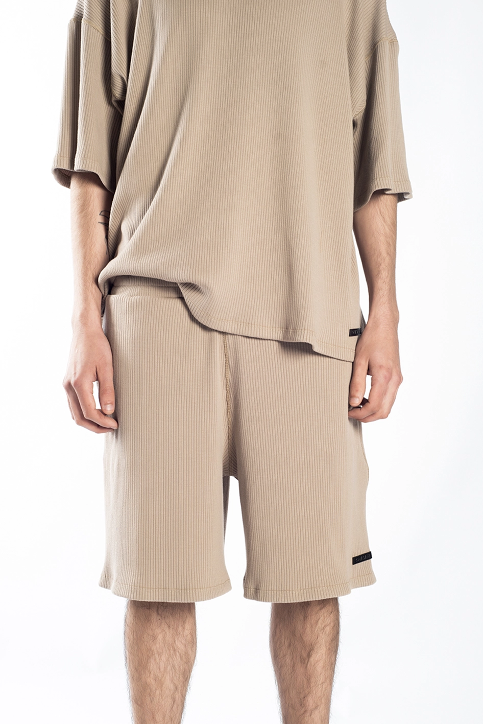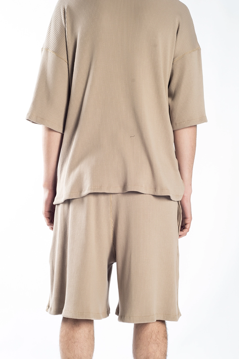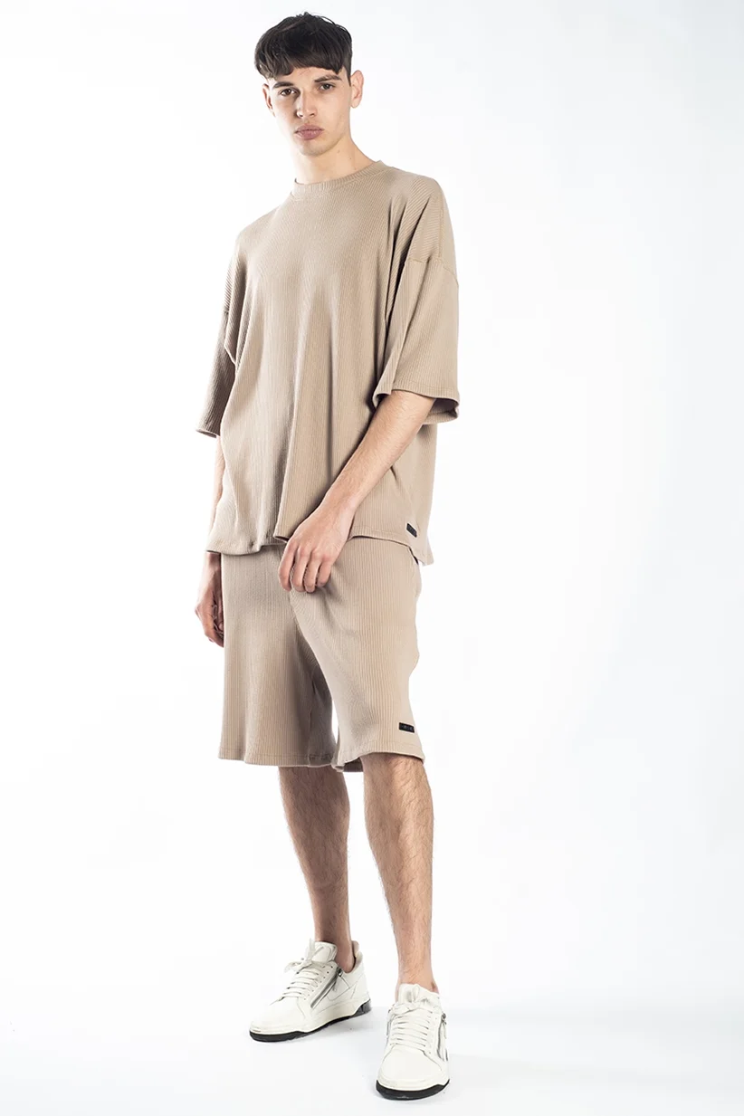 Bermuda oversize color arena, confeccionada en morley, que con su característico acanalado elástico aporta flexibilidad y textura a la prenda.