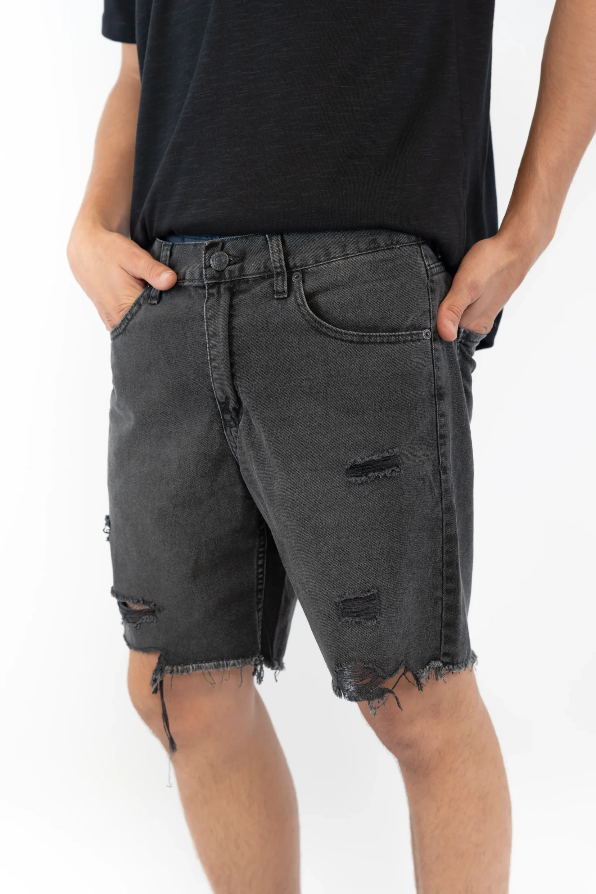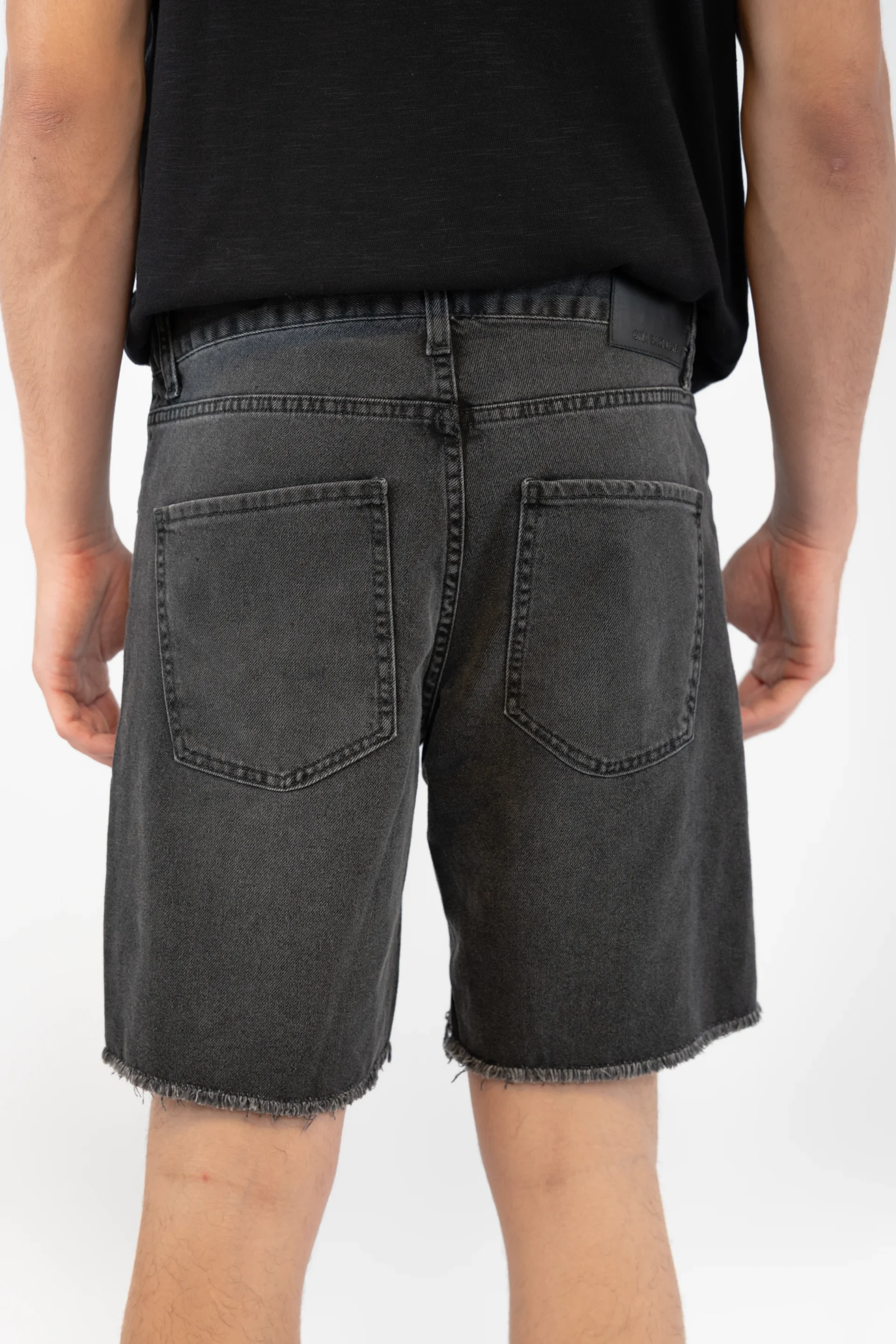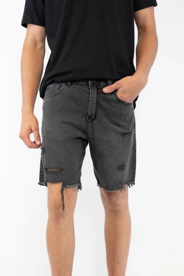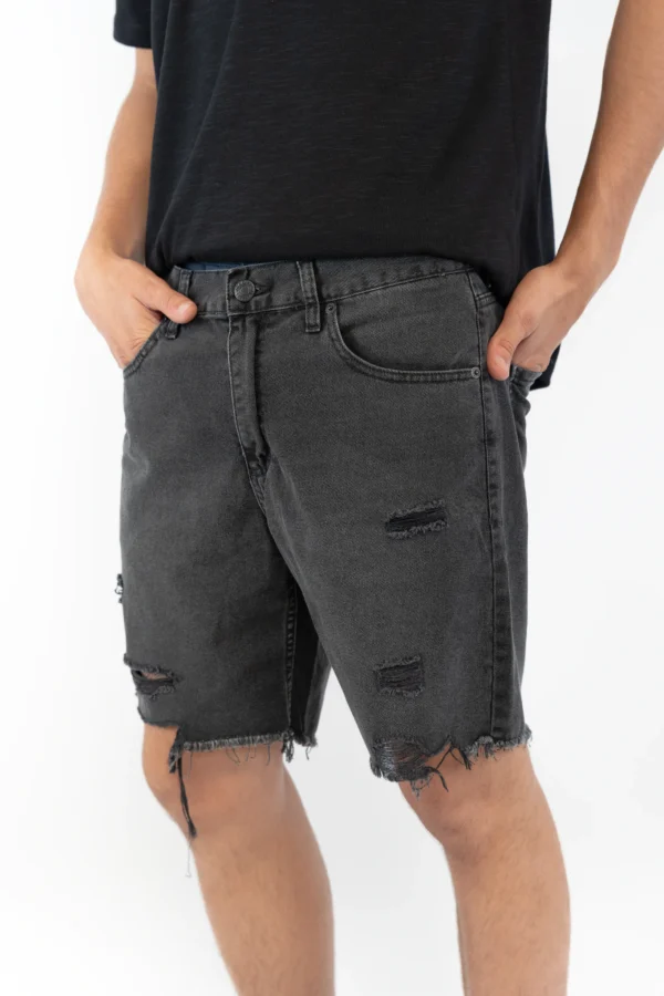 Bermuda de tiro medio y corte loose, fabricada en denim rígido 100% algodón. Presenta un lavado negro gastado con efectos localizados para un look desgastado. En la parte delantera, tiene roturas hiladas que aportan un estilo más urbano. El ruedo desflecado le da un acabado sin costuras, manteniendo el toque casual.