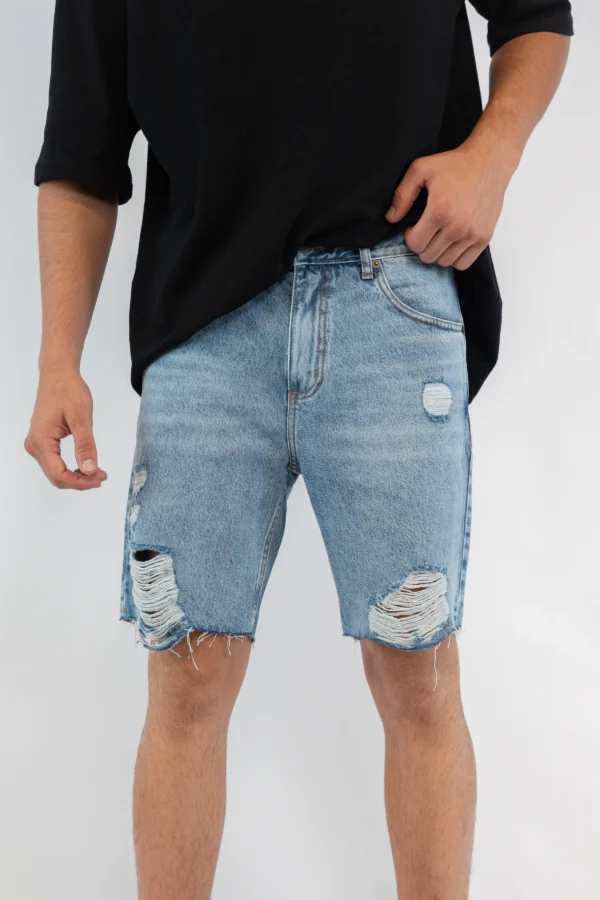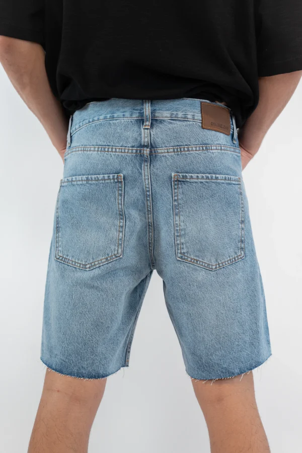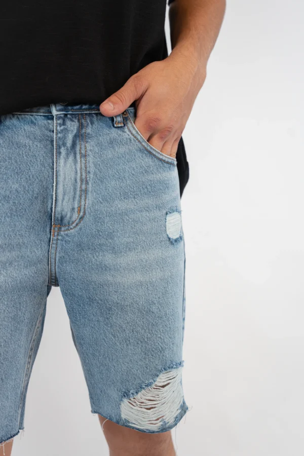 Bermuda de tiro medio y calce loose, confeccionada en denim rígido 100% algodón, ofreciendo un ajuste cómodo y relajado. El lavado celeste le da un aspecto fresco y versátil, mientras que los detalles de roturas hiladas, ubicadas tanto en la parte delantera como trasera, aportan un toque de estilo desgastado y moderno.