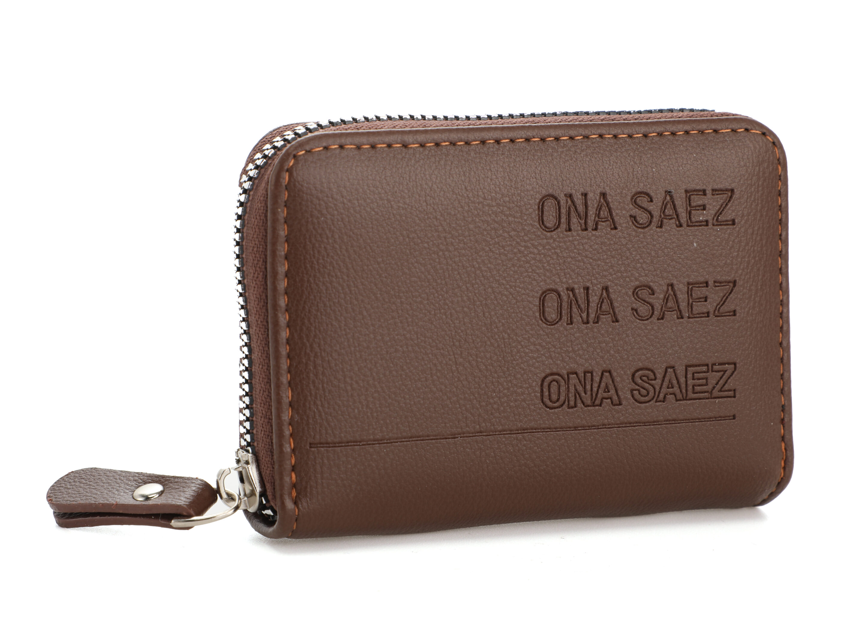 Cuenta con múltiples compartimentos internos y logo “Ona Saez” grabado en relieve. Ideal para organizar tarjetas con estilo.
