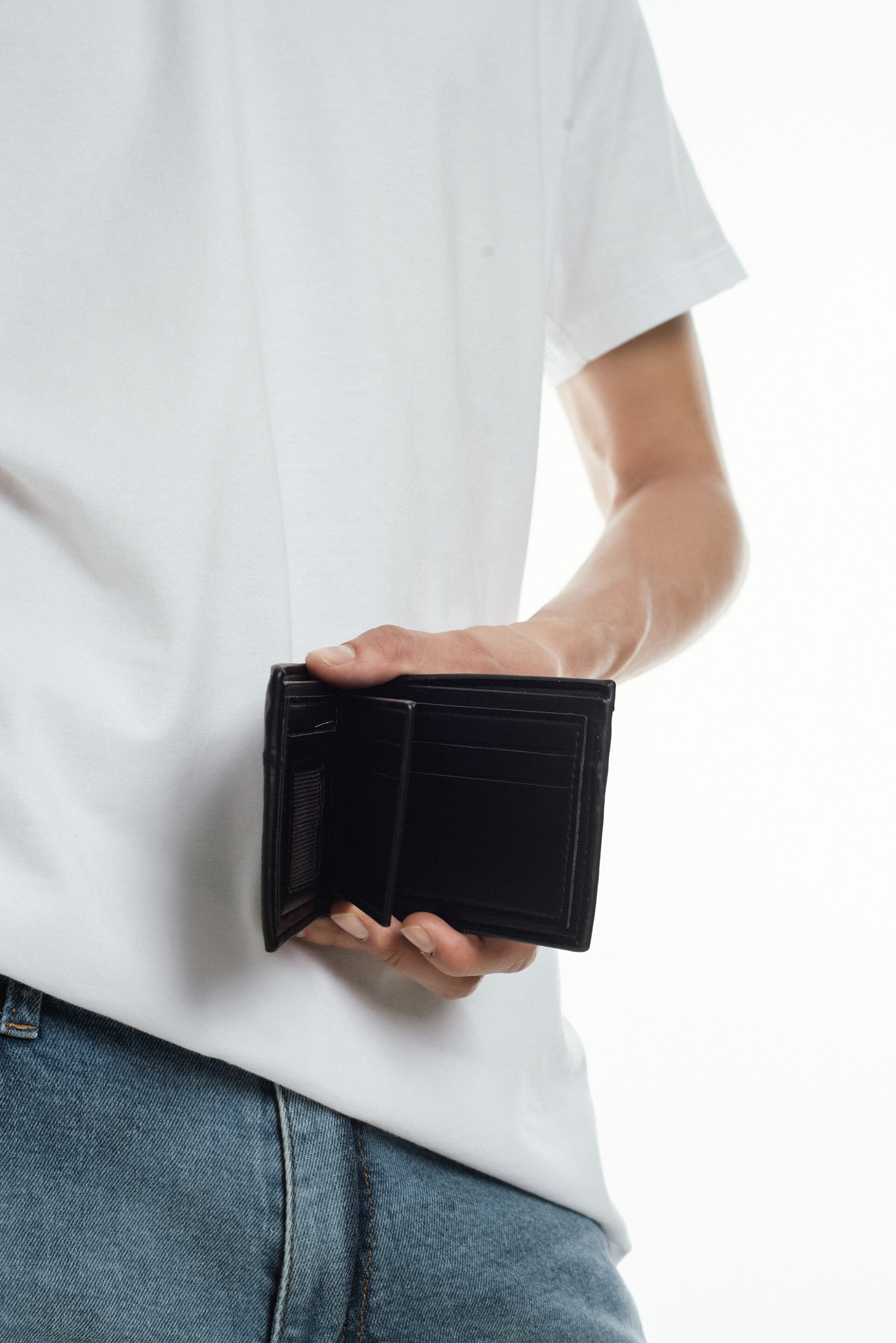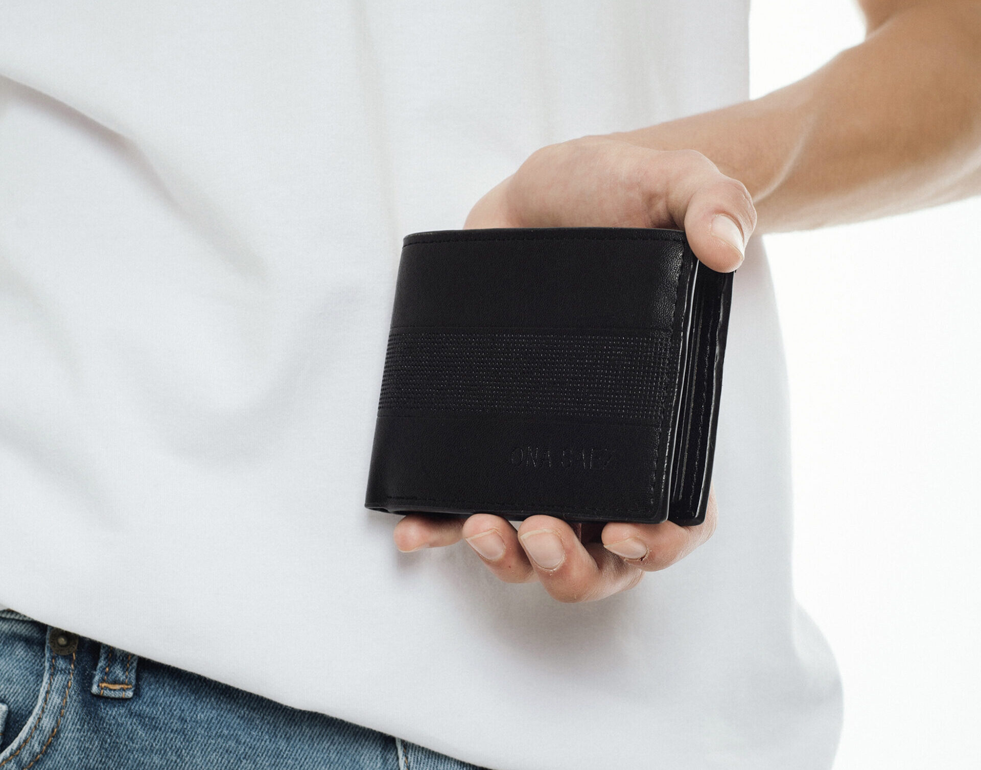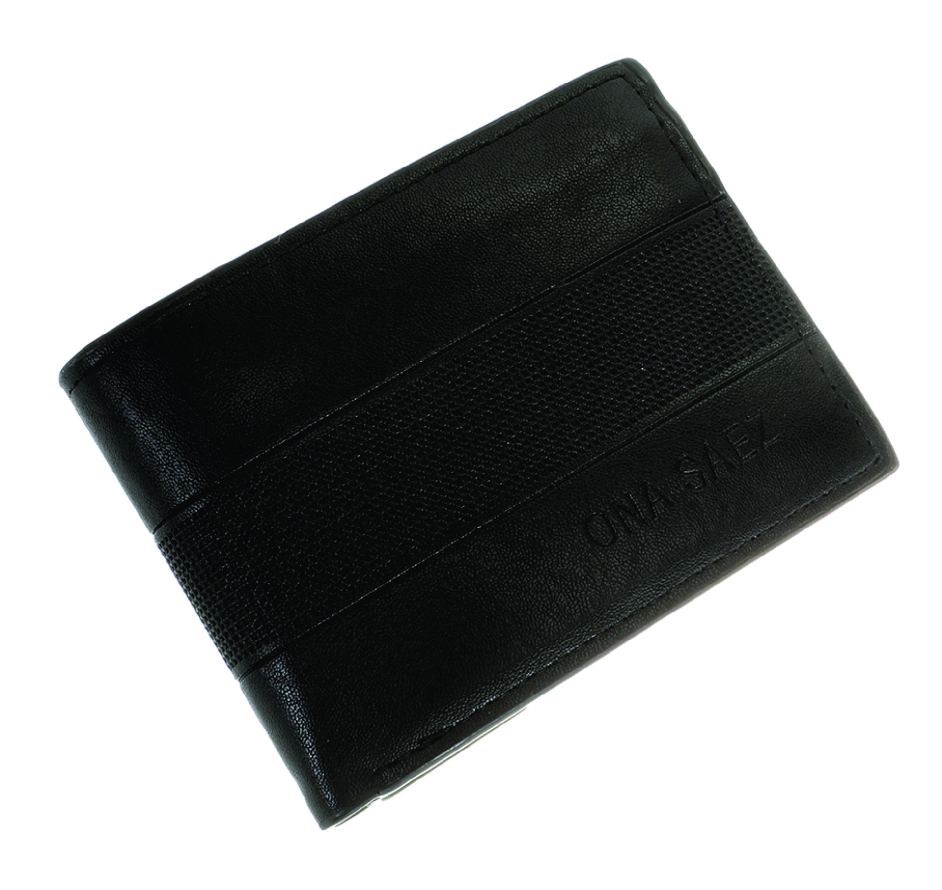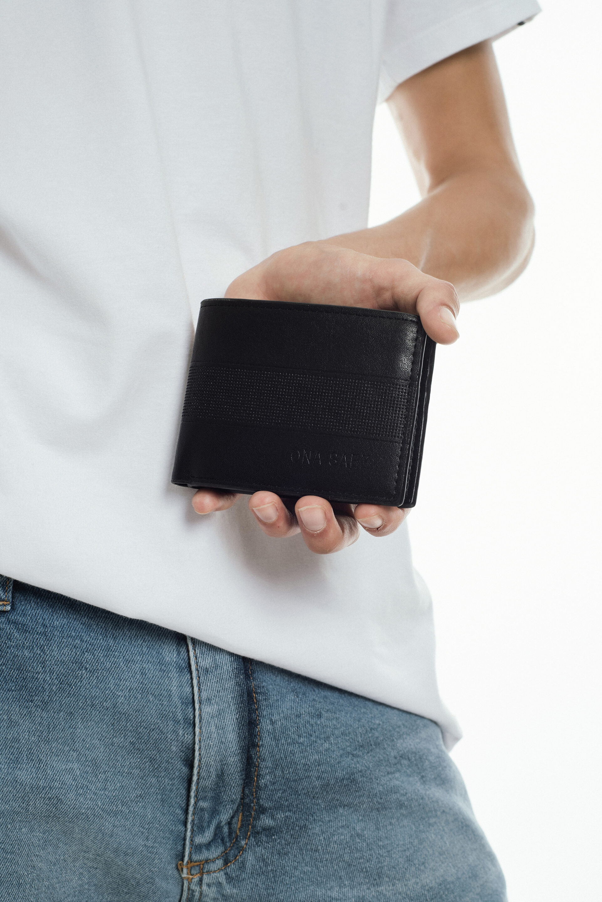 Billetera en PU negro con combinación de textura lisa y trama central, y logo de marca grabado en el frente.