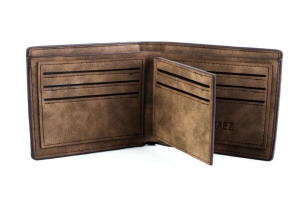 Billetera confeccionada en pu (simil cuero) color suela engrasada, con grabado de logo de marca en el frente.