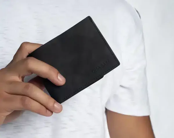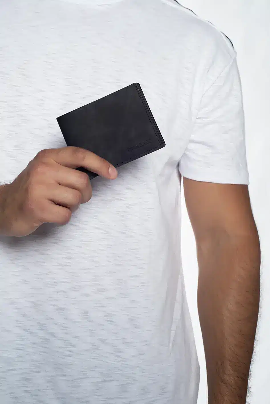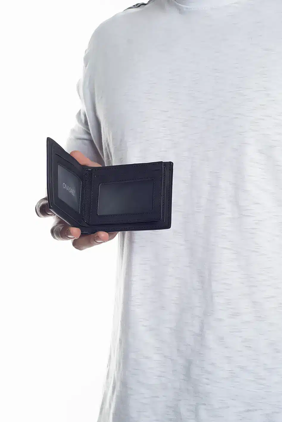 Billetera confeccionada en pu (simil cuero) color negra engrasada, con grabado de logo de marca en el frente.