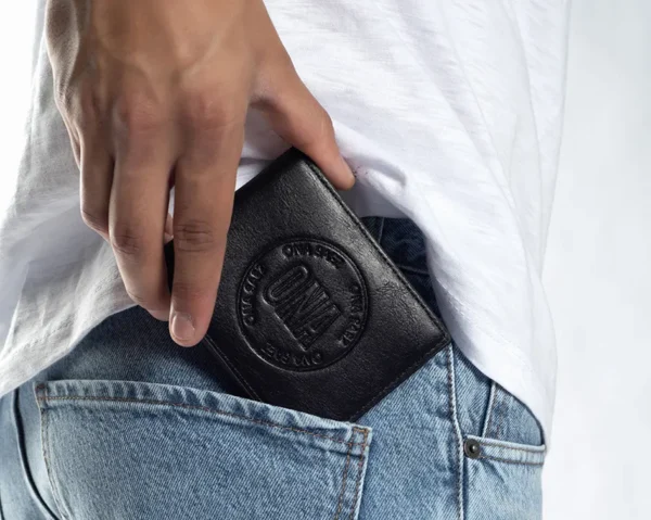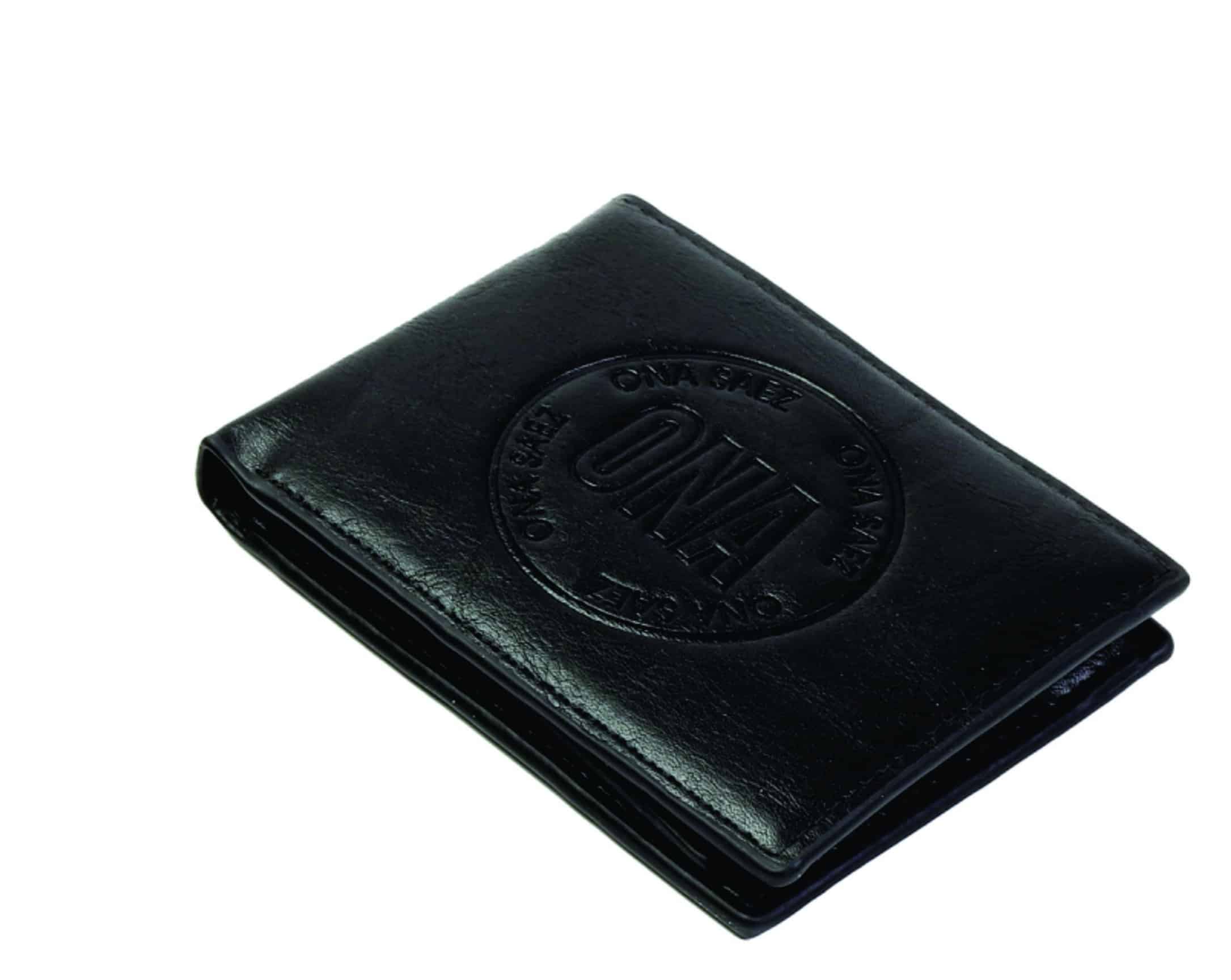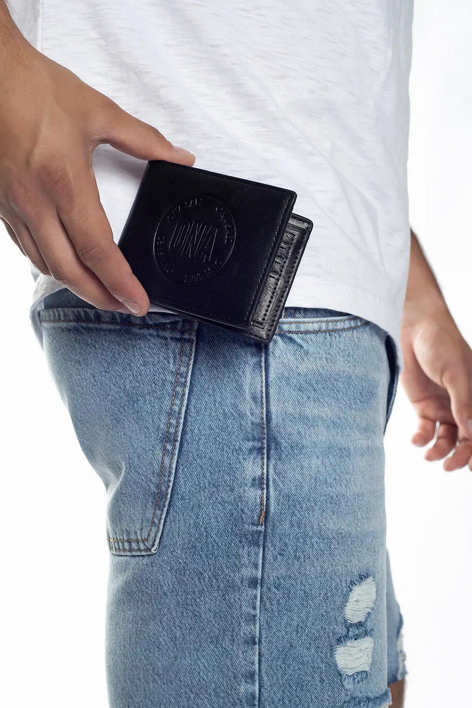 Billetera confeccionada en pu (simil cuero) color negra, con grabado de logo de marca en el frente.