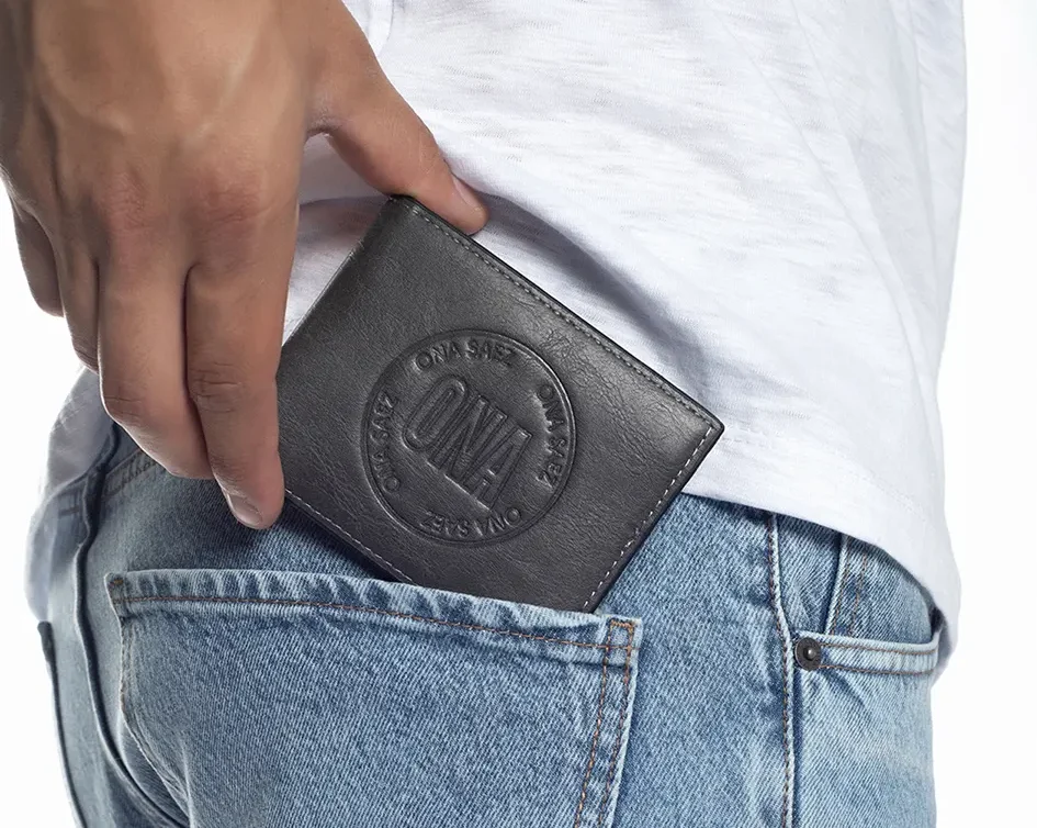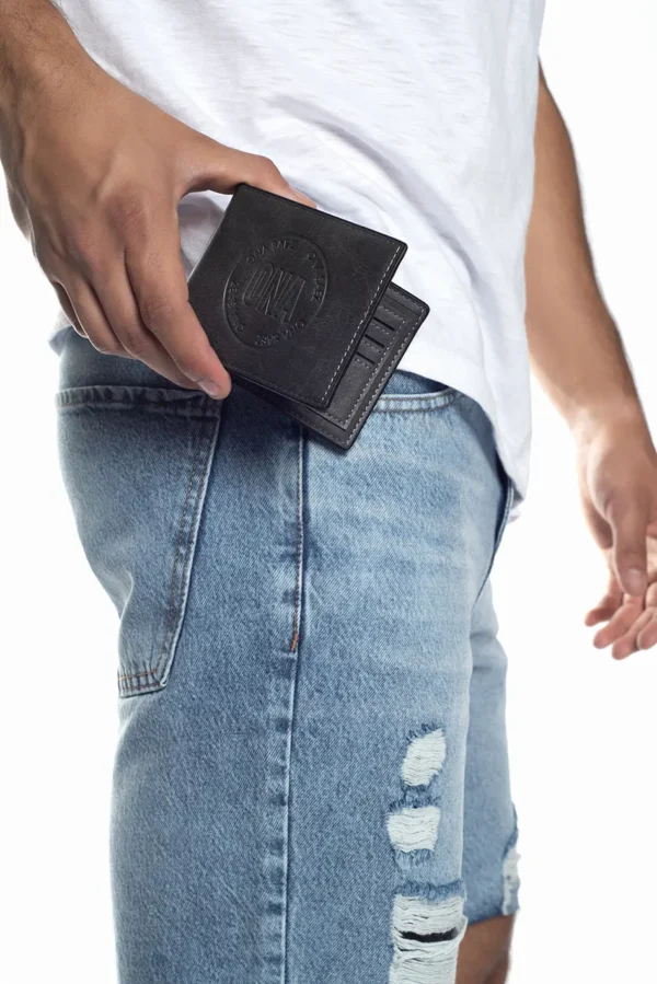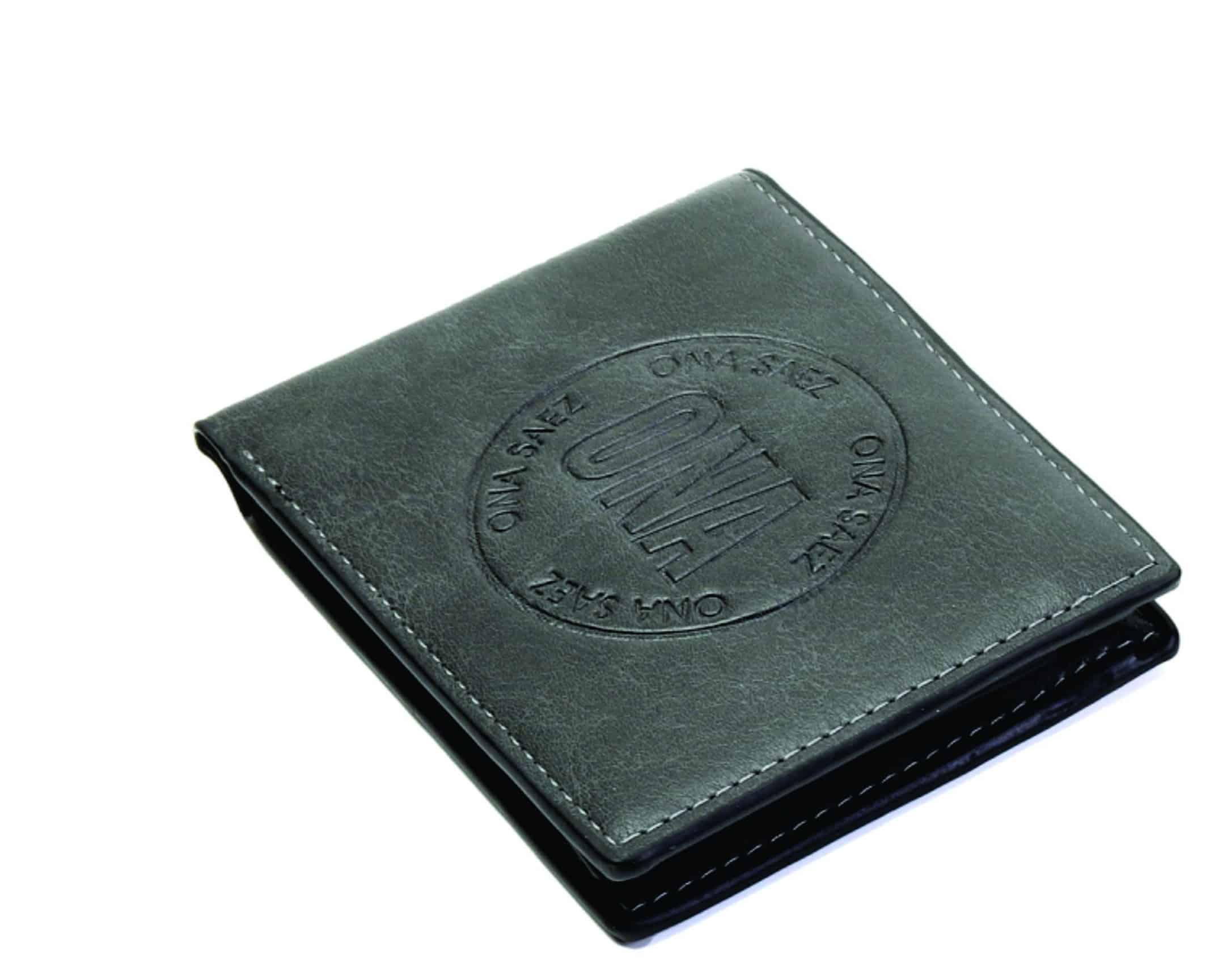 Billetera confeccionada en pu (simil cuero) color gris, con grabado de logo de marca en el frente.