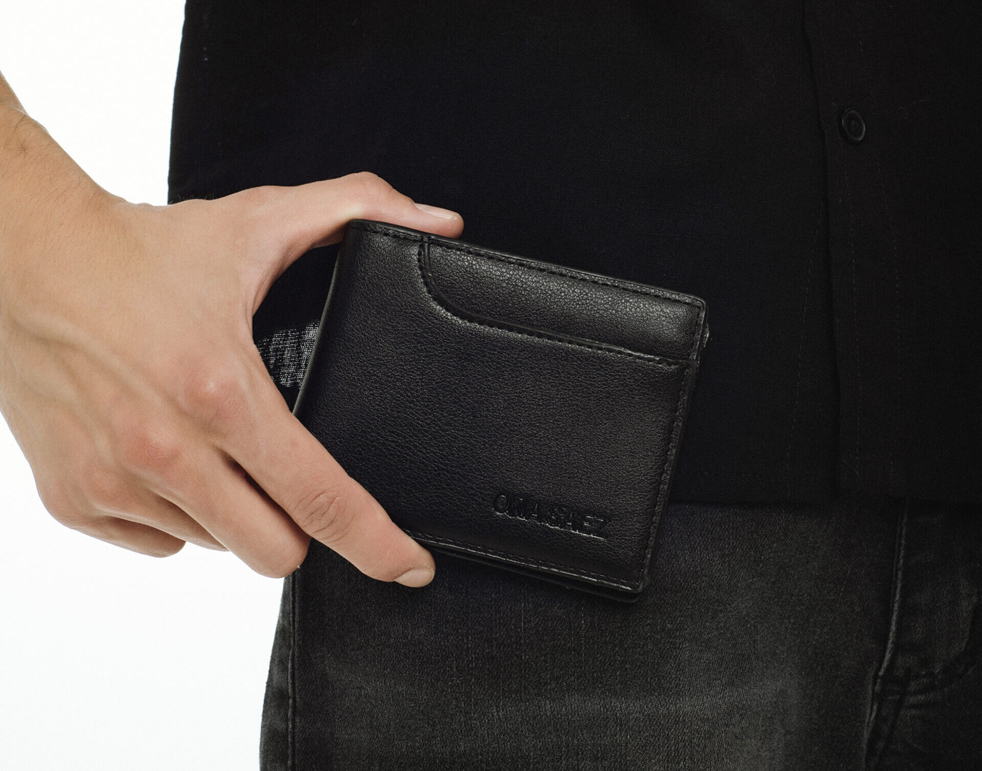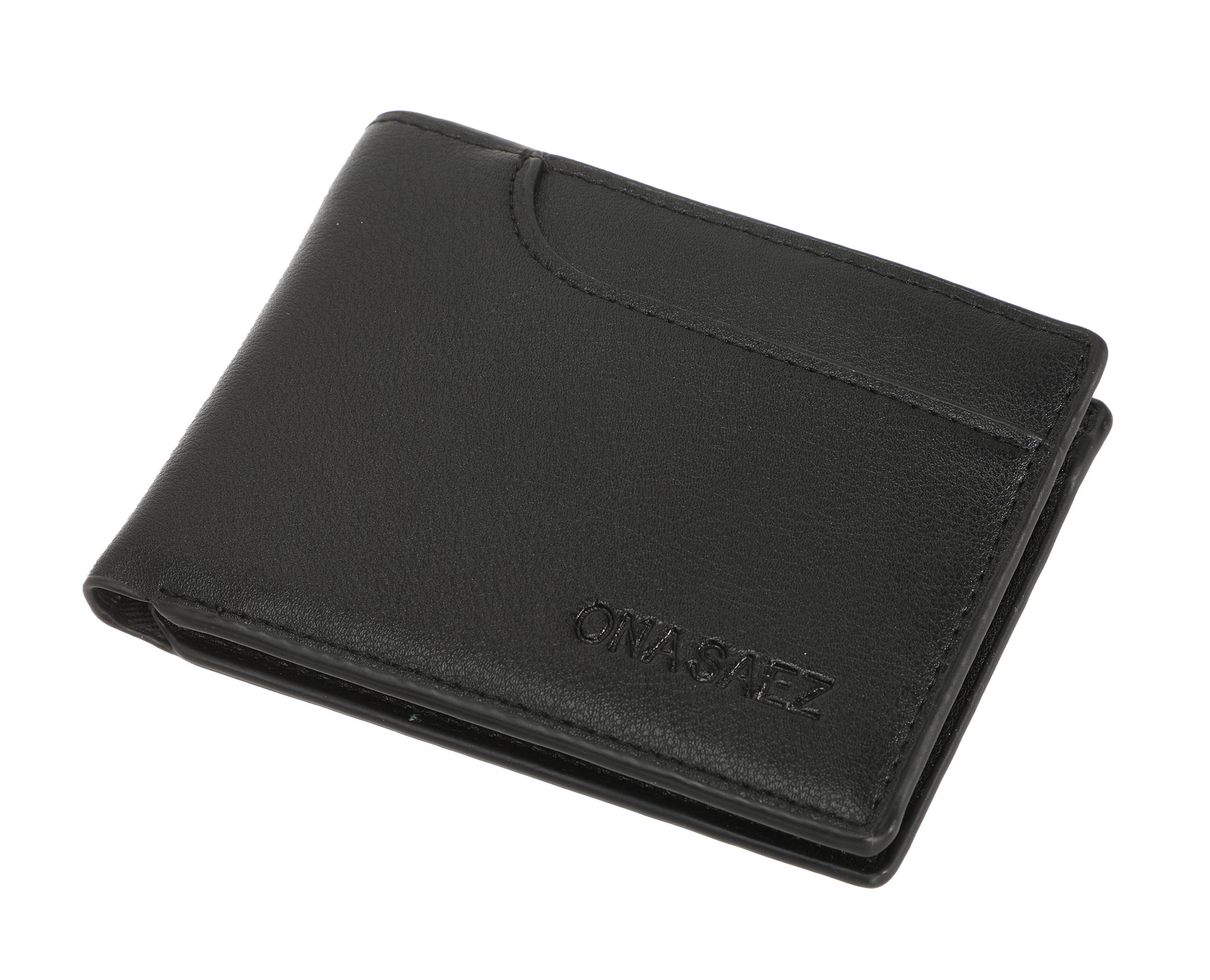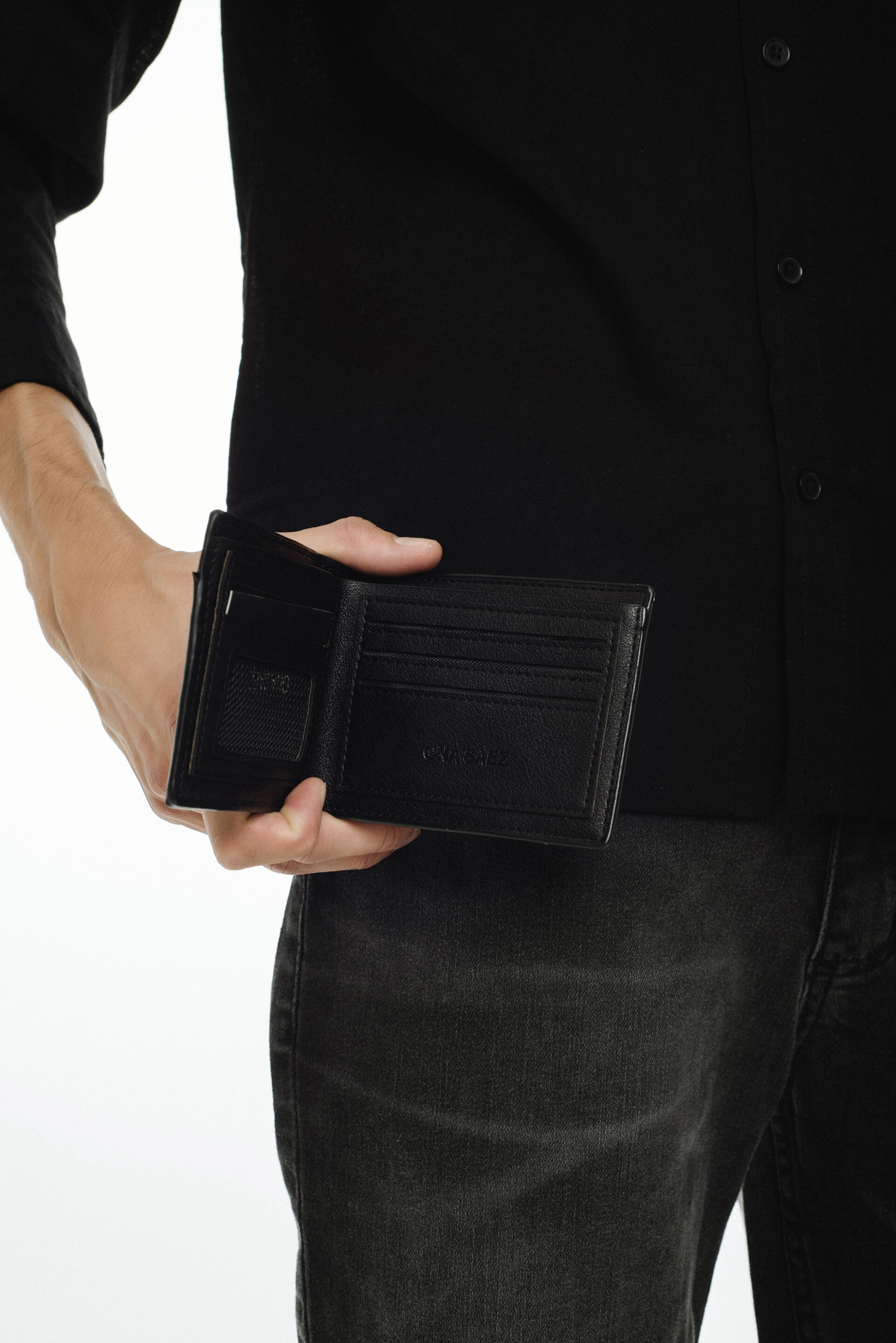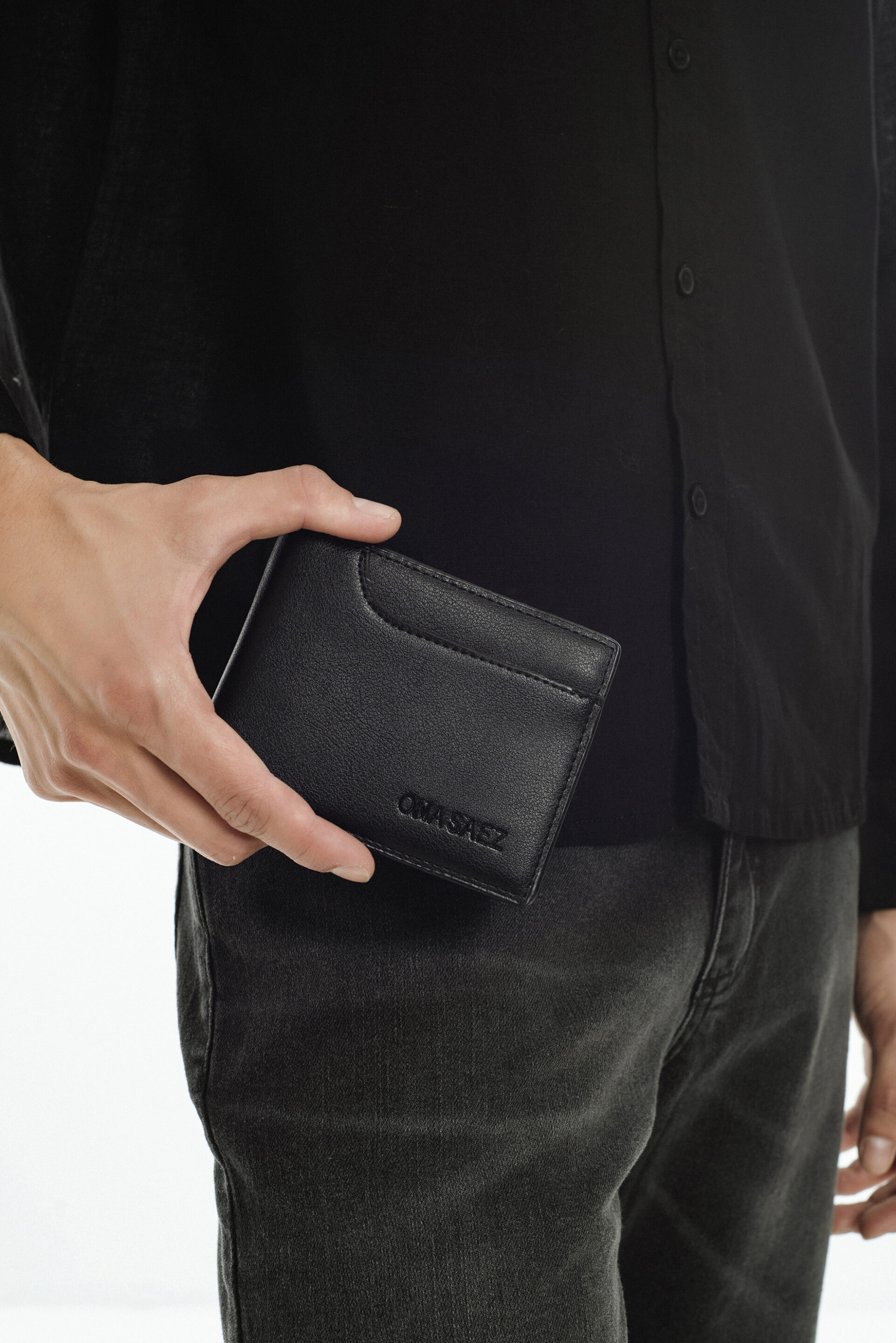 Billetera confeccionada en PU negro, de acabado liso y diseño minimalista. Presenta logo de marca grabado en relieve en el frente y un recorte curvo que aporta un detalle moderno y distintivo.