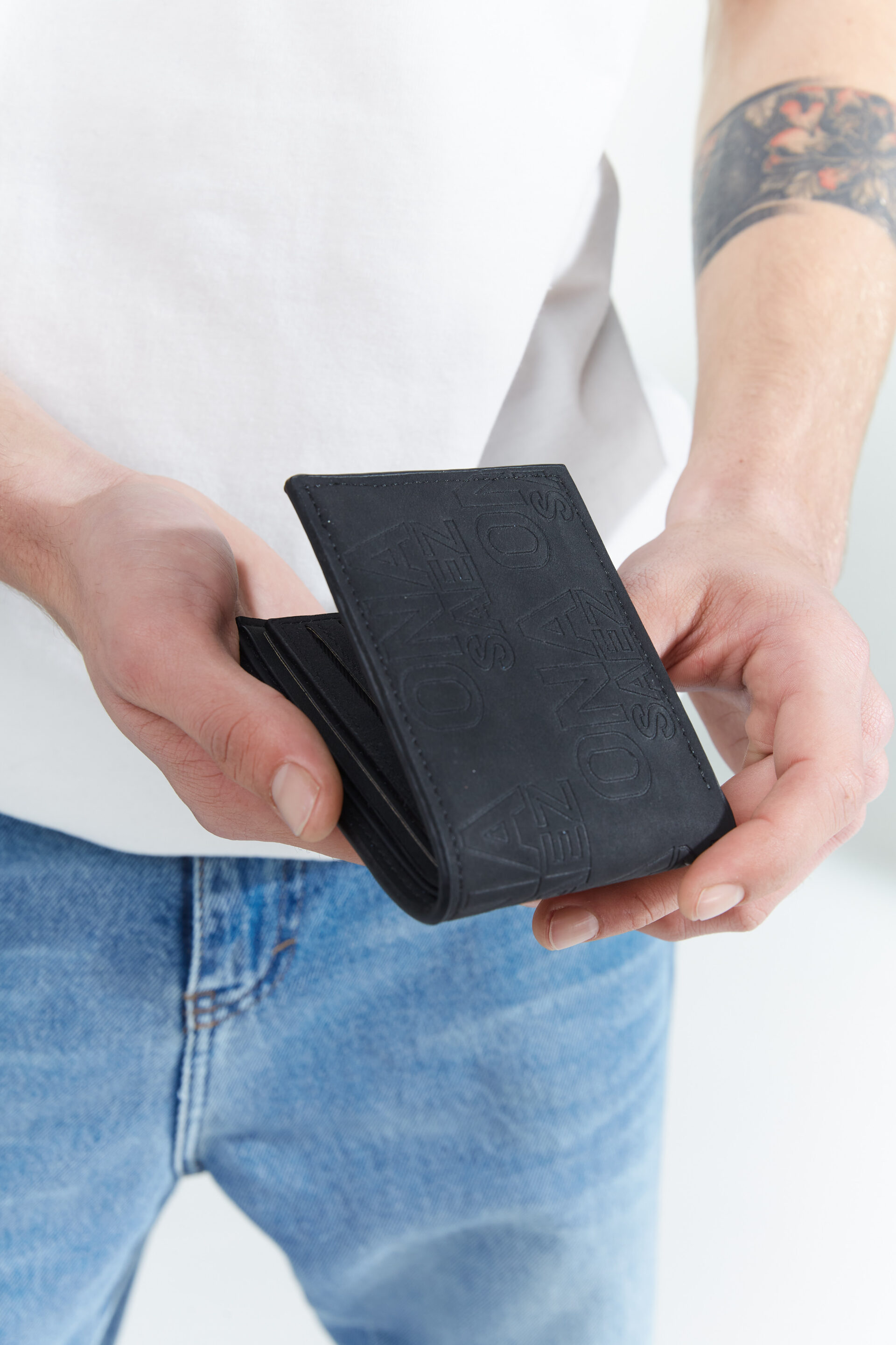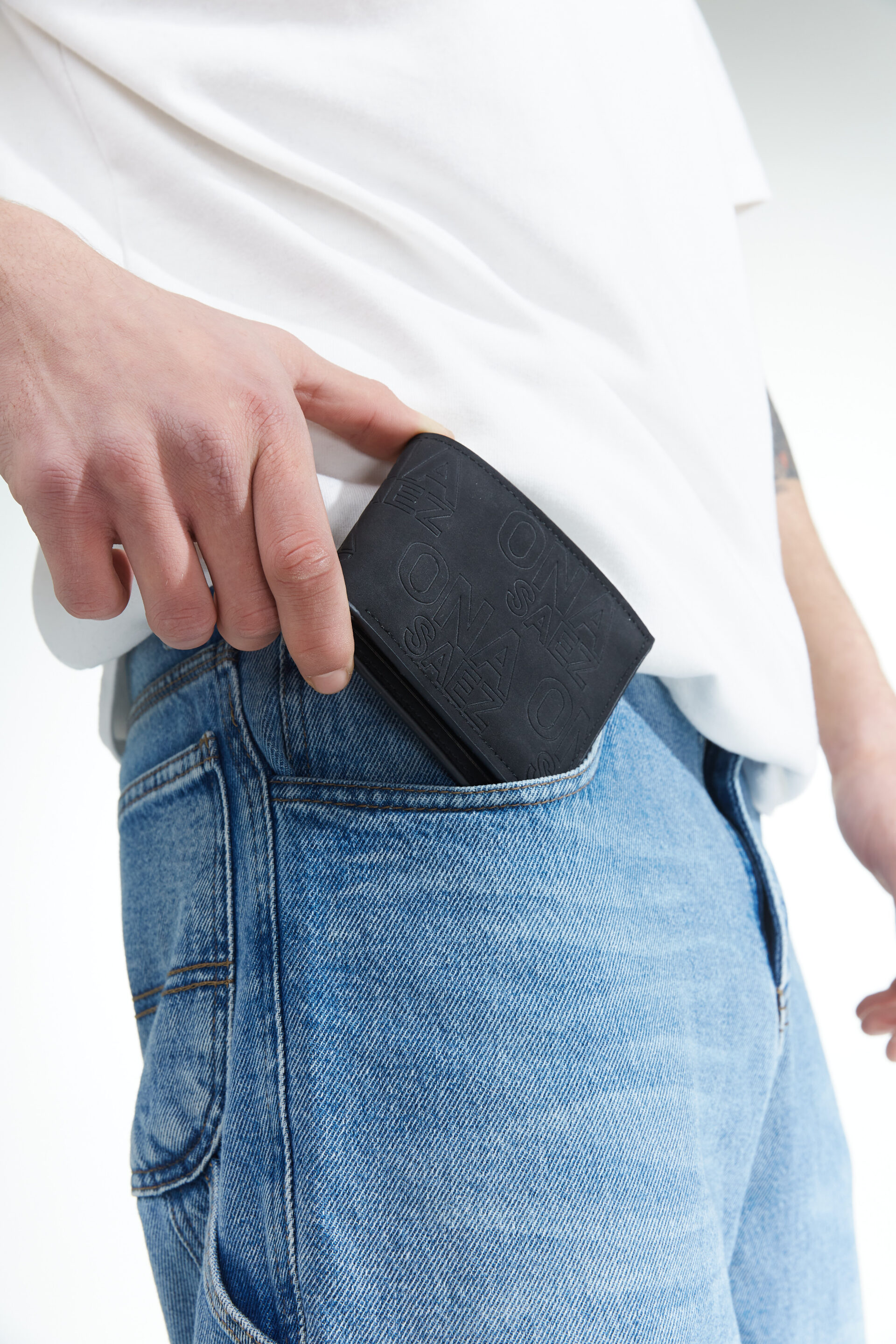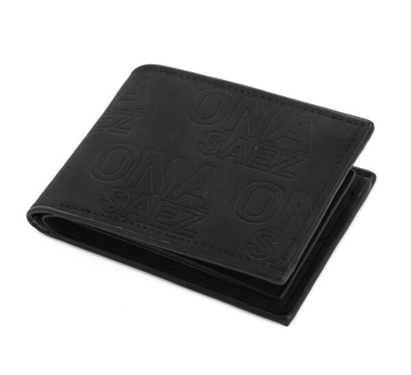 Esta billetera esta confeccionada en material PU (símil cuero) de acabado engrasado color negra. El diseño incluye un grabado con el logo de la marca Ona Saez en el frente, aportando un detalle moderno y distintivo.