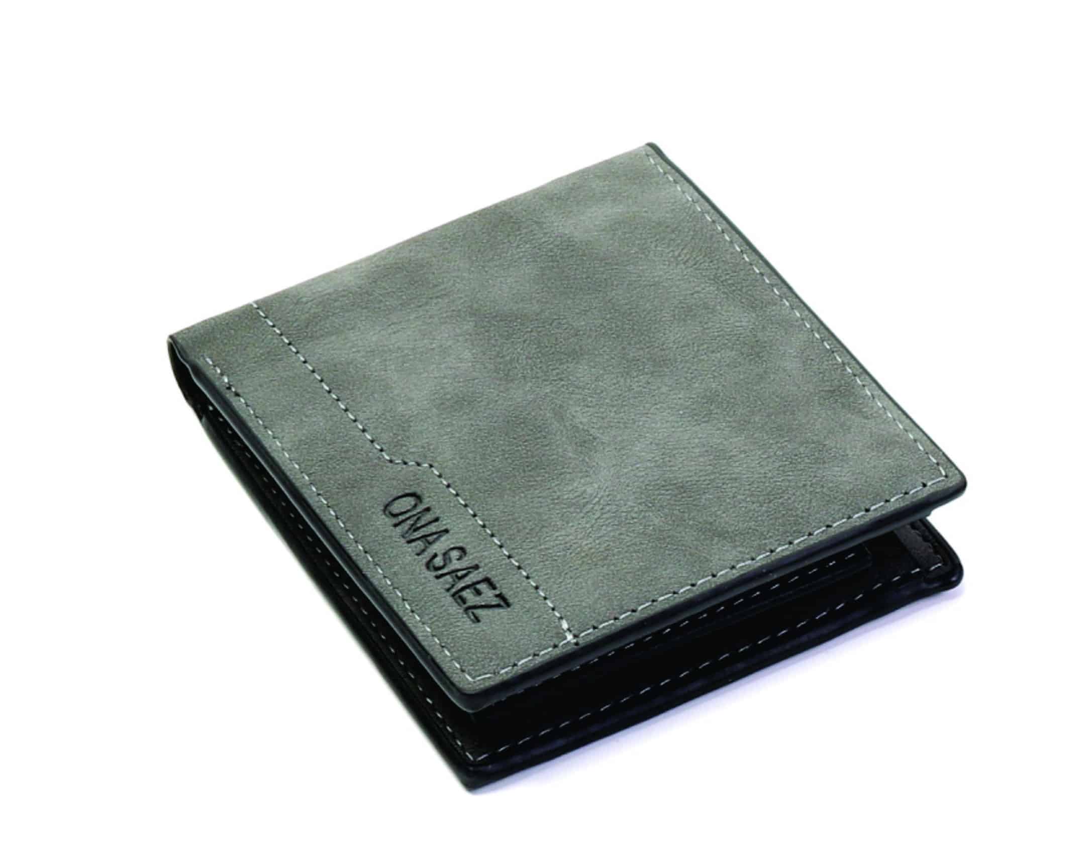 Billetera confeccionada en pu (simil cuero) color gris engrasada, con grabado de marca en el frente.