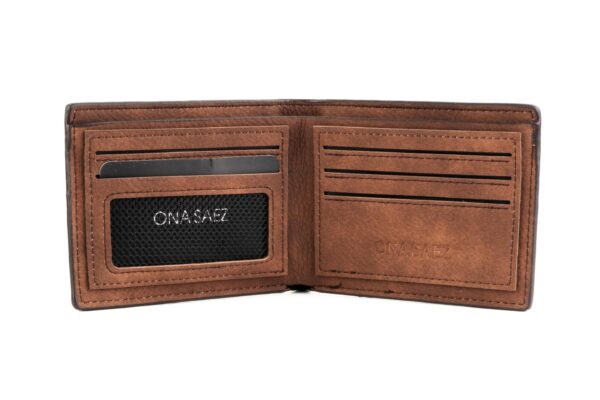 Billetera confeccionada en pu (simil cuero) color marron engrasada, con grabado de marca en el frente.