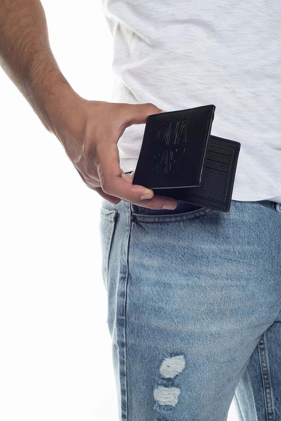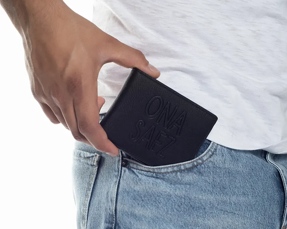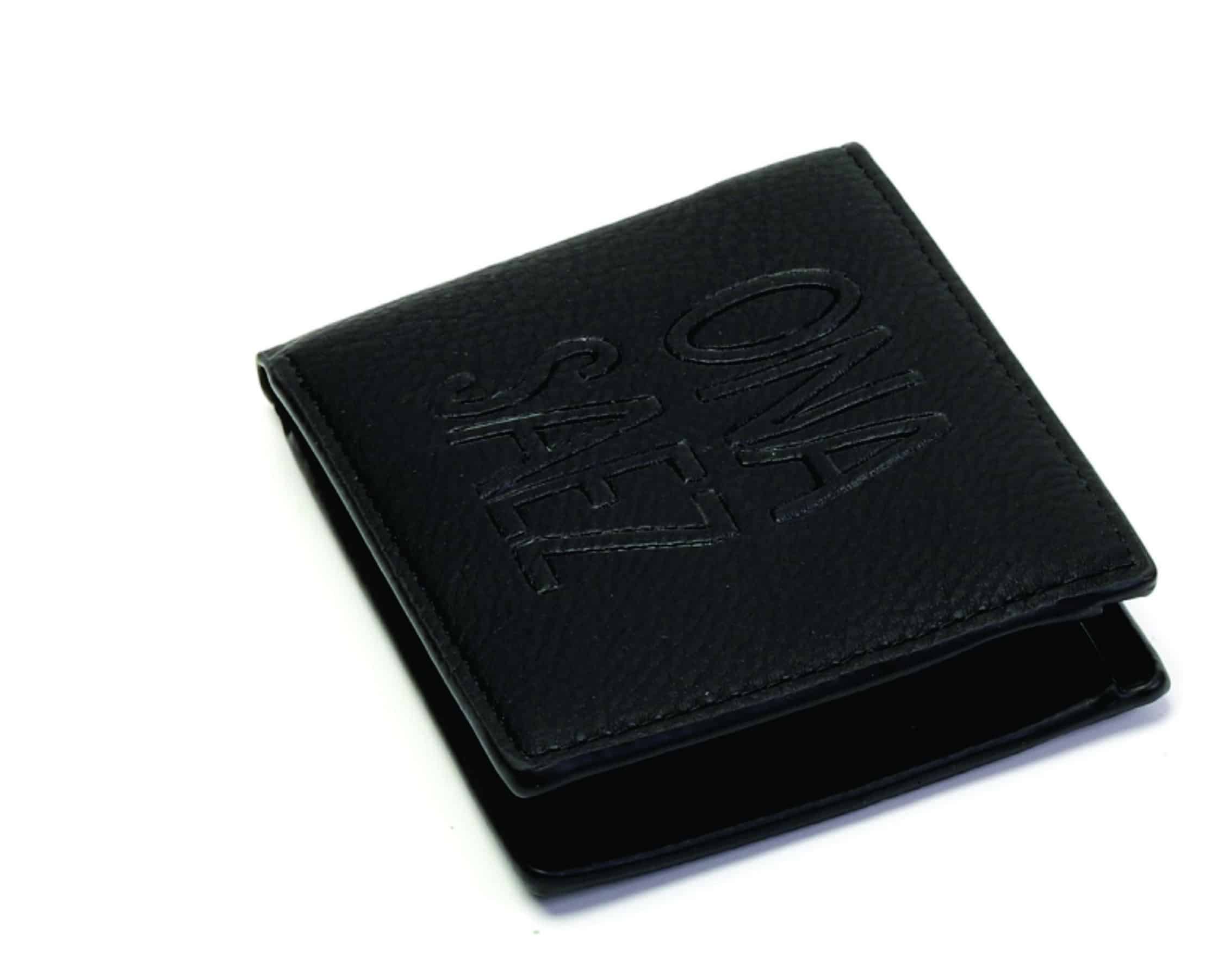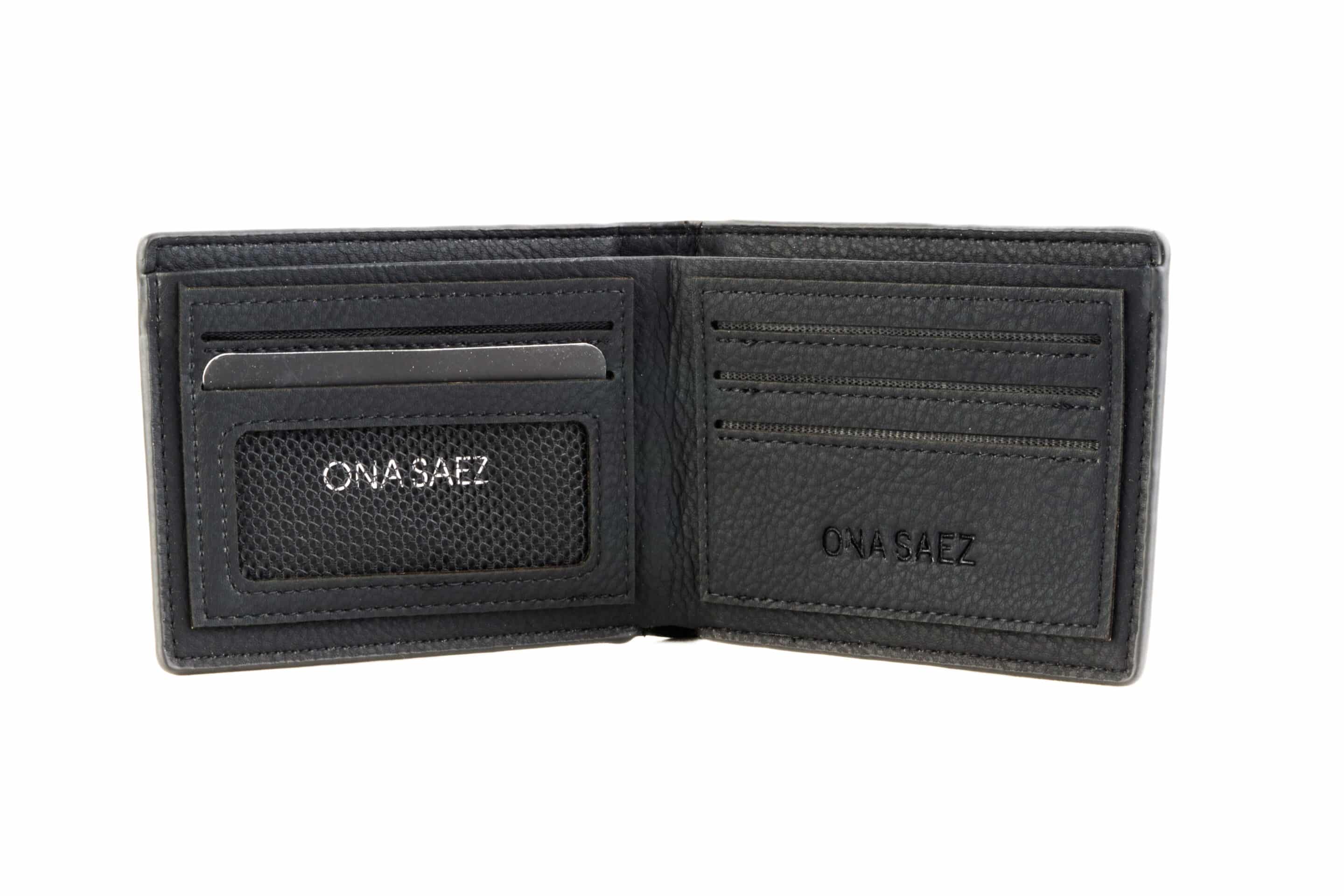 Billetera confeccionada en pu (simil cuero) color negra engrasada, con grabado de marca en el frente.