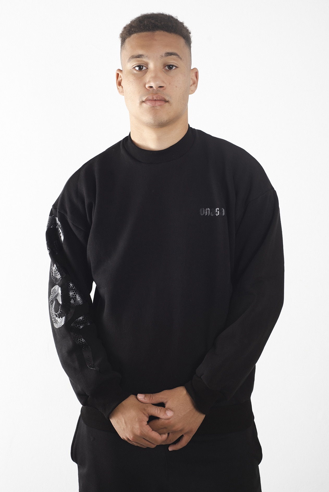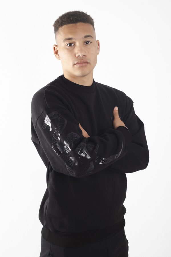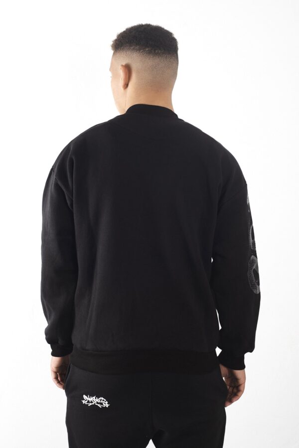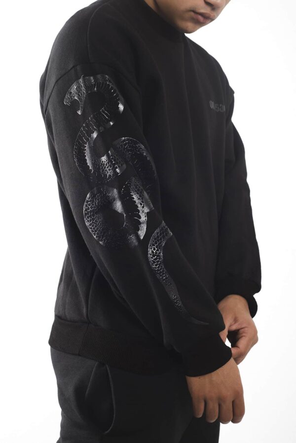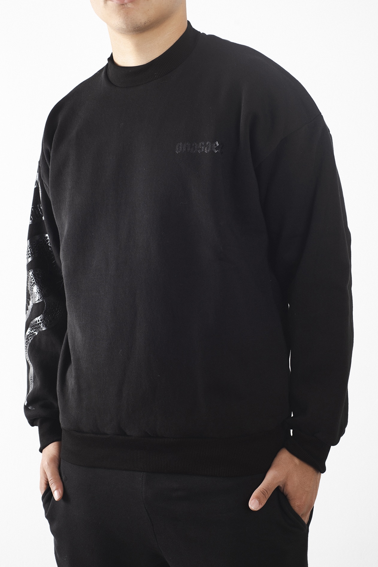 Largo por debajo de la cadera, estampado simil charol a tono en manga y pecho y terminaciones en rib elastizado.