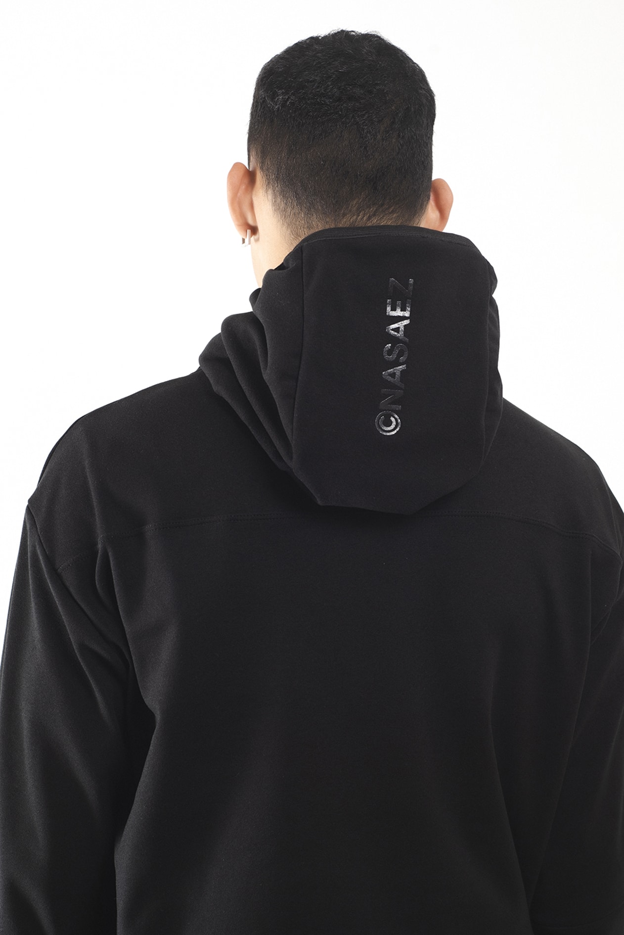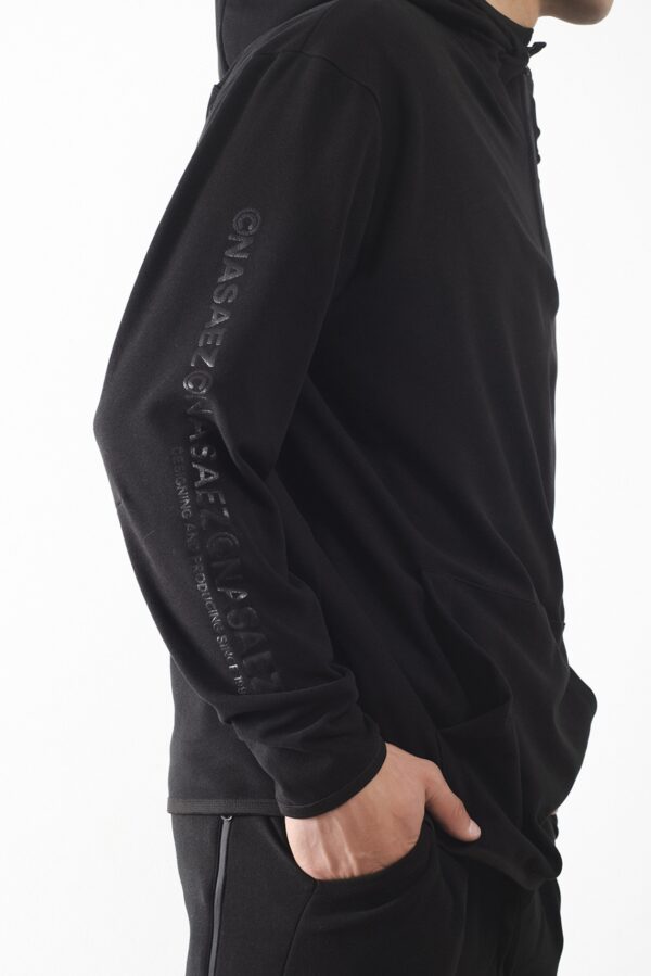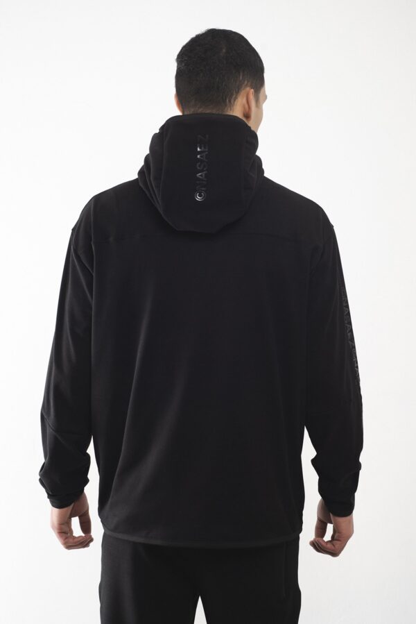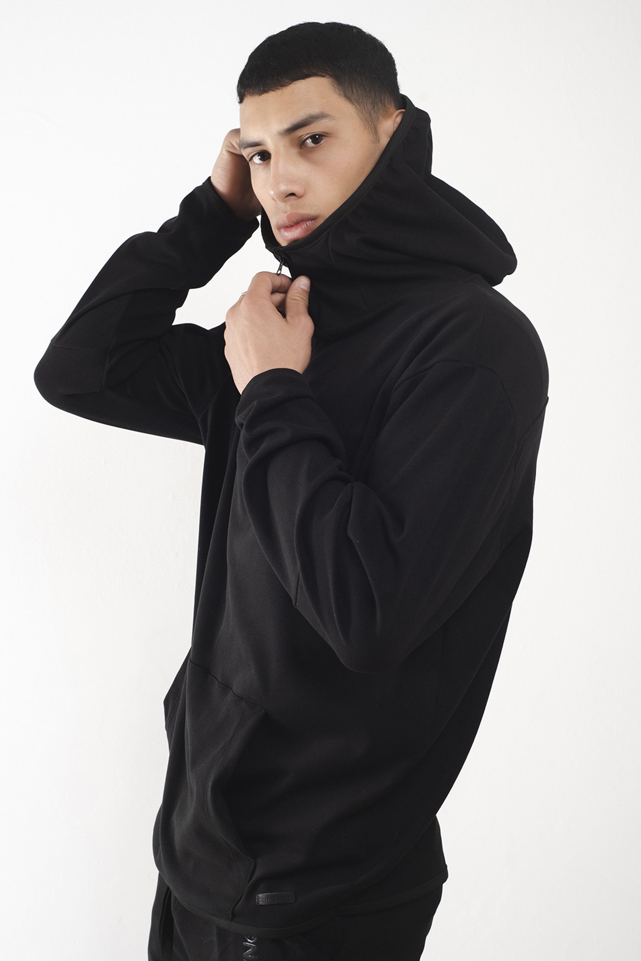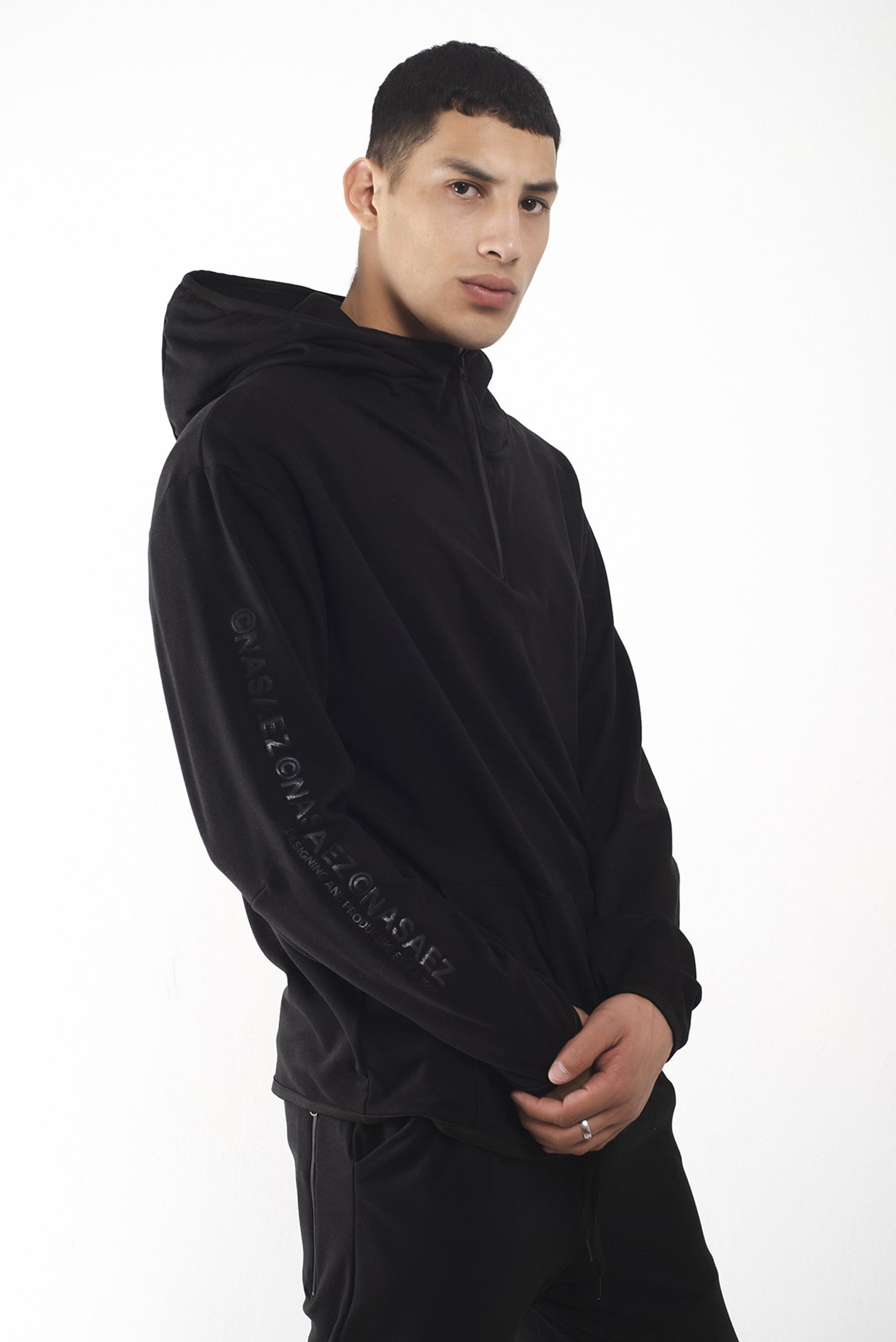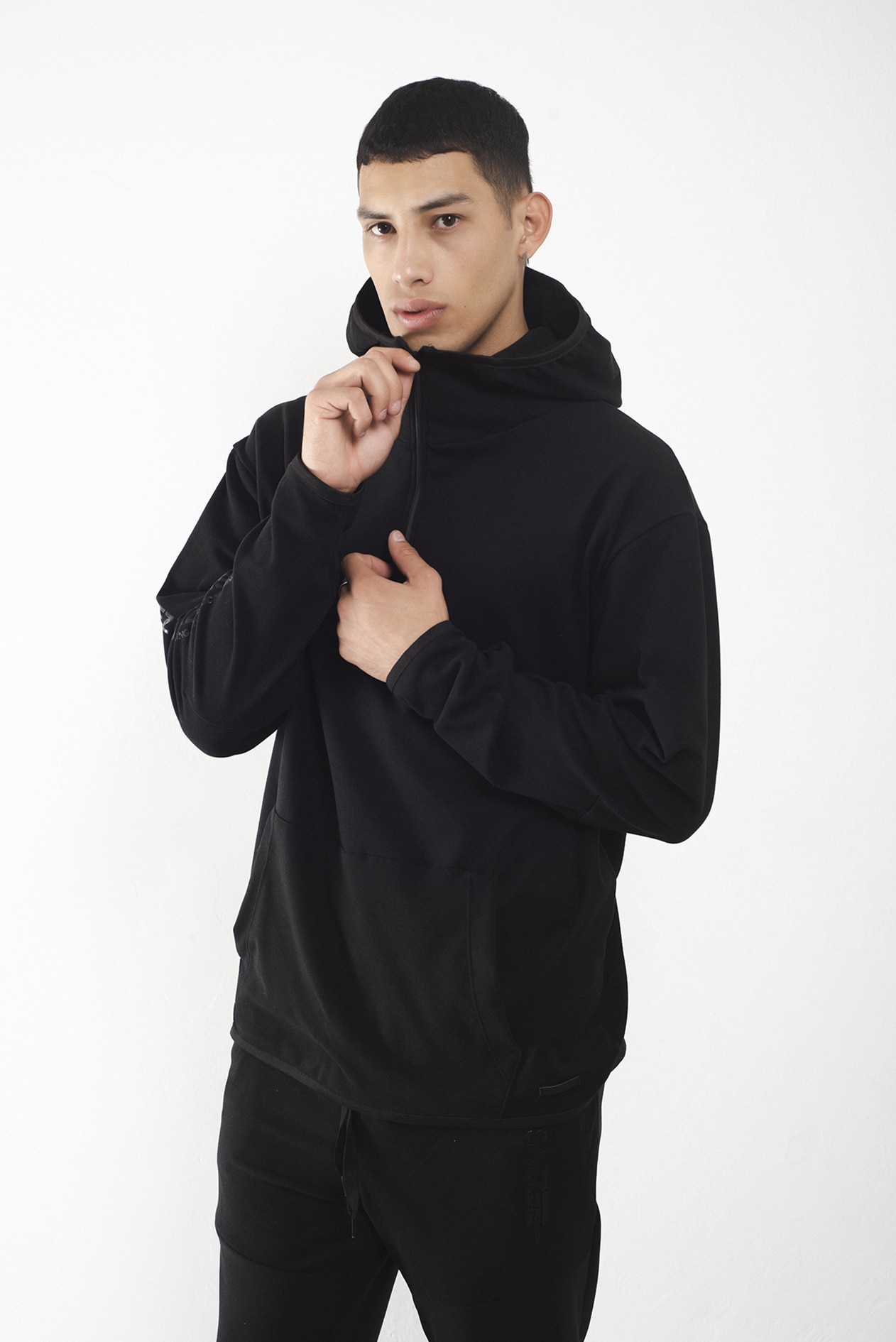 Con capucha doble forrada, largo por debajo de la cadera y estampa a tono con logo de marca ubicada en la capucha y la manga