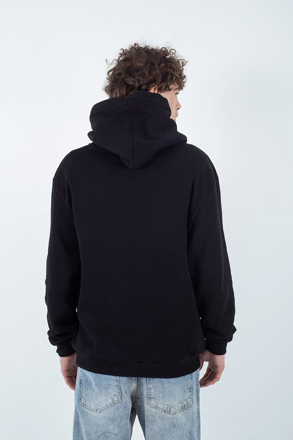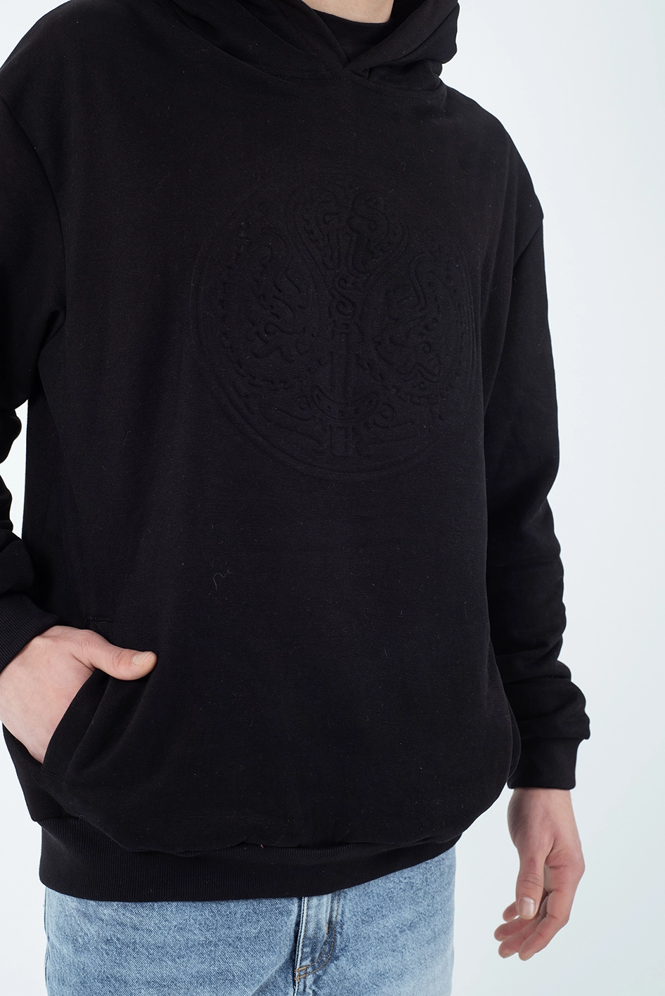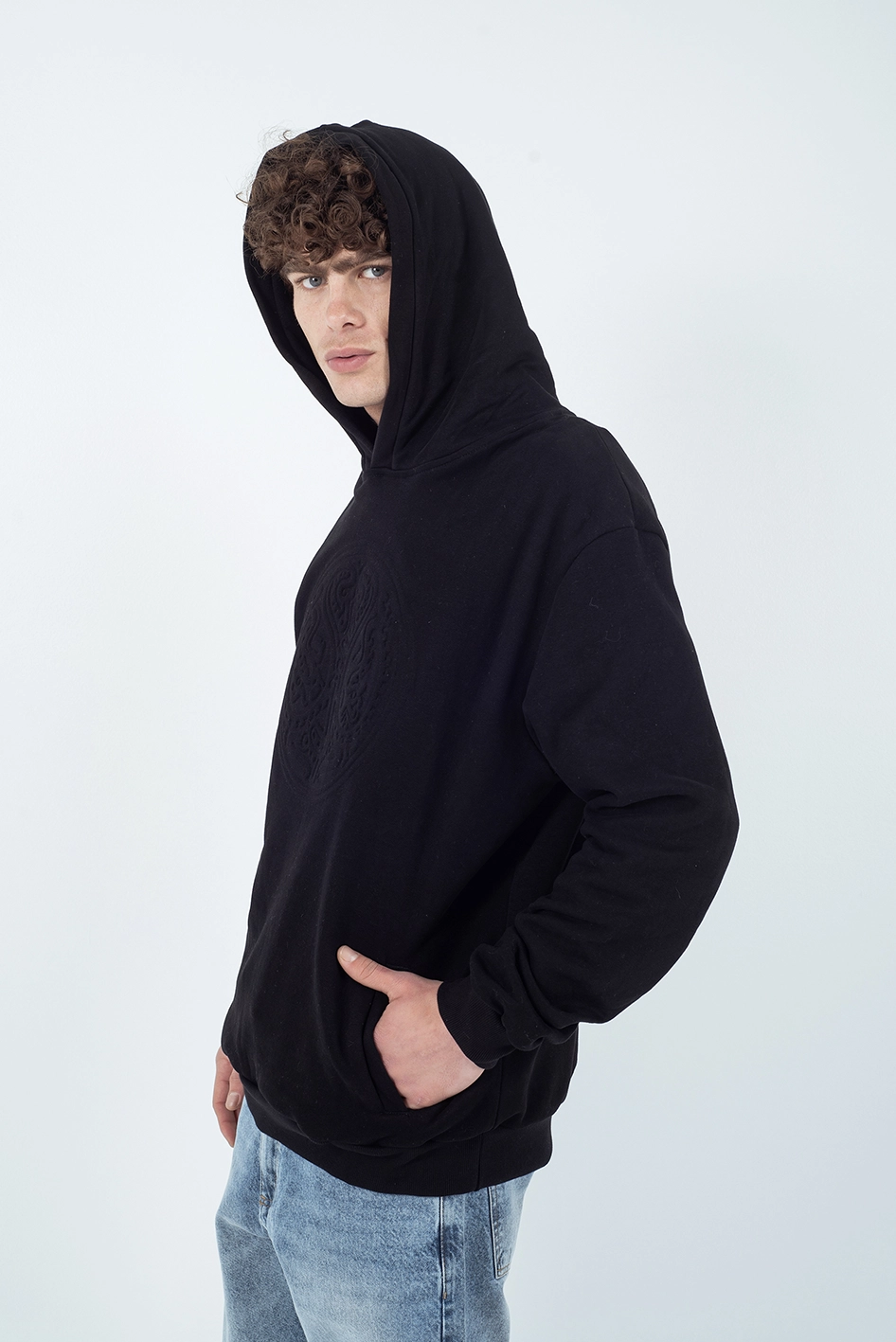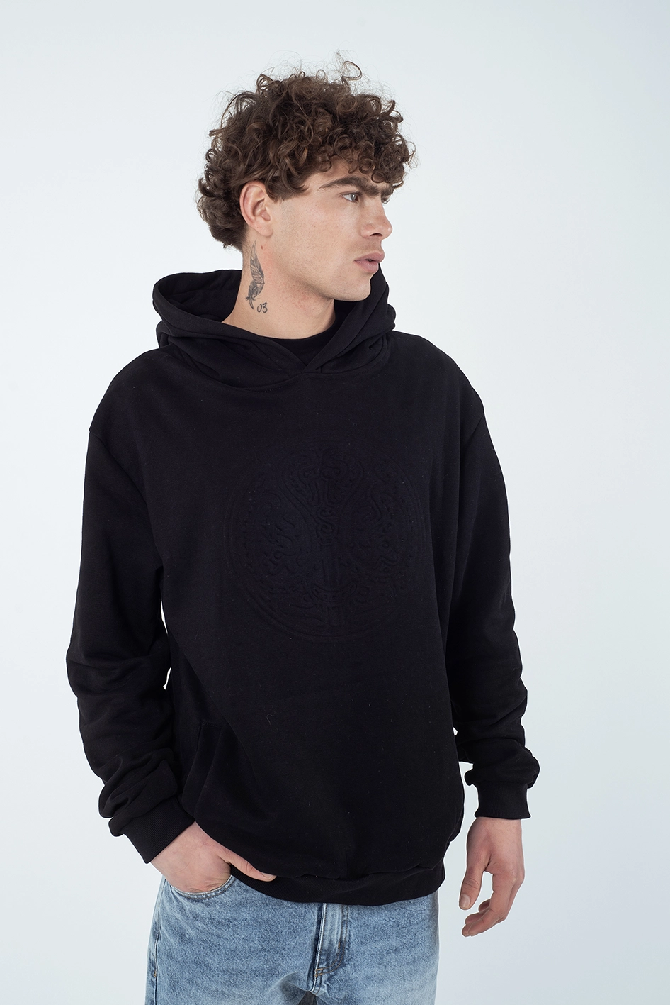 Hoodie de frisa premium 100% algodón, color negro, con calce relajado y diseño urbano. La protagonista de esta prenda es la estampa gofrada al frente, con el tribal característico de la marca, logrando un efecto en relieve tono sobre tono que aporta textura y personalidad sin perder la sobriedad del diseño.