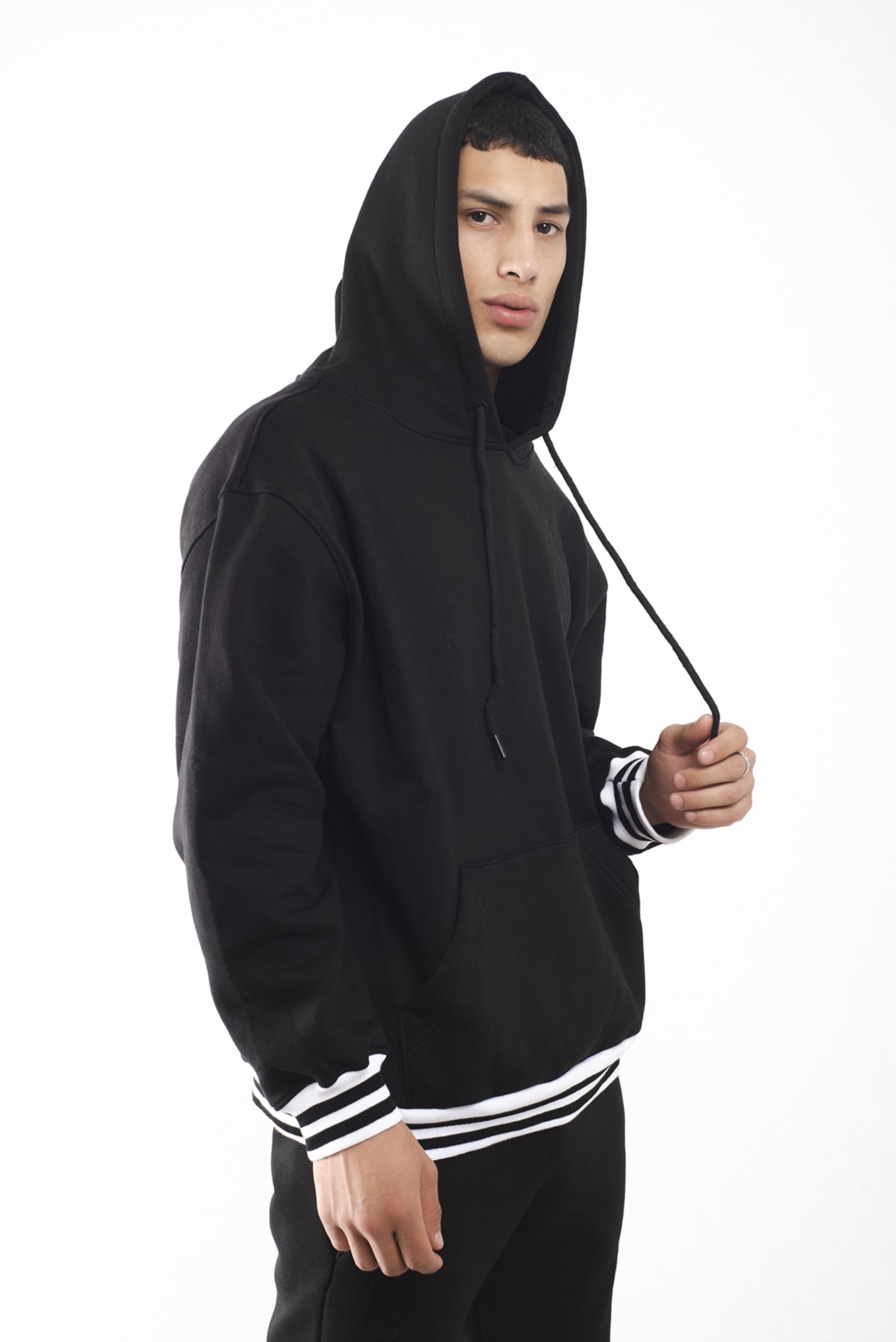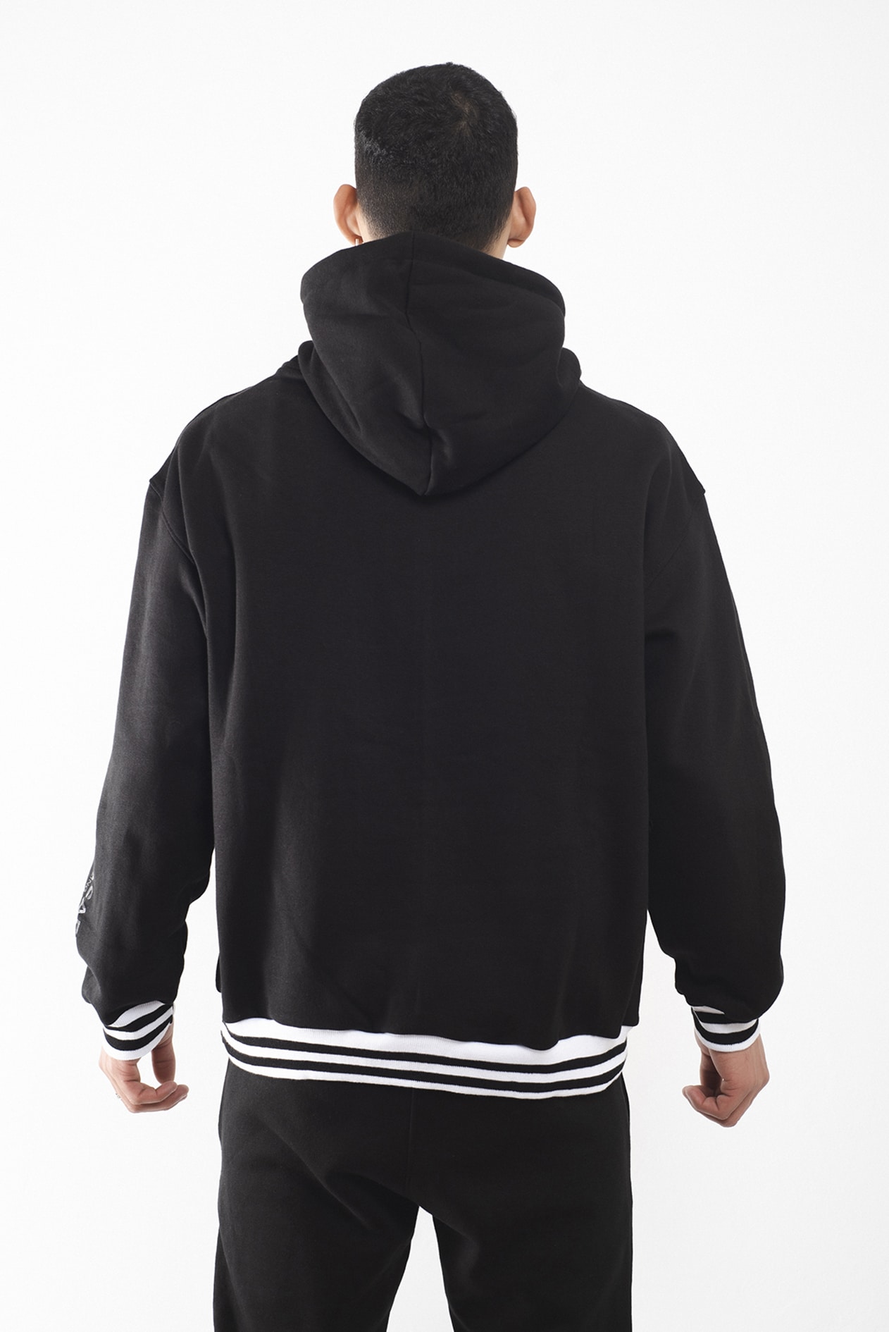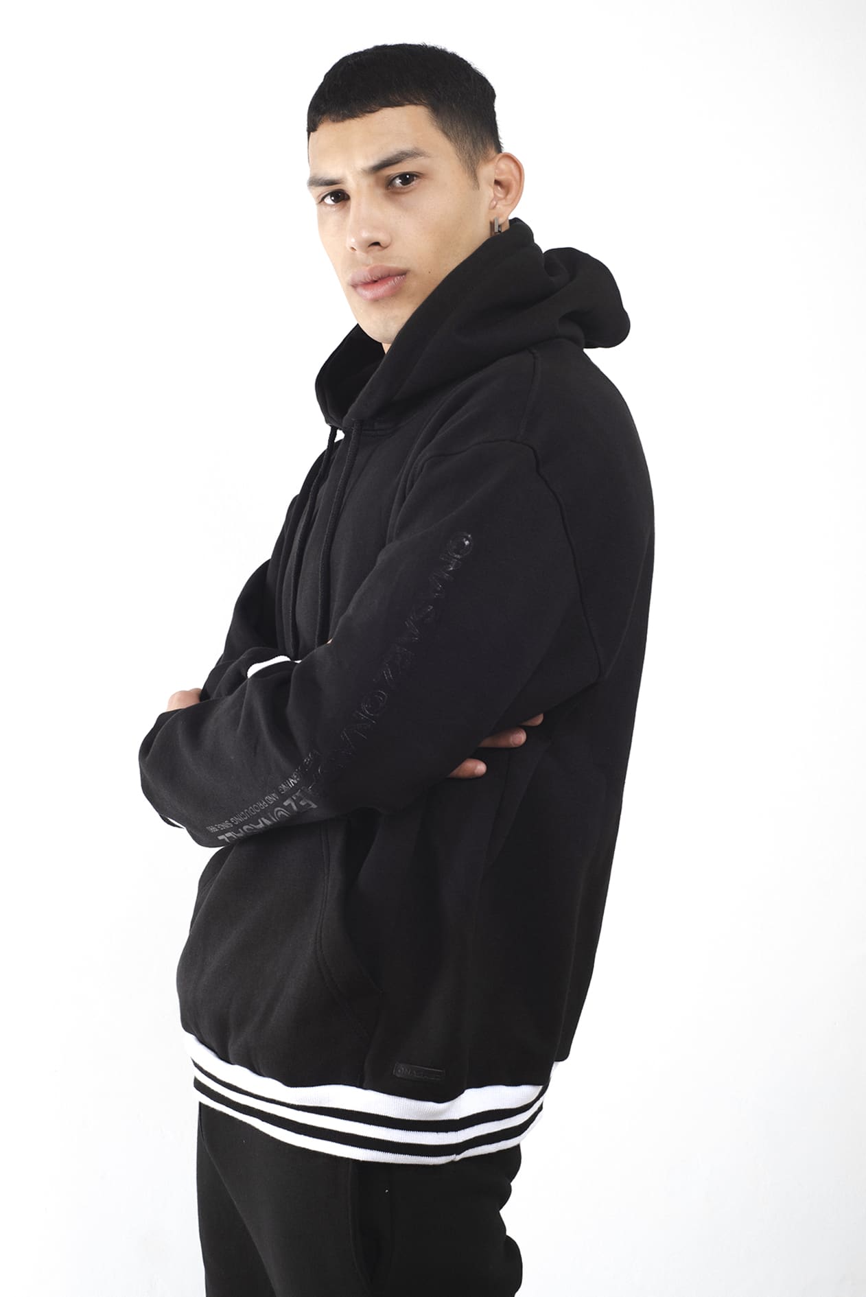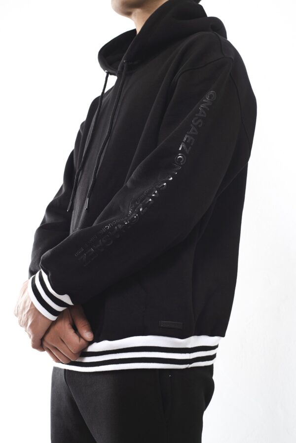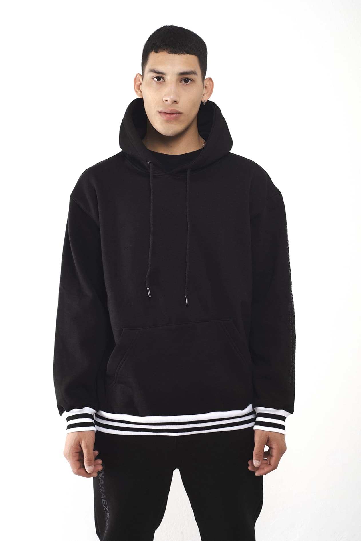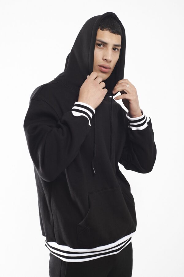 Largo por debajo de la cadera, estampado en manga a tono y terminaciones en rib elastizado rayado blanco y negro.