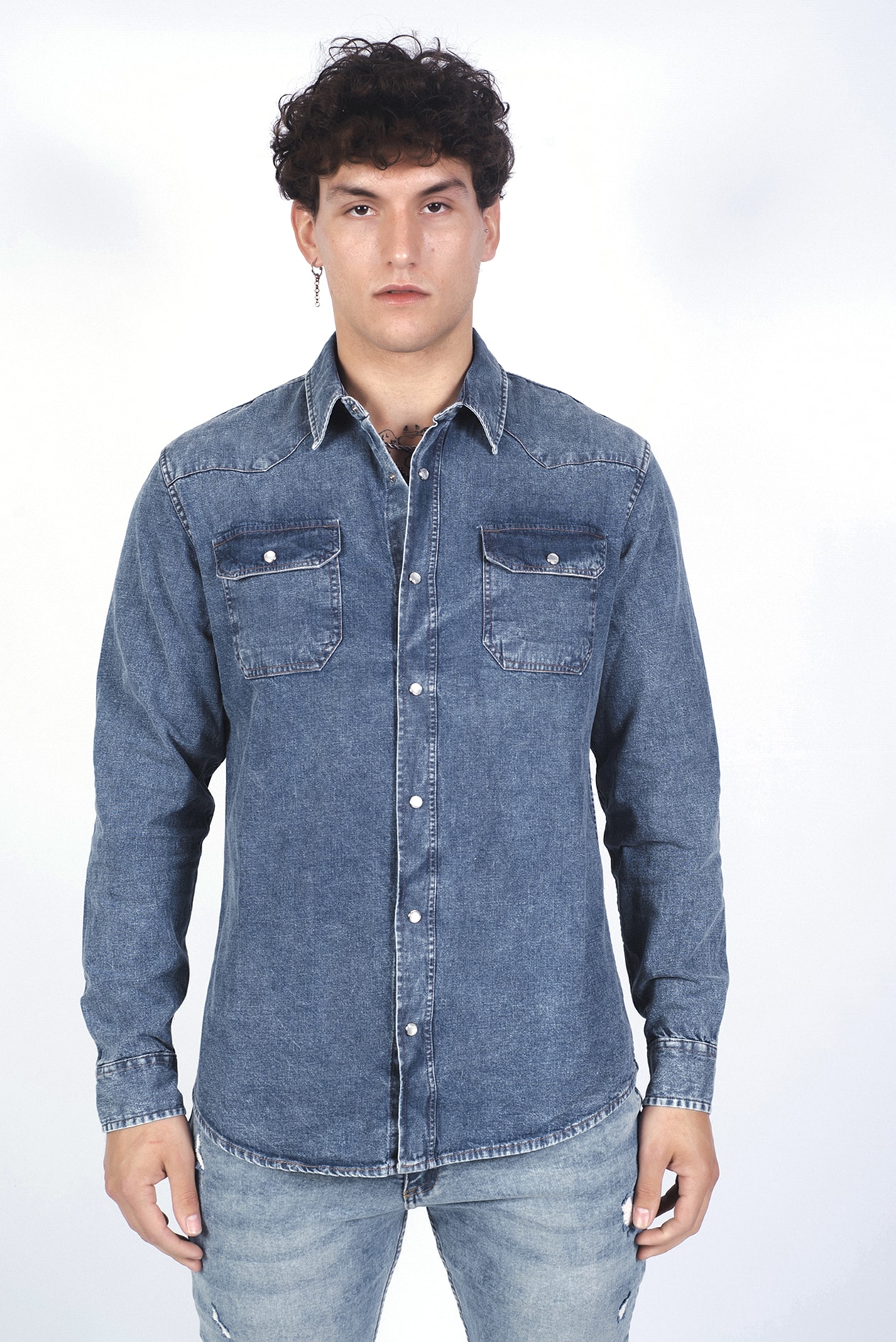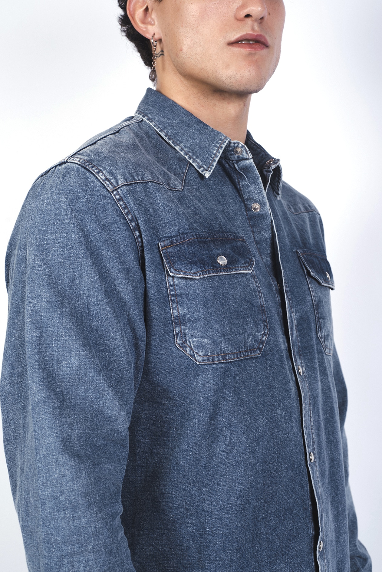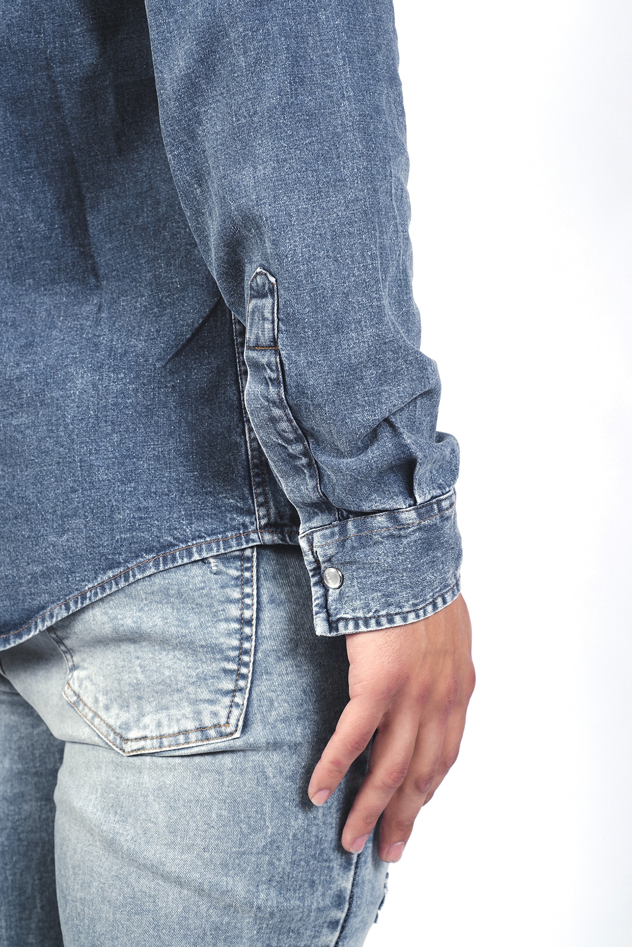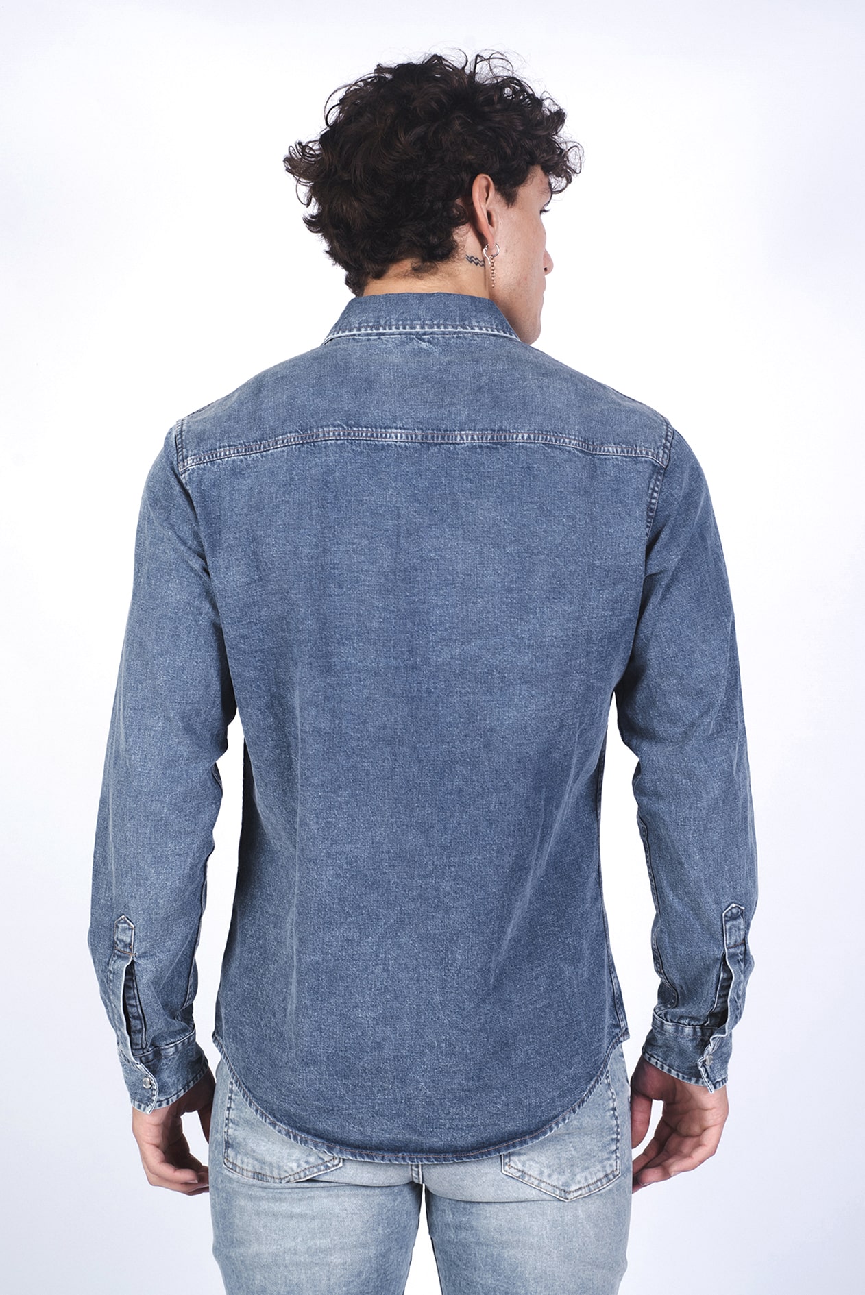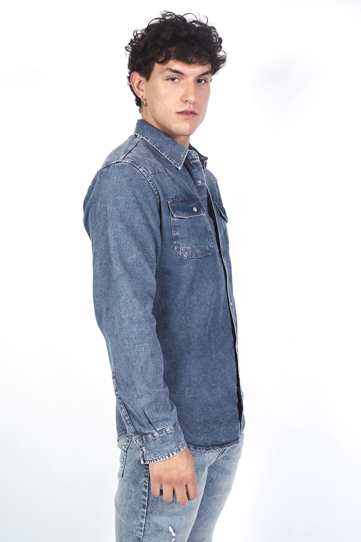 Camisa vaquera slim fit manga larga, confeccionada en Denim camisero de 7 oz. 100% algodón.