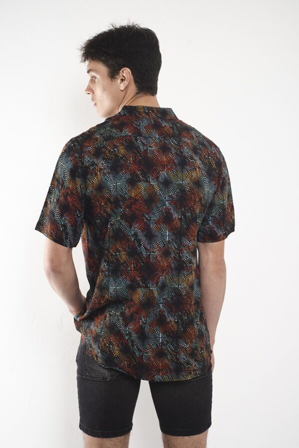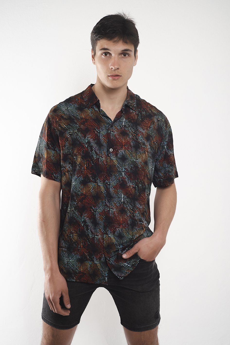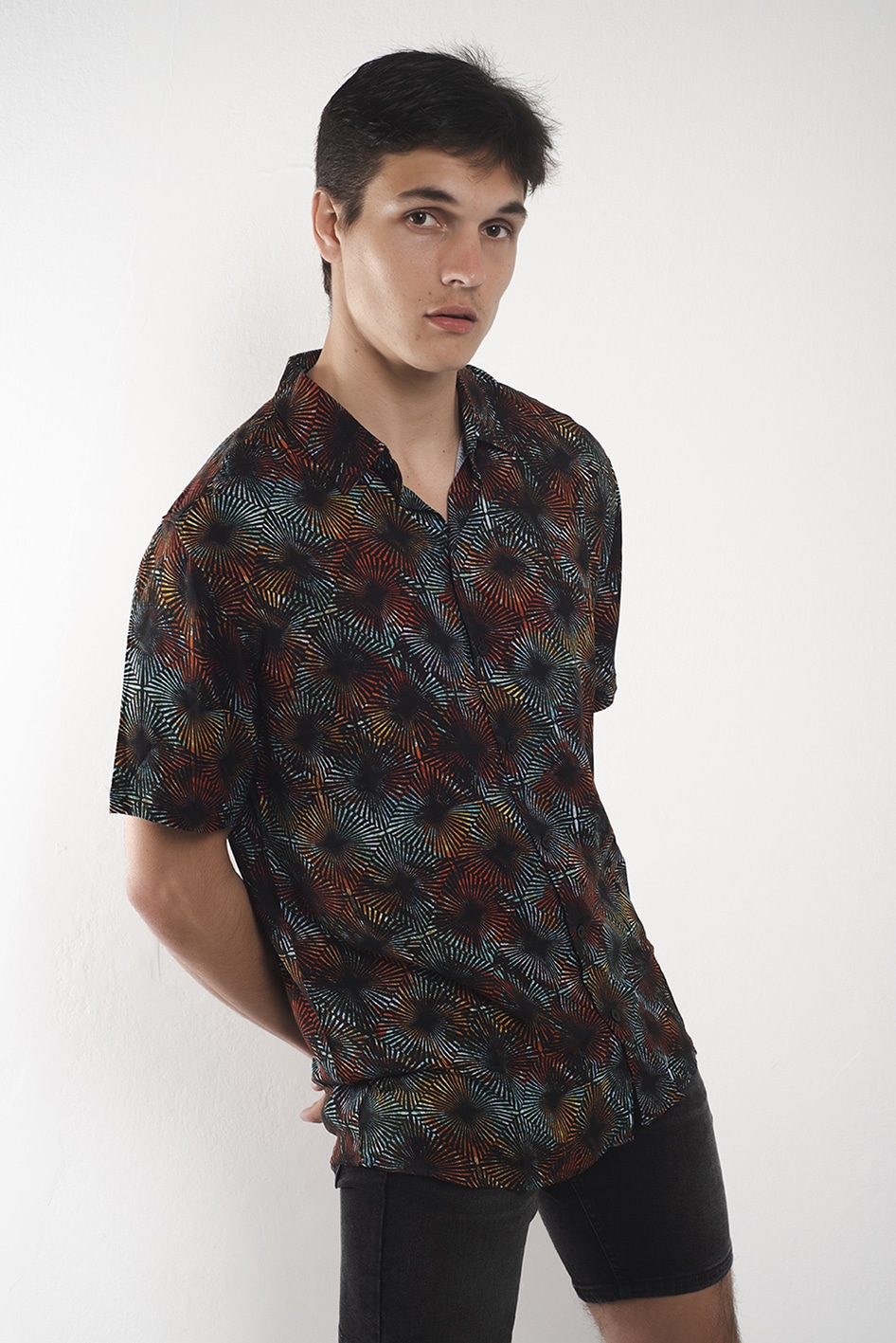 Camisa manga corta, regular fit confeccionada en fibrana, con diseño full estampa realizado exclusivamente para la marca.