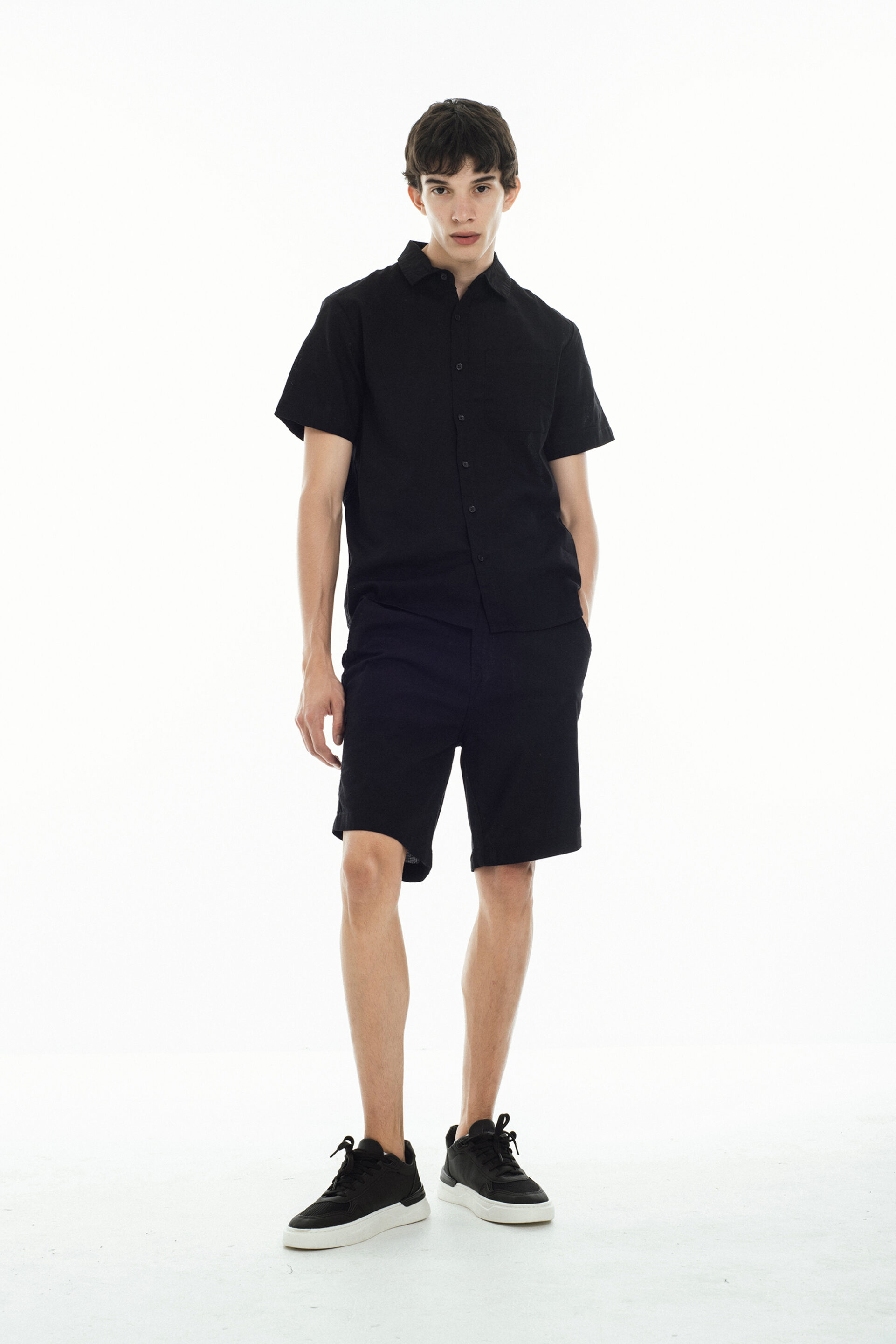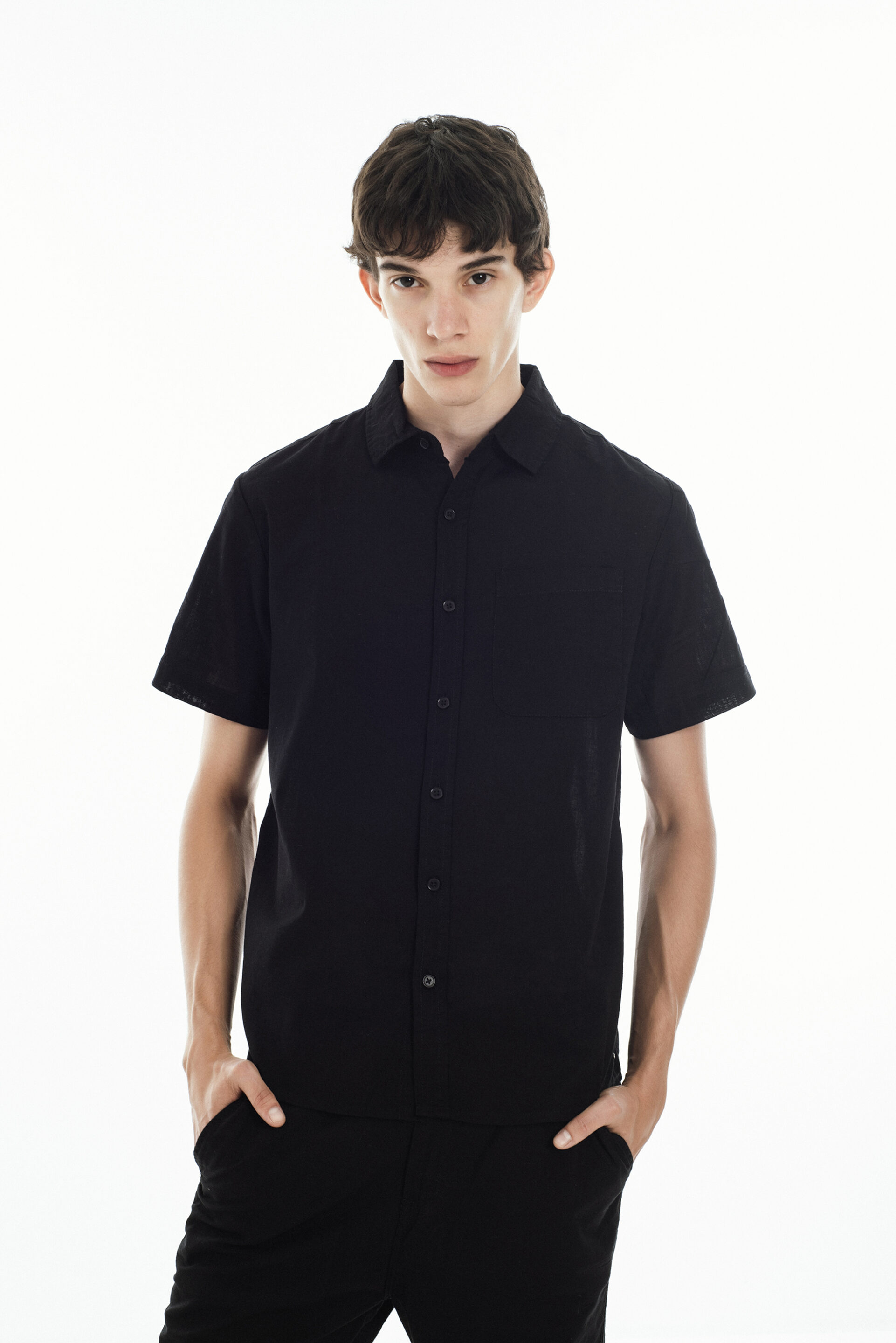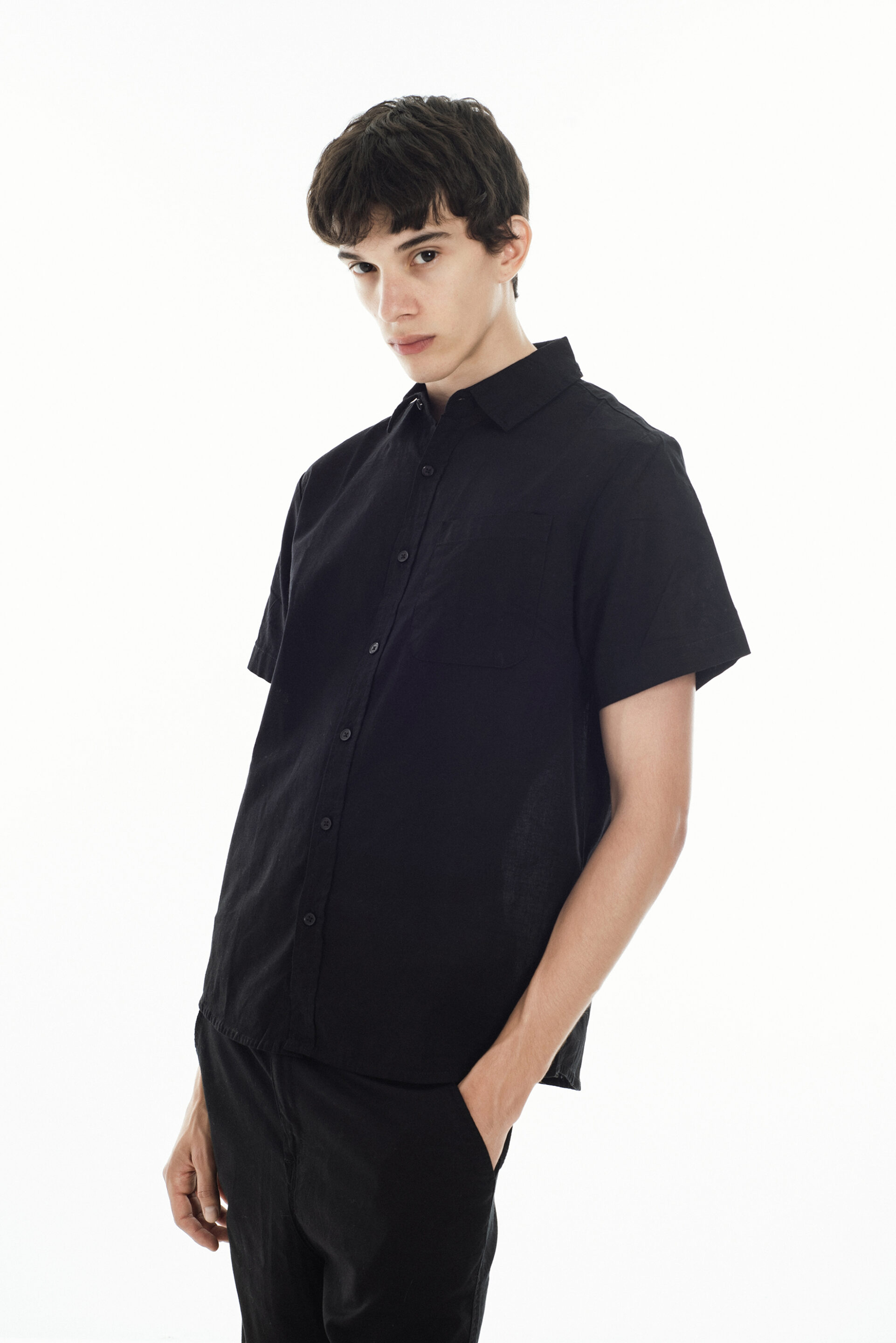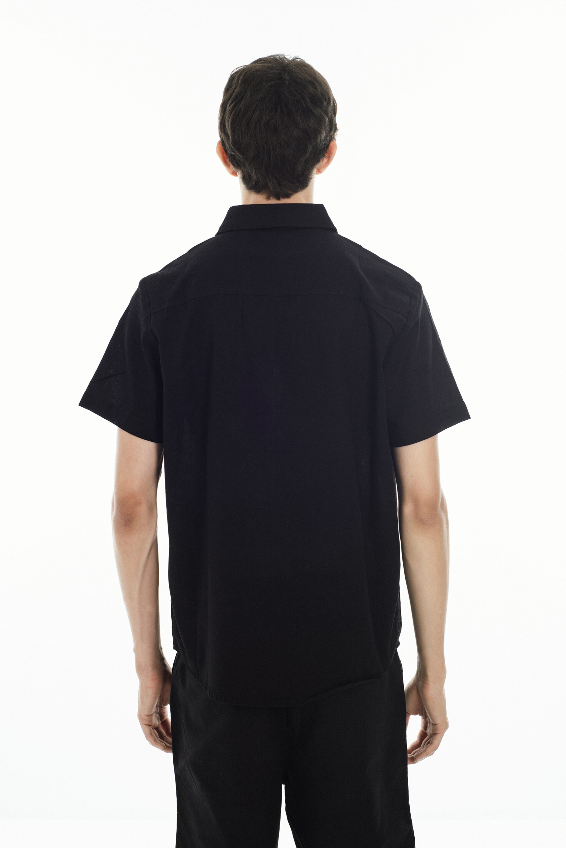 Camisa confeccionada en lino liviano color negra, de corte clásico y estética limpia. Presenta manga corta, cuello estándar y cartera con botones al tono que mantienen un estilo minimalista y fresco.