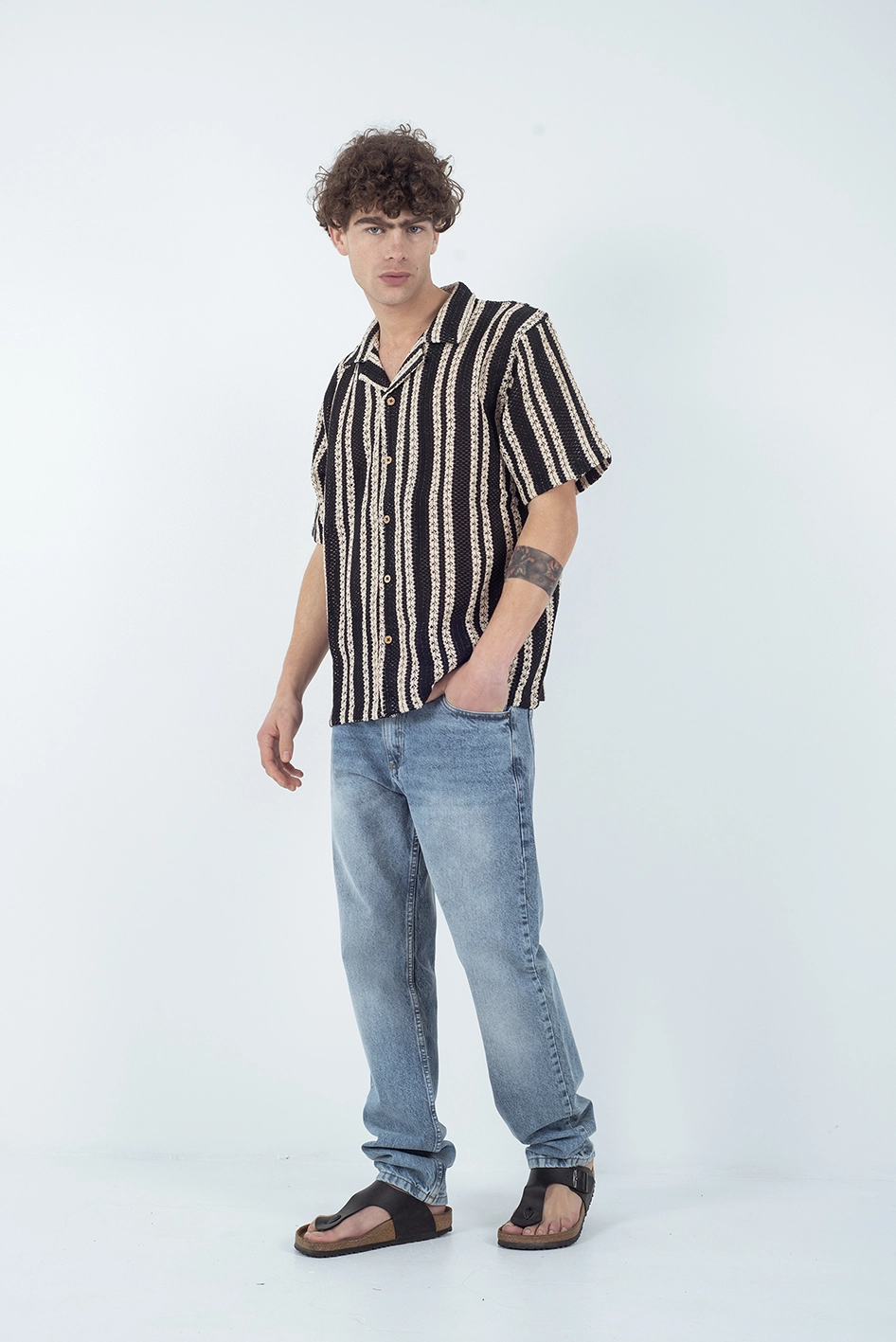 Presenta un diseño relajado y holgado, con botonadura frontal y un estampado a rayas verticales en tono crudo sobre base negra, que estiliza y aporta un aire vintage y artesanal.