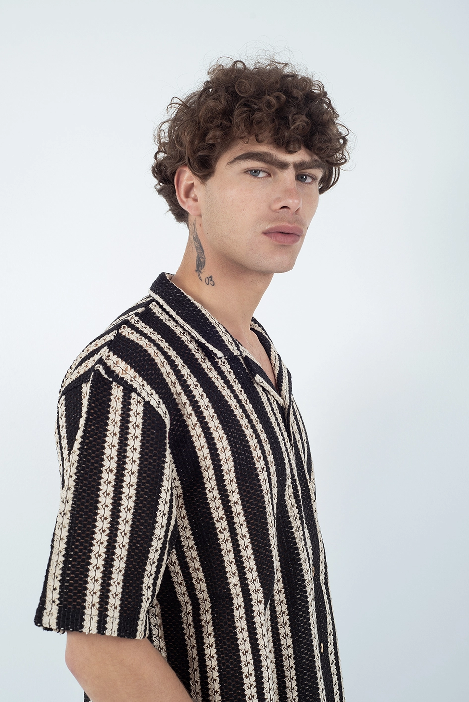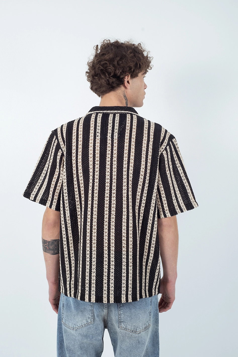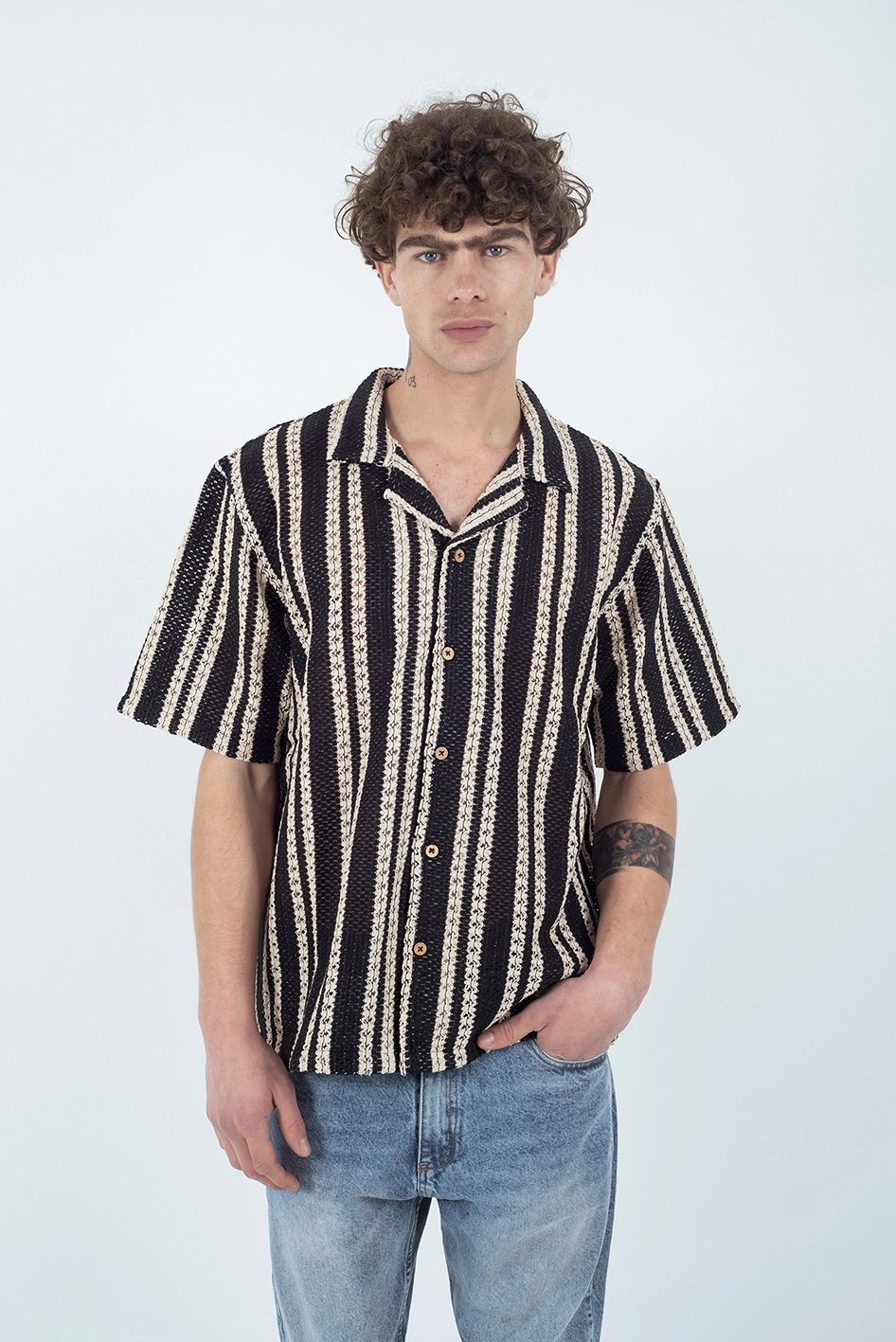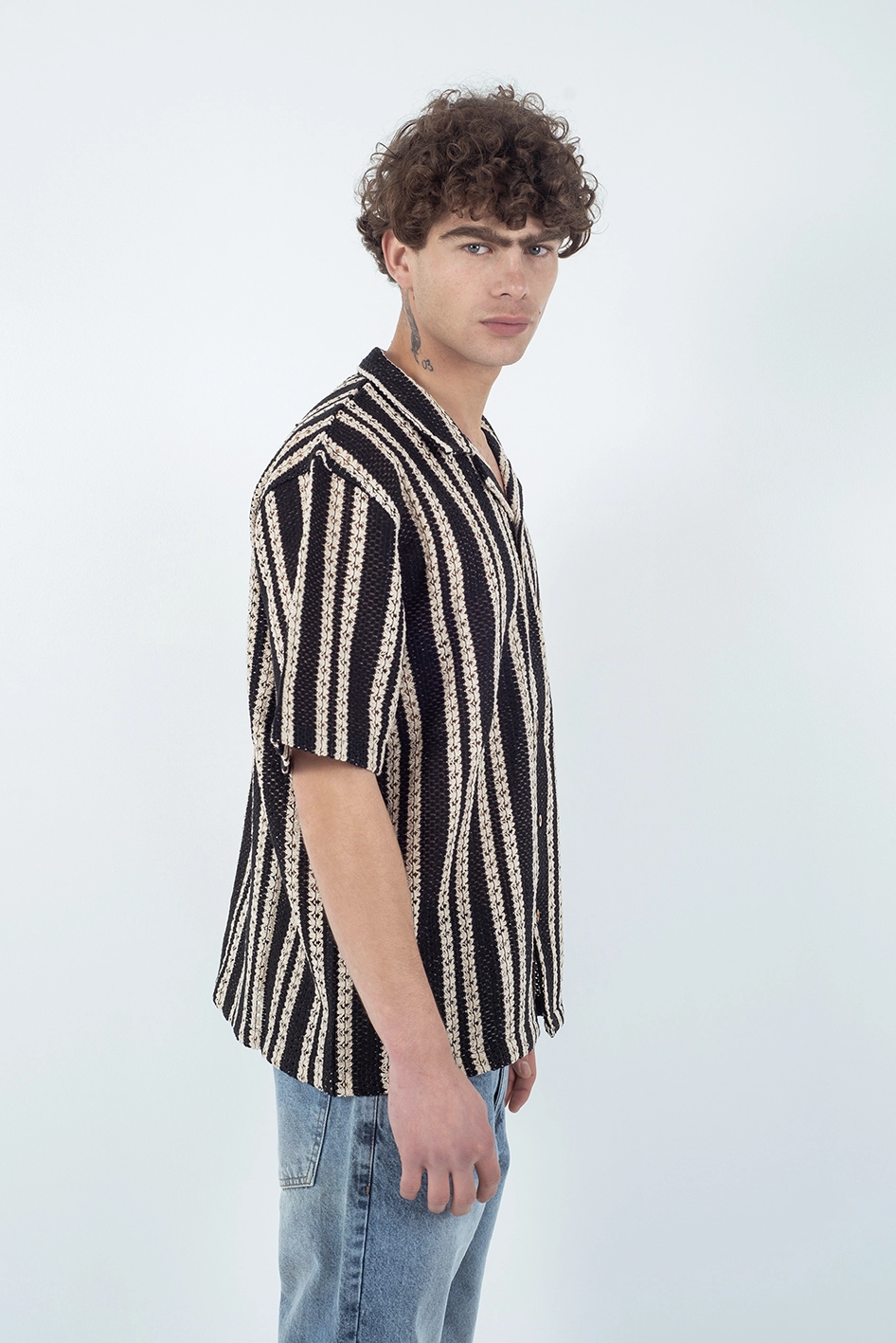 Camisa de manga corta confeccionada en un tejido tipo crochet de estructura liviana y respirable, ideal para los días cálidos.
