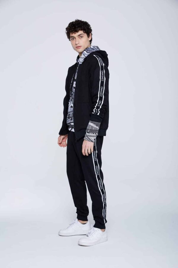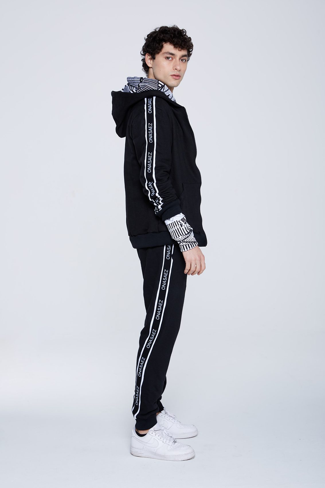 Detalle de recorte a contra tono en manga con cinta de marca bordada.