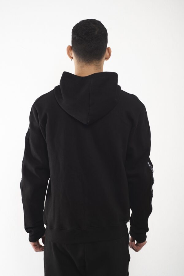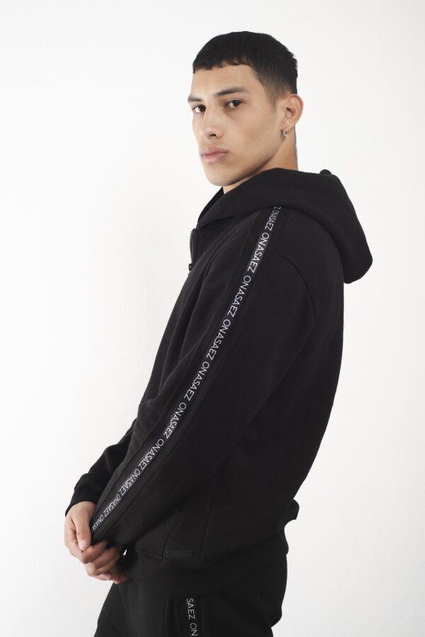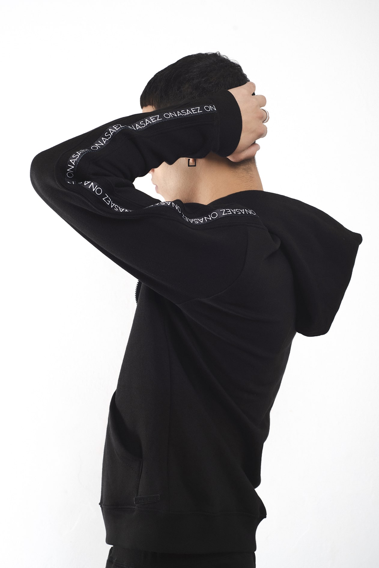 Detalle de cinta a contra tono bordada con logo de marca alrededor de las mangas.