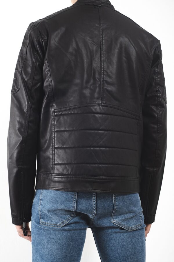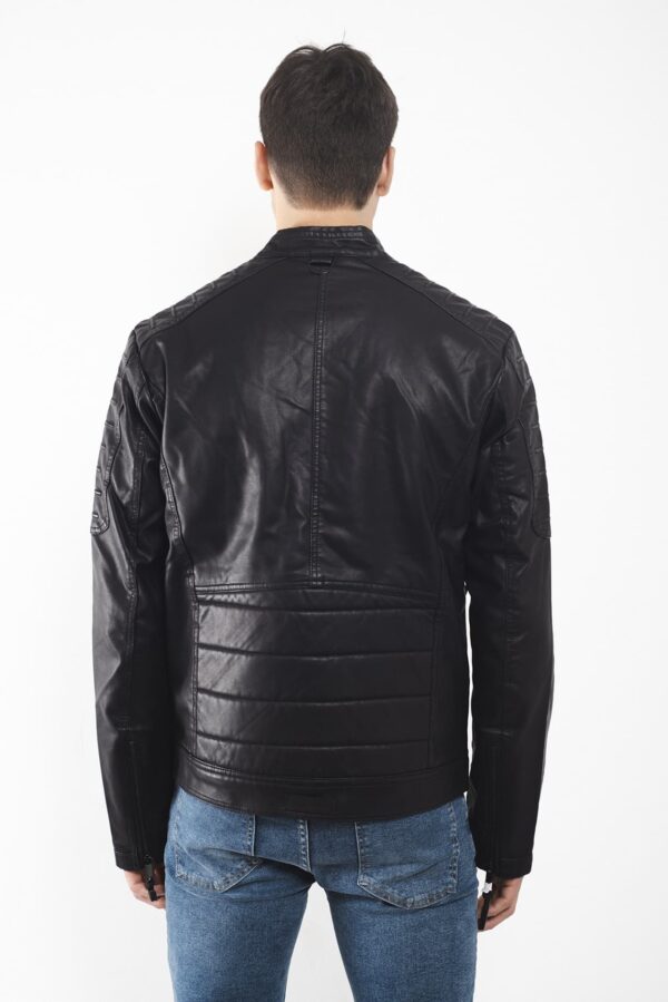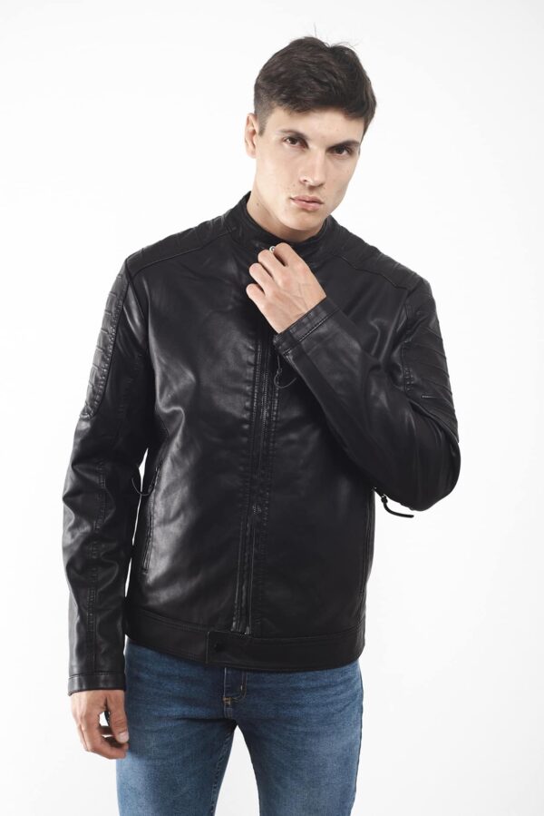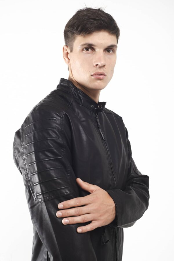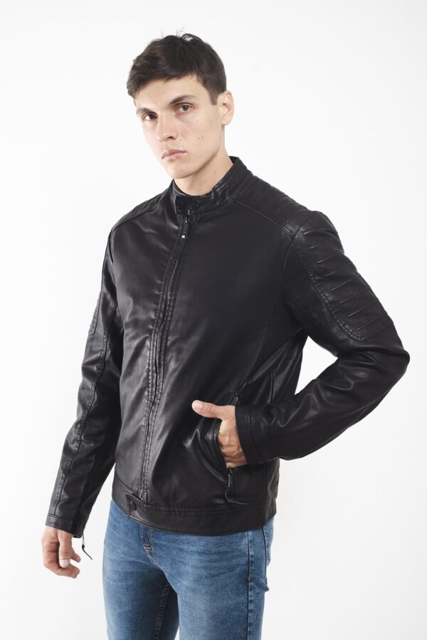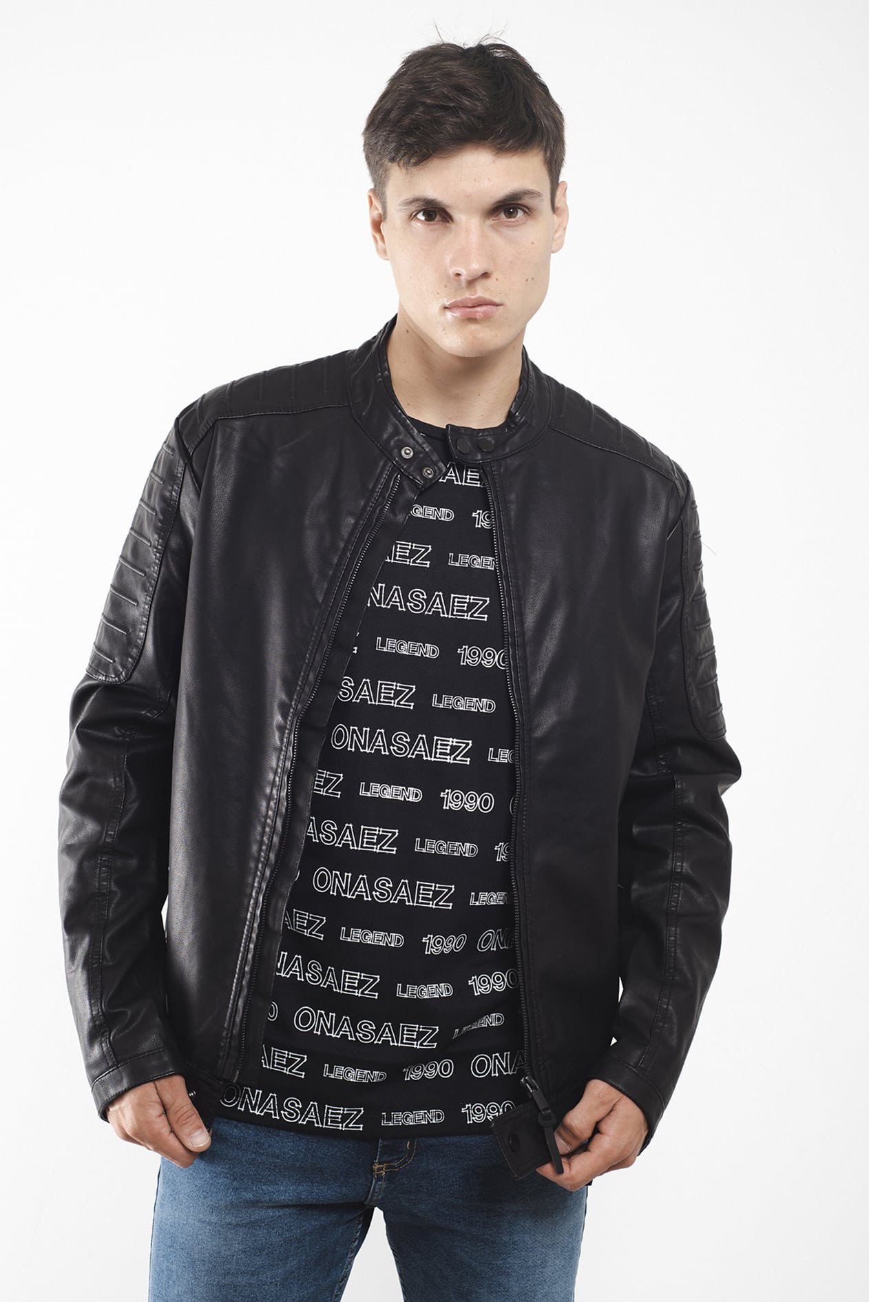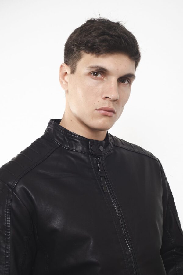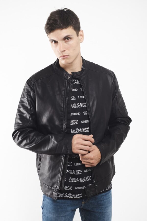 Campera recta confeccionada en vegan leather (simil cuero) con cierres niquelados.