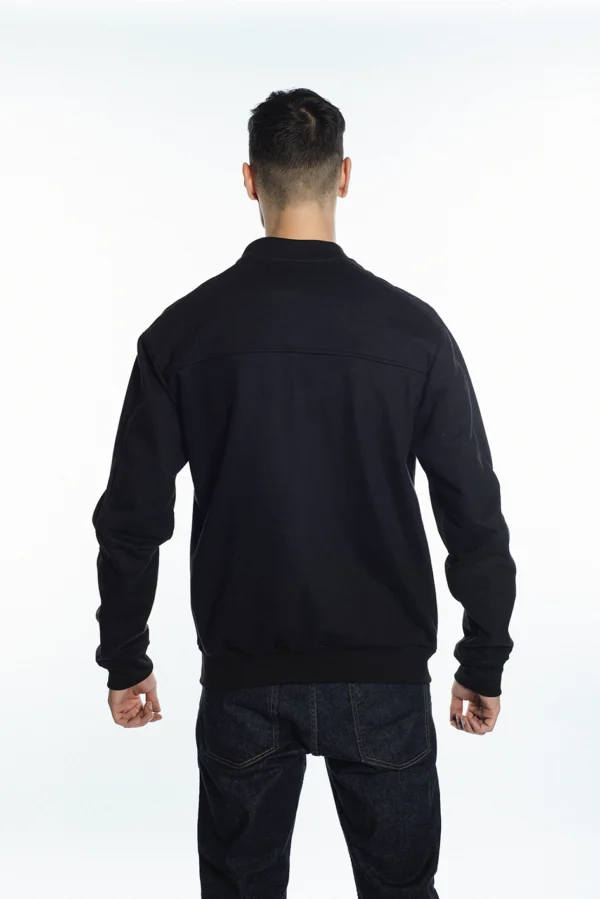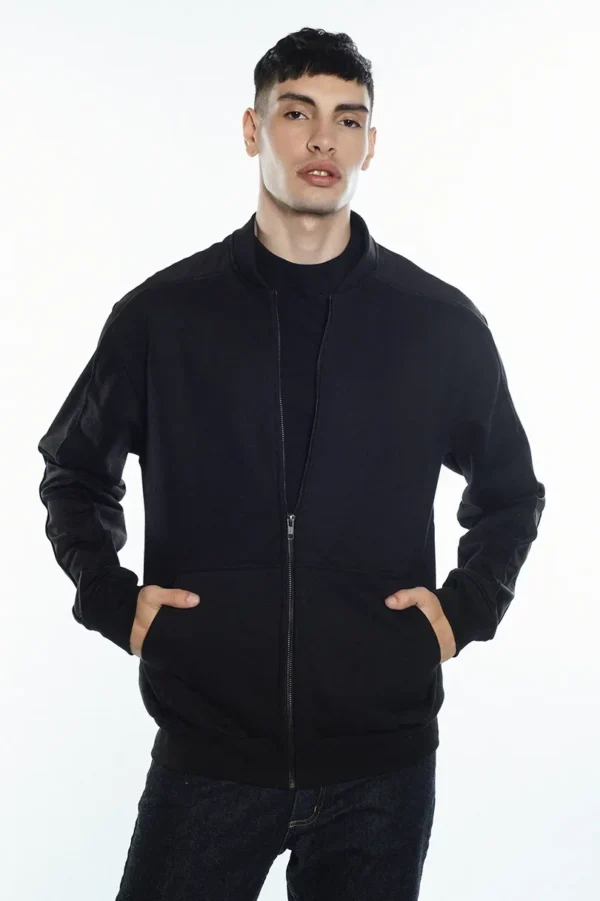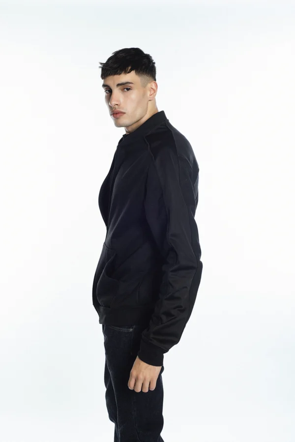 Esta campera negra es ideal para un look urbano moderno. Confeccionada en rustico de algodón con recorte de acetato en canesú, presenta un diseño minimalista con cuello alto sin capucha, cierre frontal completo y bolsillos laterales que aportan practicidad. Las mangas tienen un acabado ligeramente satinado que aporta un toque distintivo y elegante. El corte recto y los puños ajustados aseguran un calce cómodo y favorecedor.