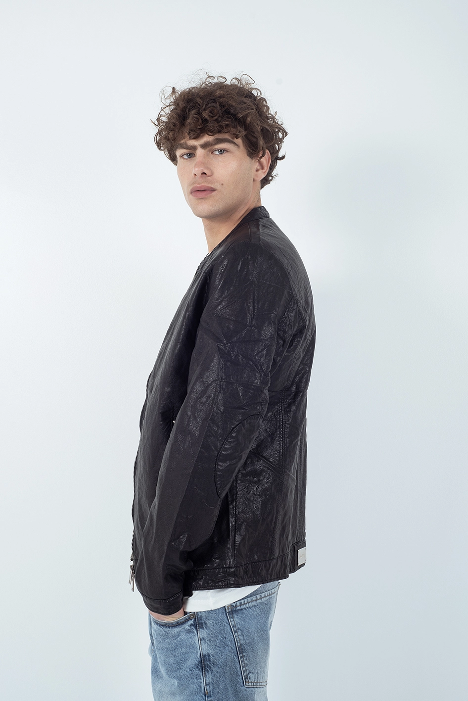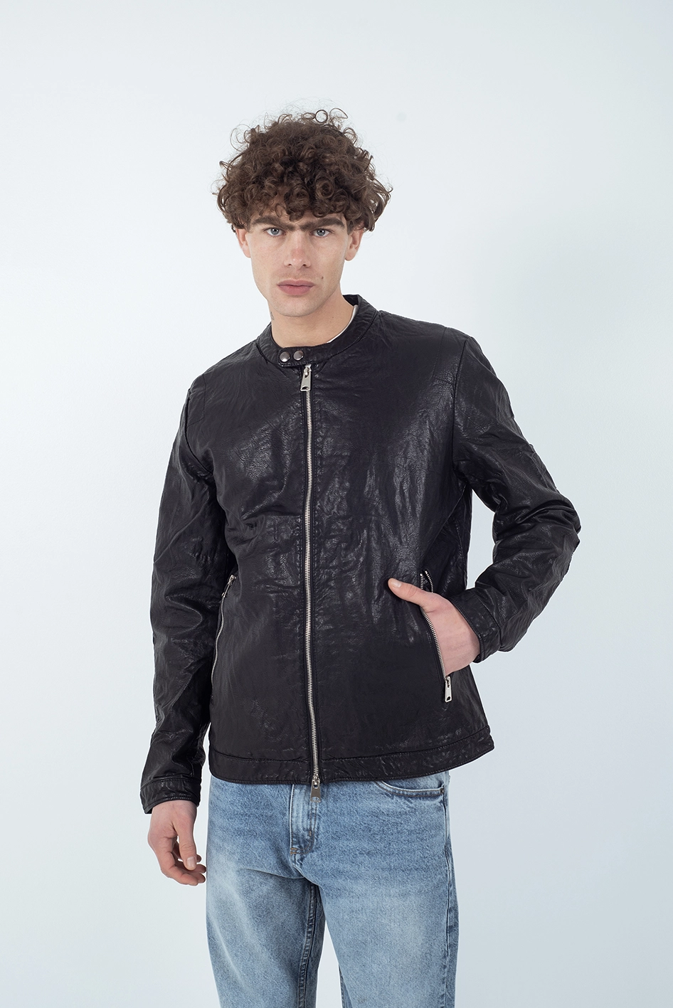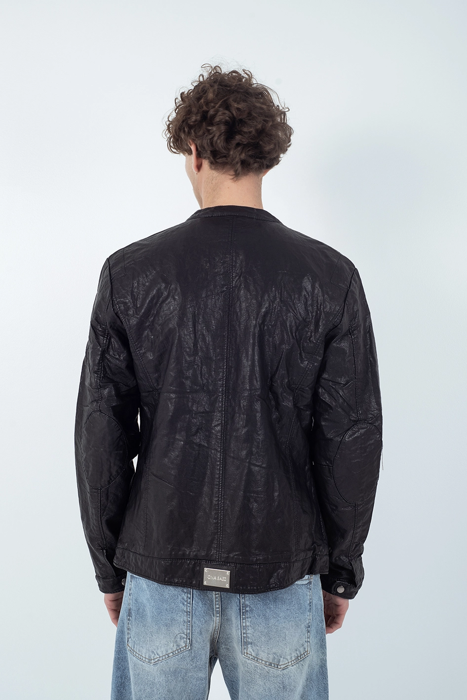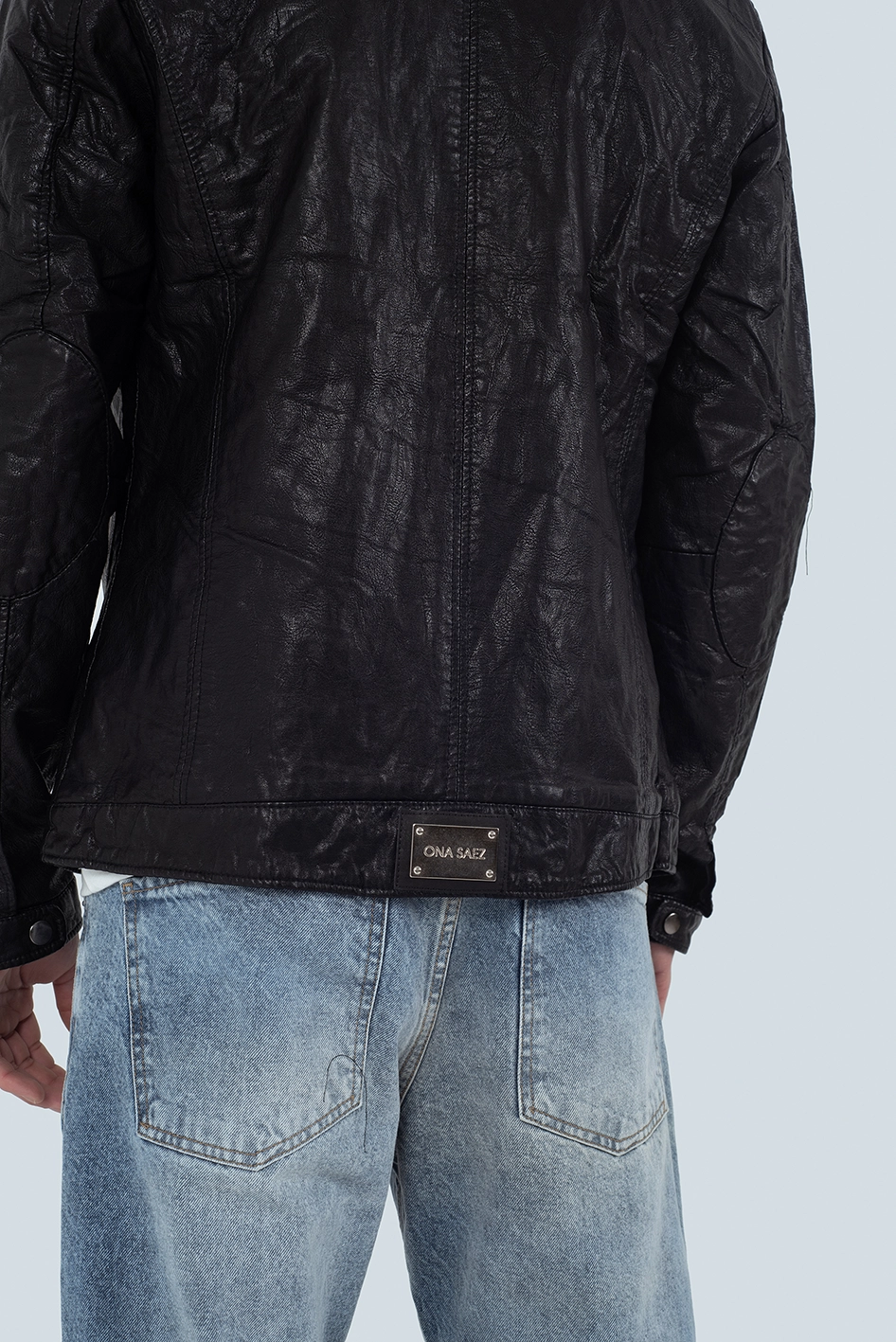 Campera  confeccionada en cuero ecológico (PU) con acabado efecto arrugado, que le otorga un look moderno y urbano.