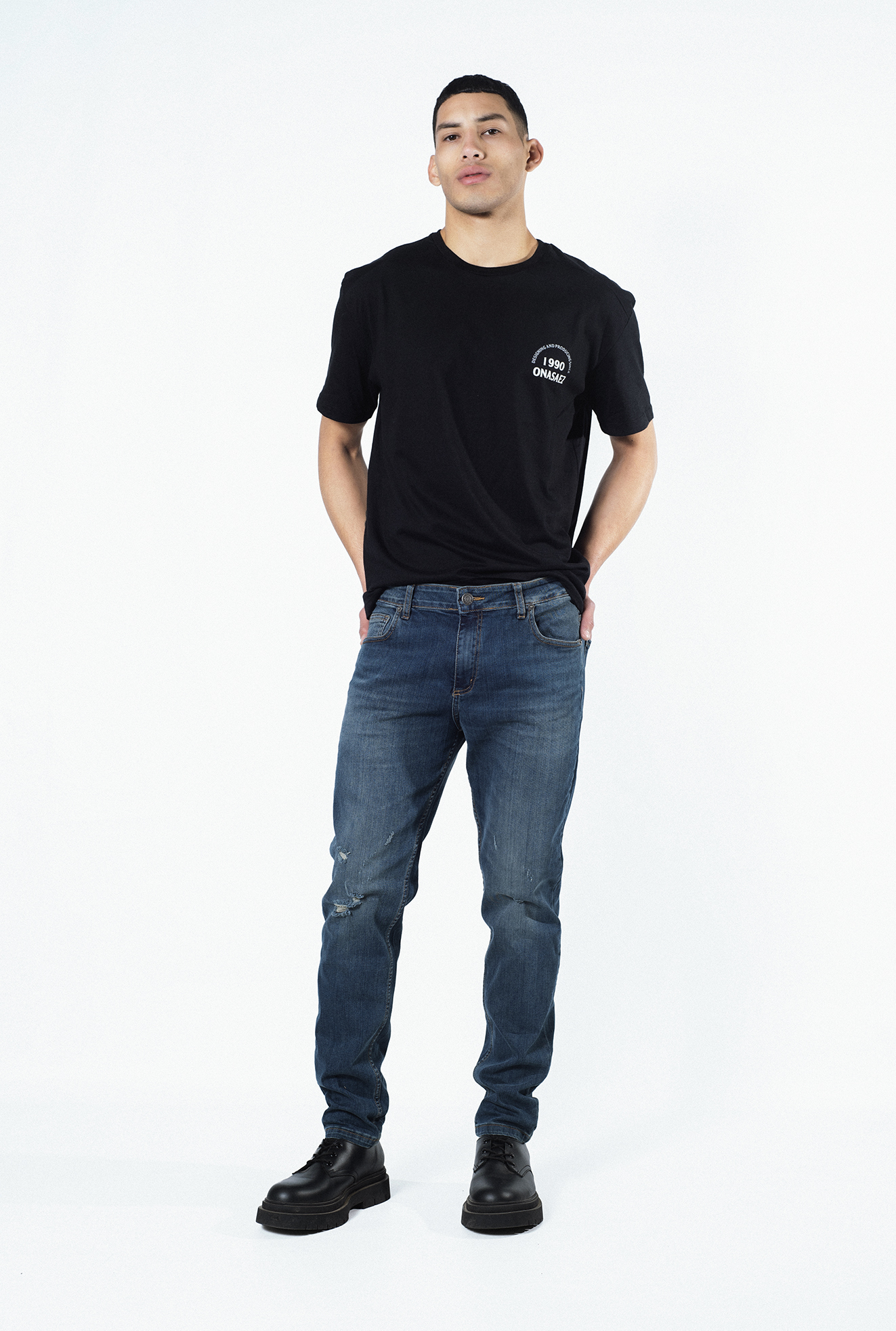 Lavado azul medio con suave efecto nevado, localizado y bigotes laser.
