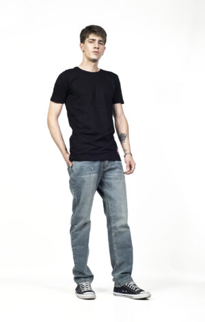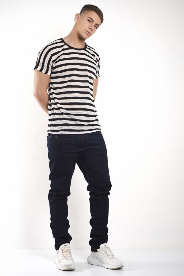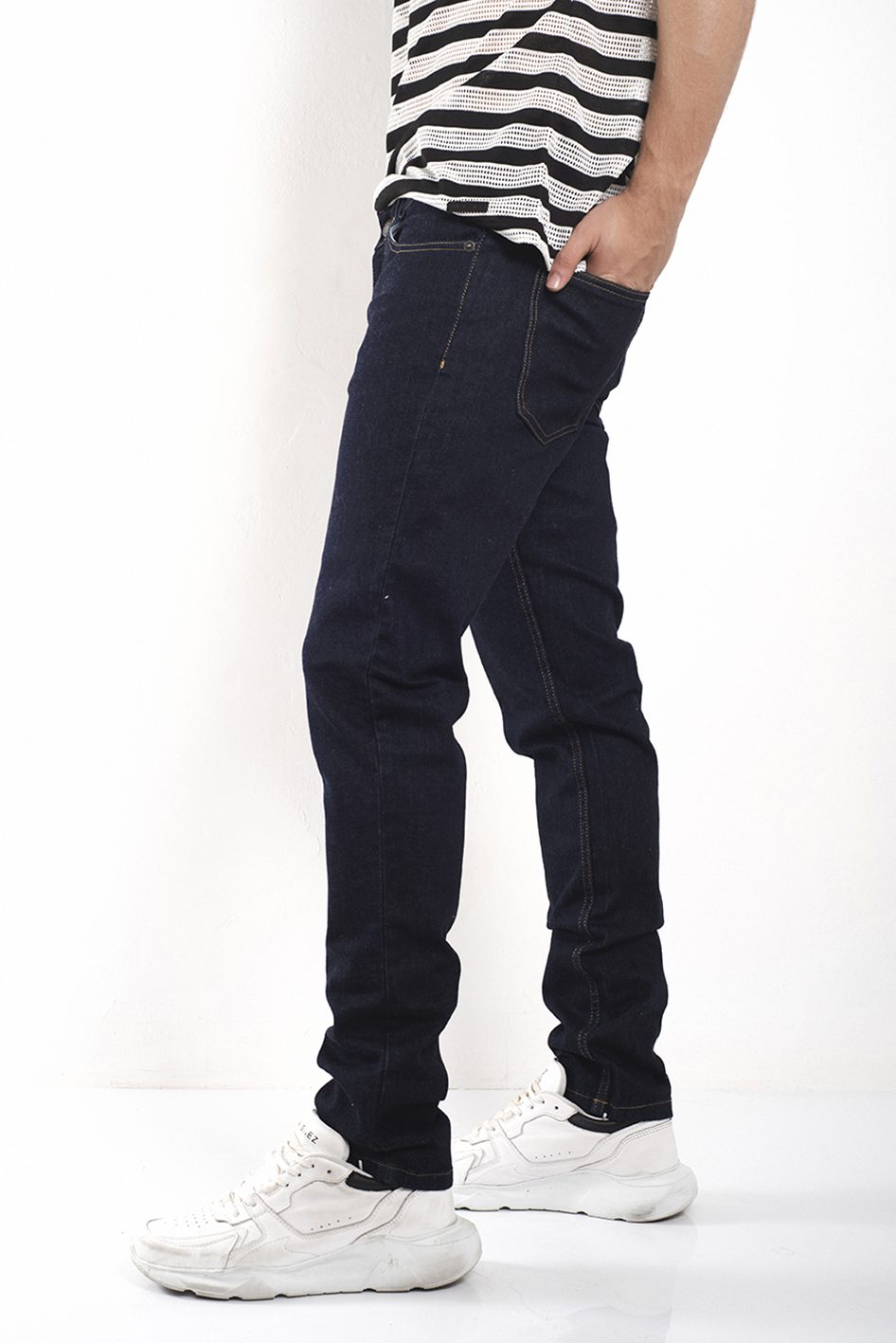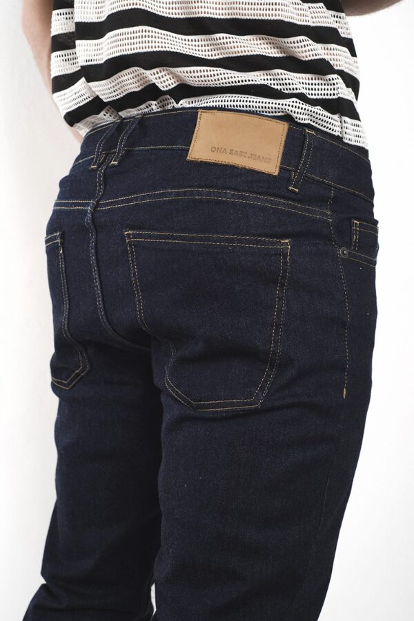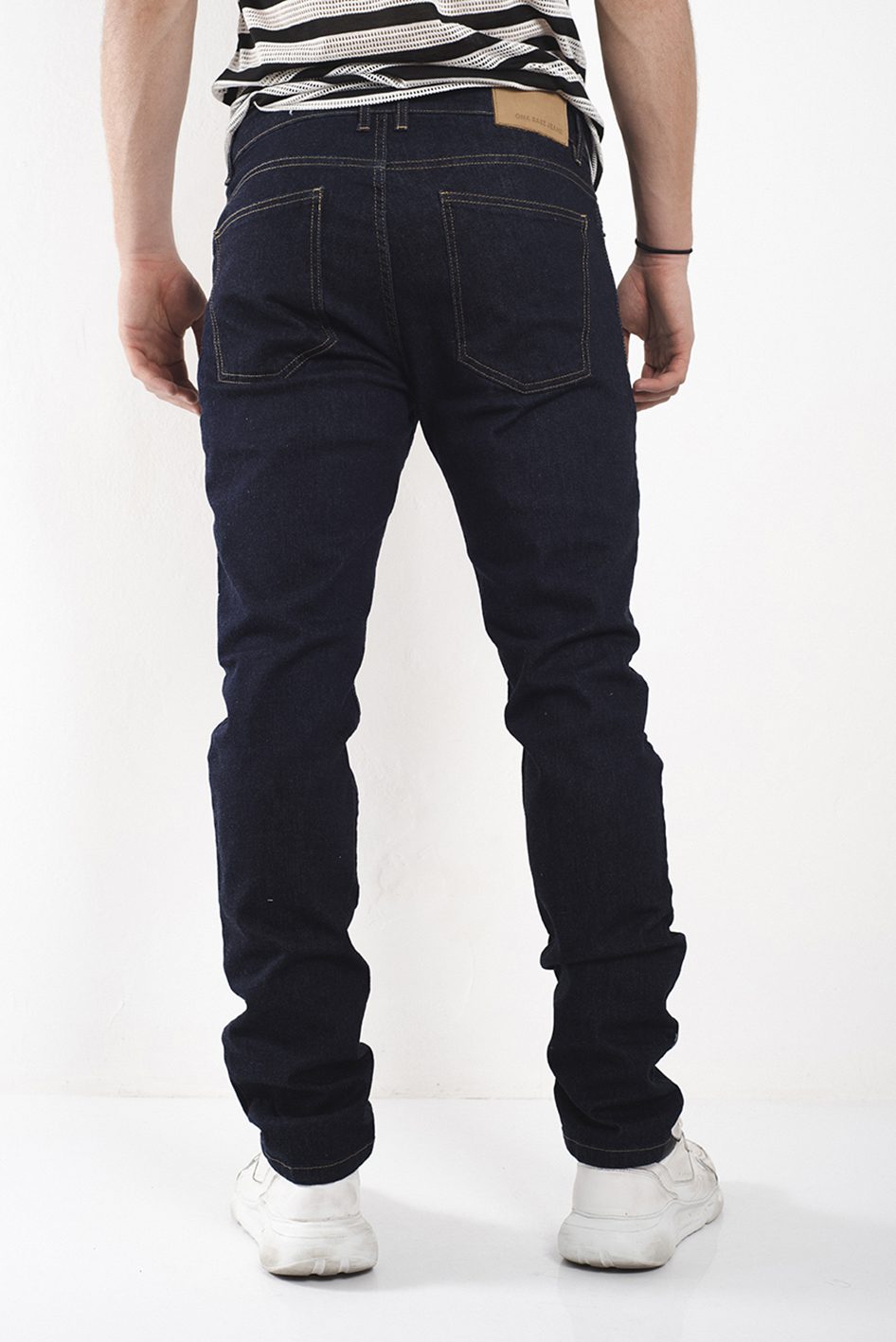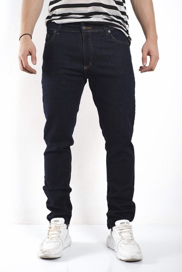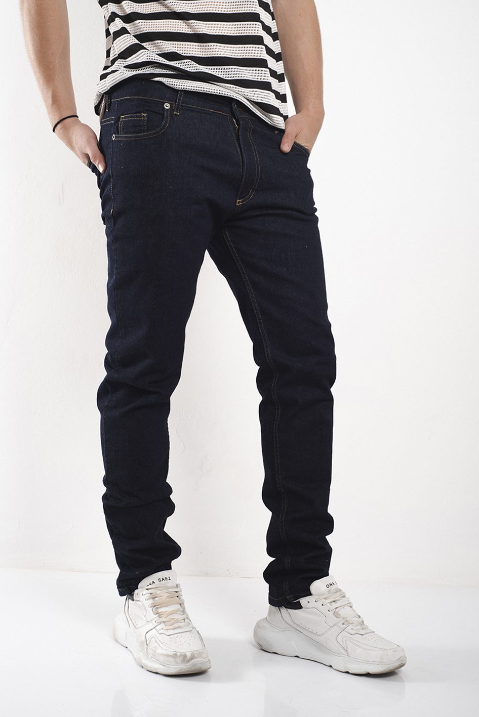 Jean slim fit, tiro medio, con cinco bolsillos cierre frontal y botón metálico de marca.