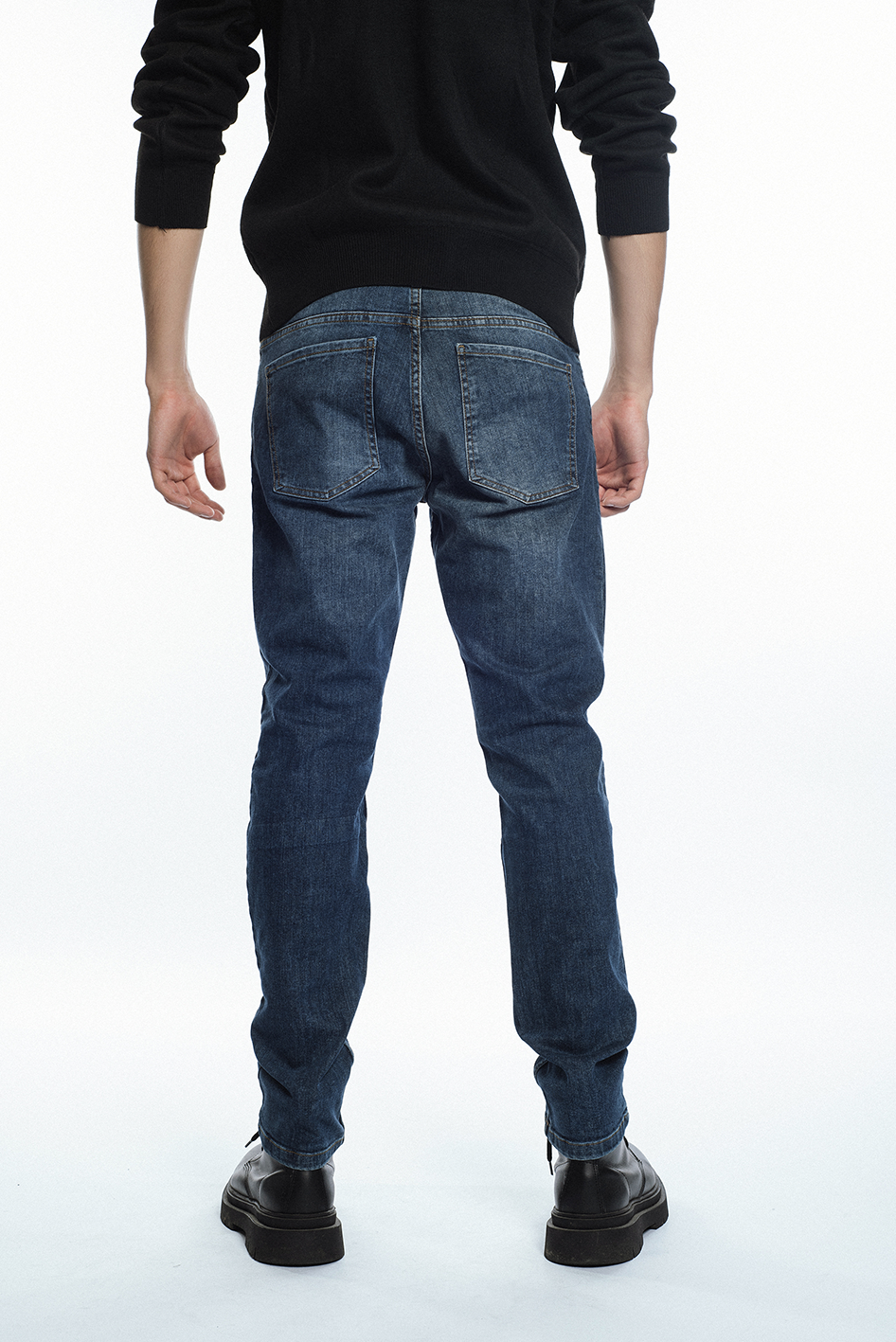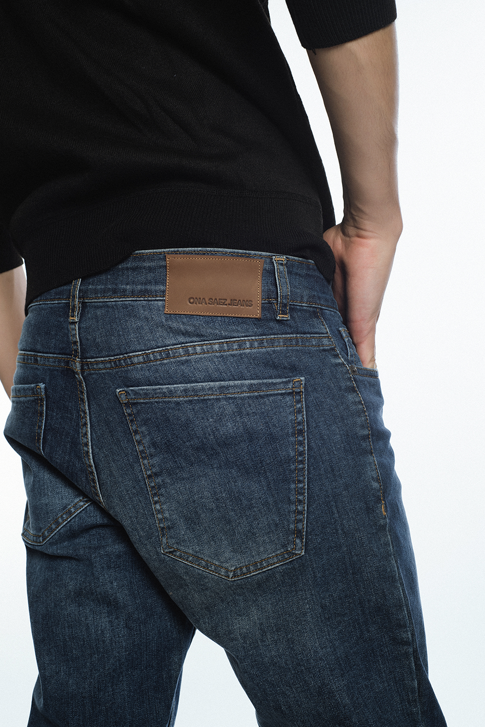 Lavado en tono azul medio con desgastes sutiles, bigotes láser y matizado que aportan un look urbano y actual. Cuenta con cinco bolsillos funcionales, cierre con cremallera y botón metálico personalizado. Etiqueta trasera en cuero sintético con logo grabado.