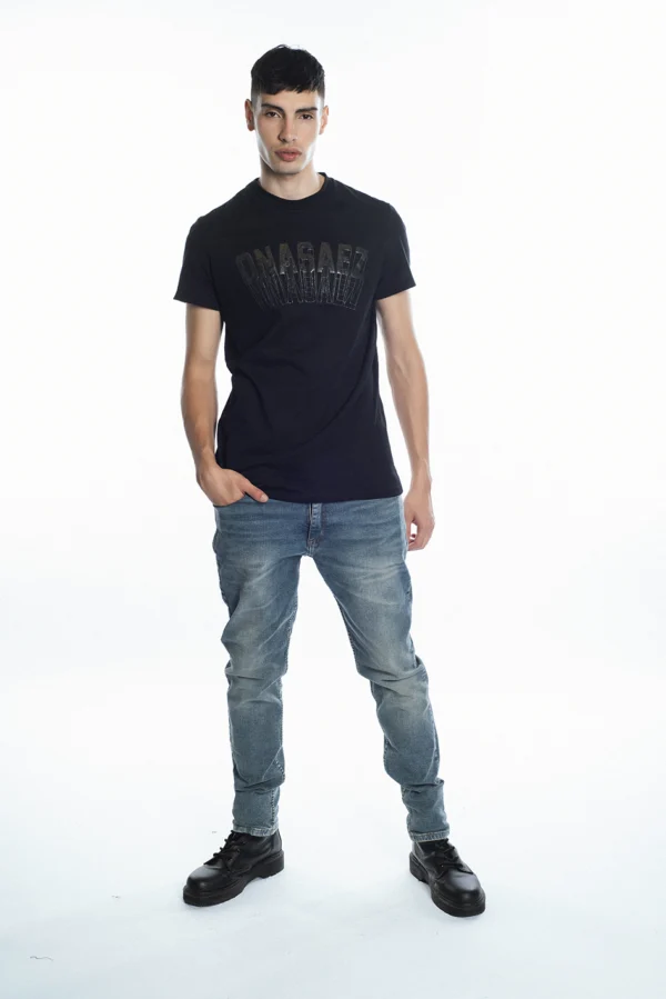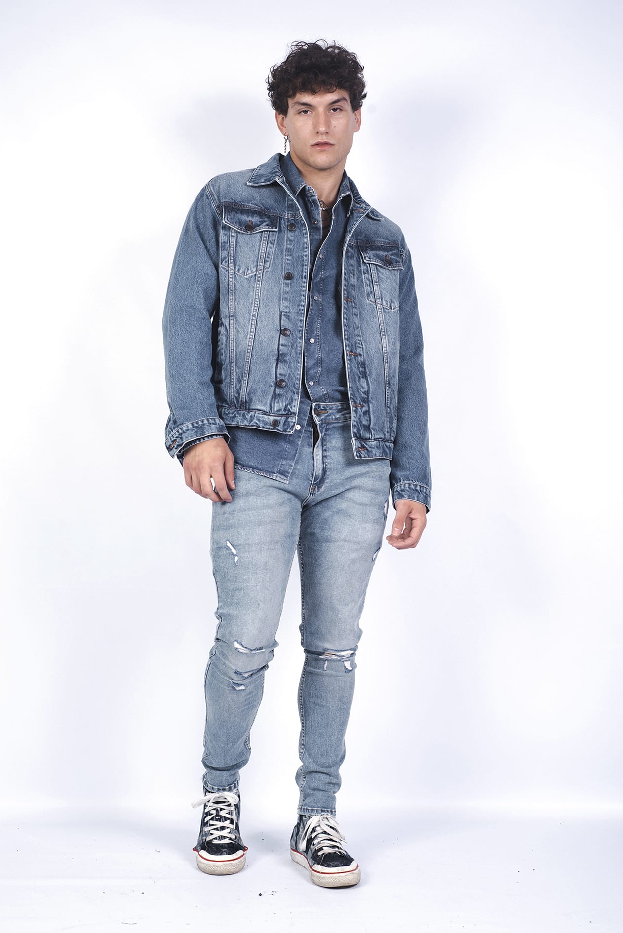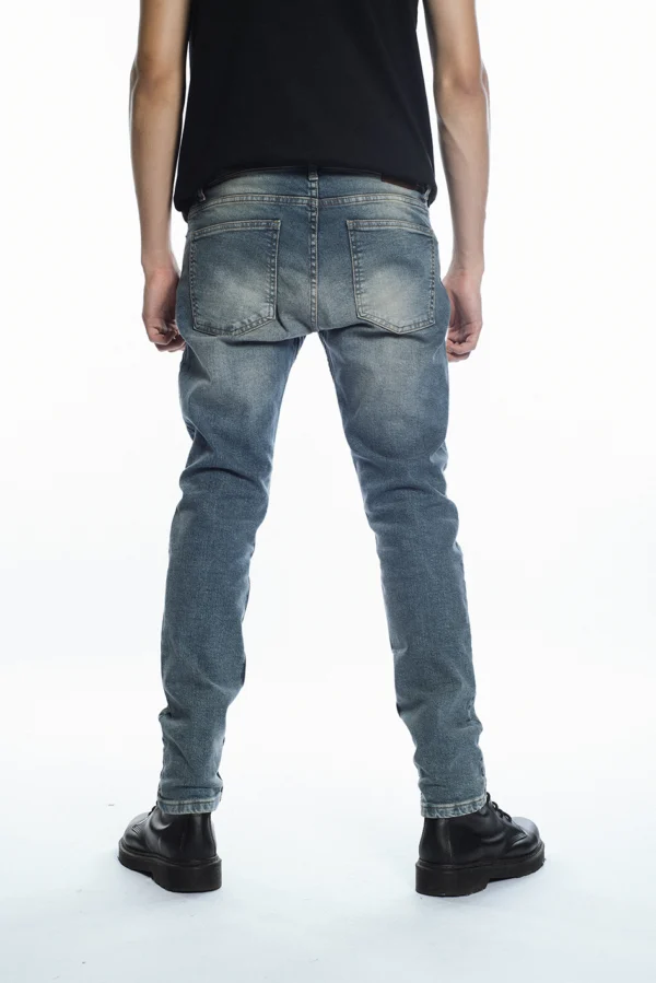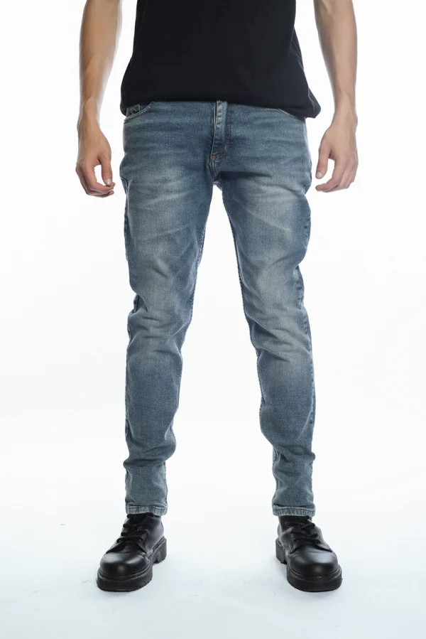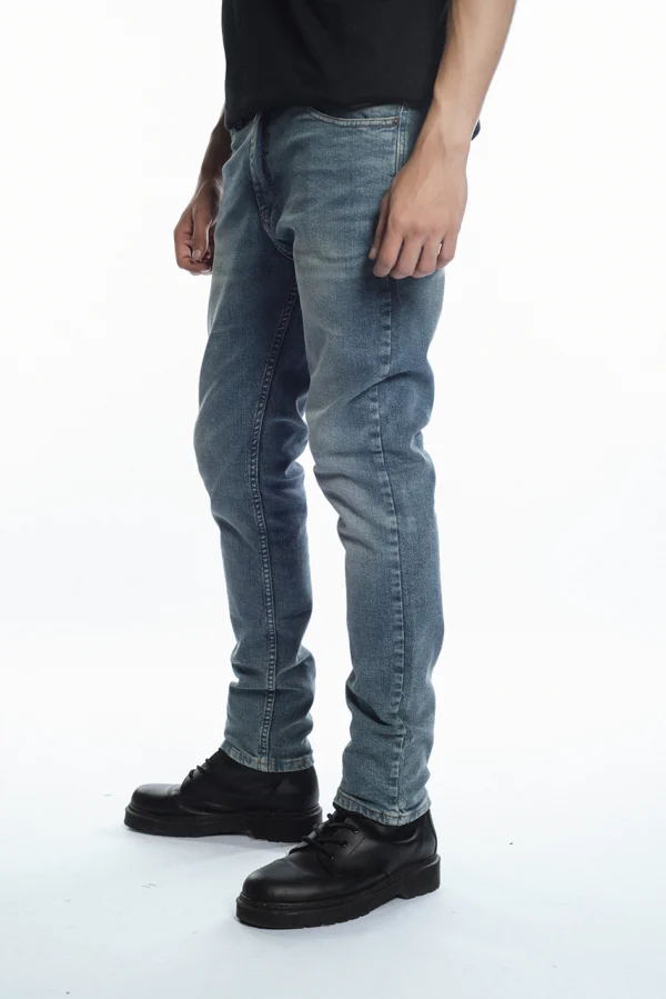 Jean calce slim fit, confeccionado en tejido super strech, lavado azul medio con matizado color ocre, localizado y bigotes laser.