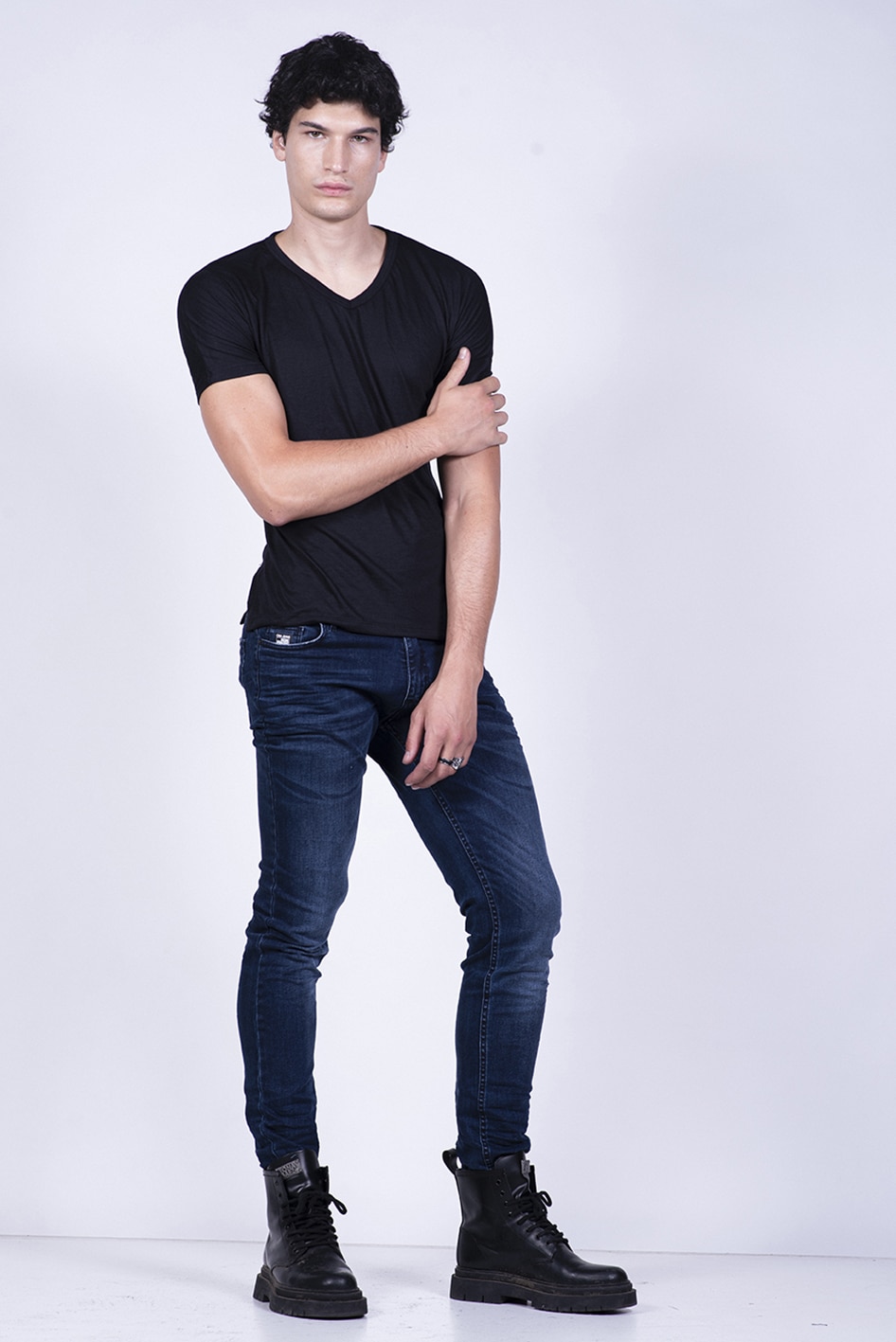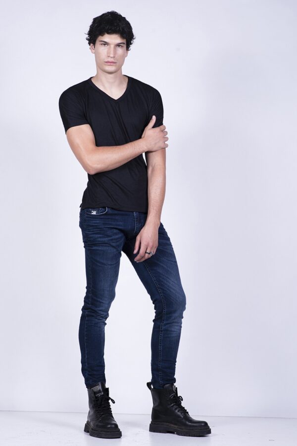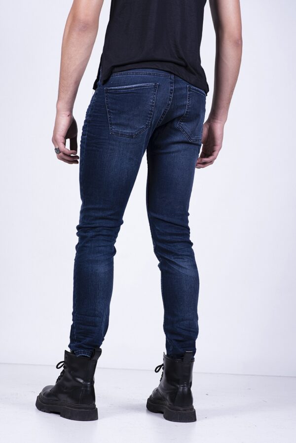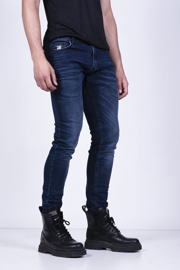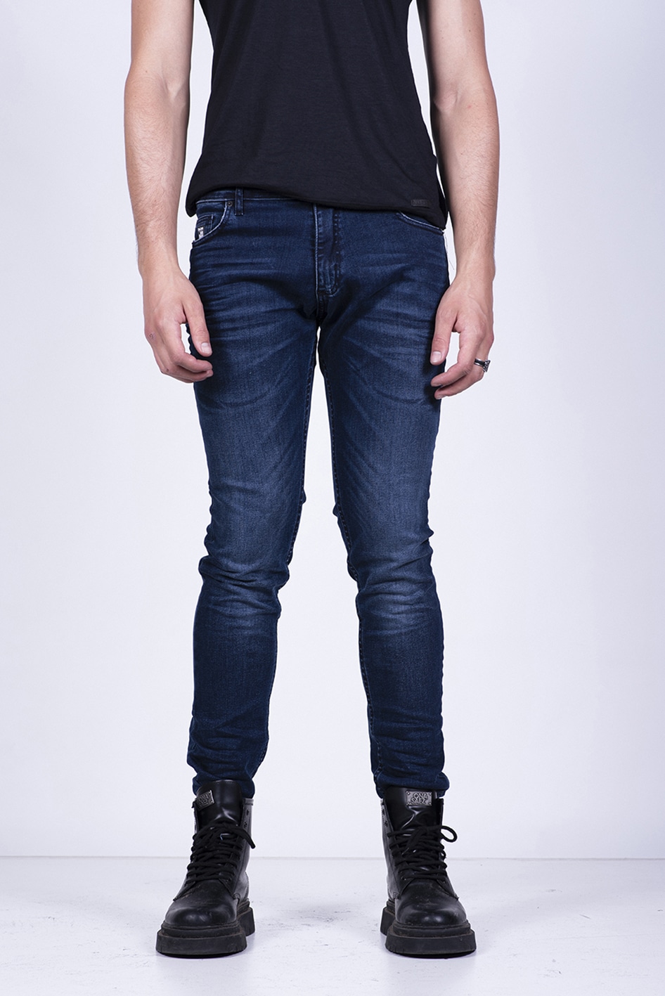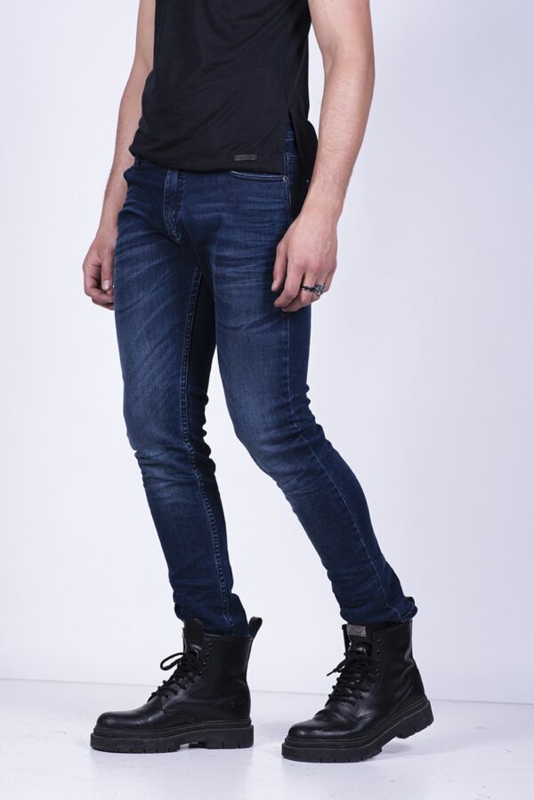 Jean calce skinny, tejido super strech, color azul petroleo con cinco bolsillos cierre frontal y botón metálico de marca.