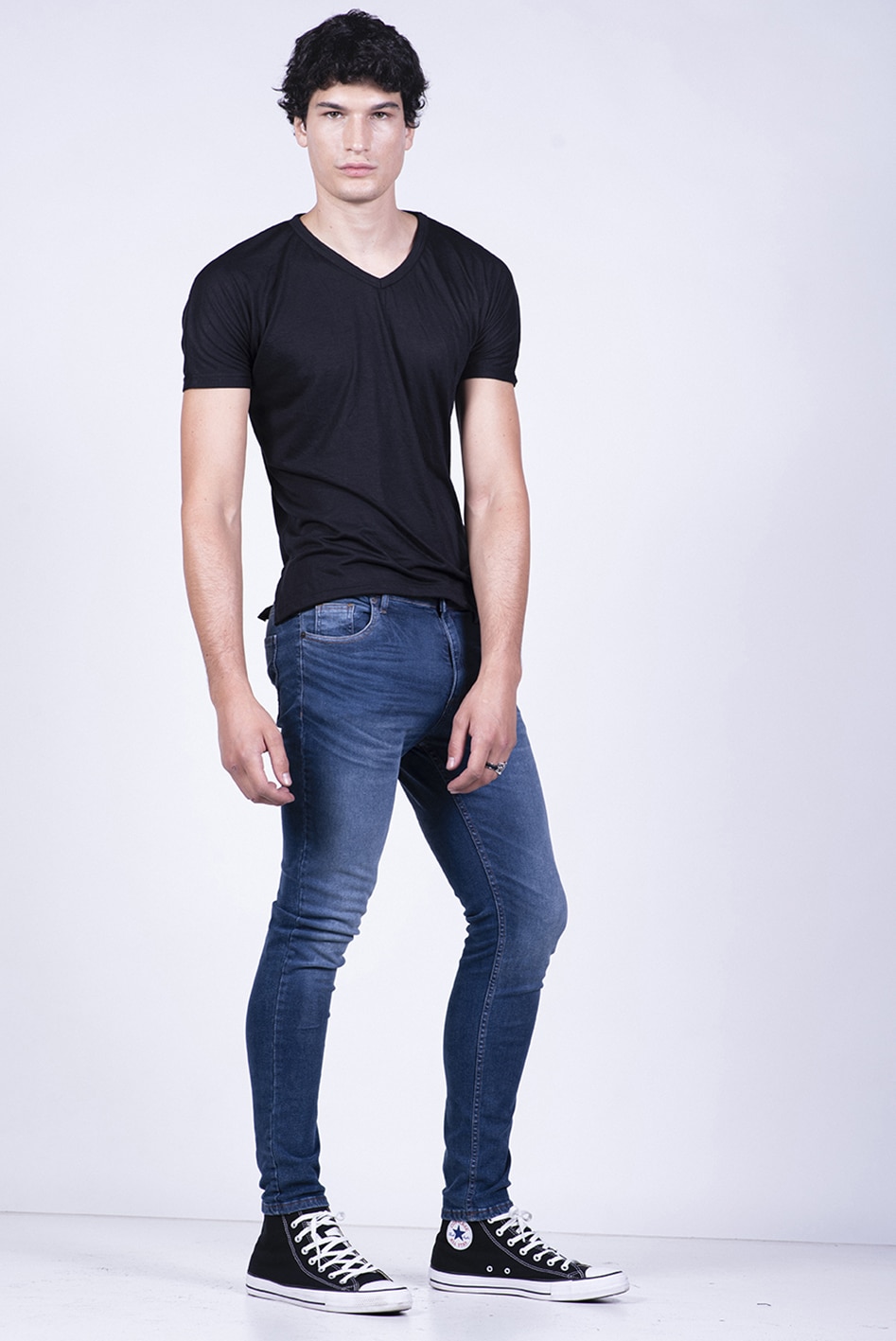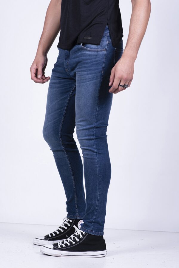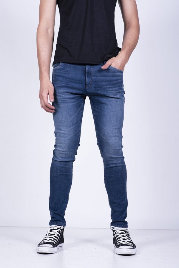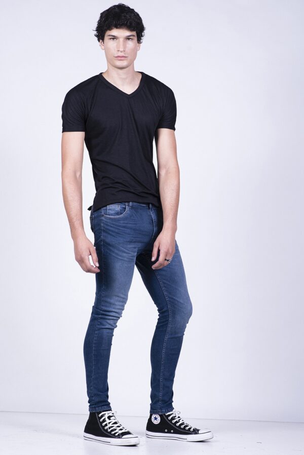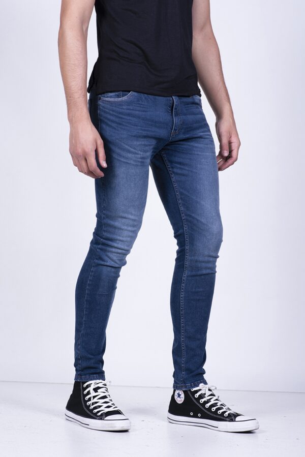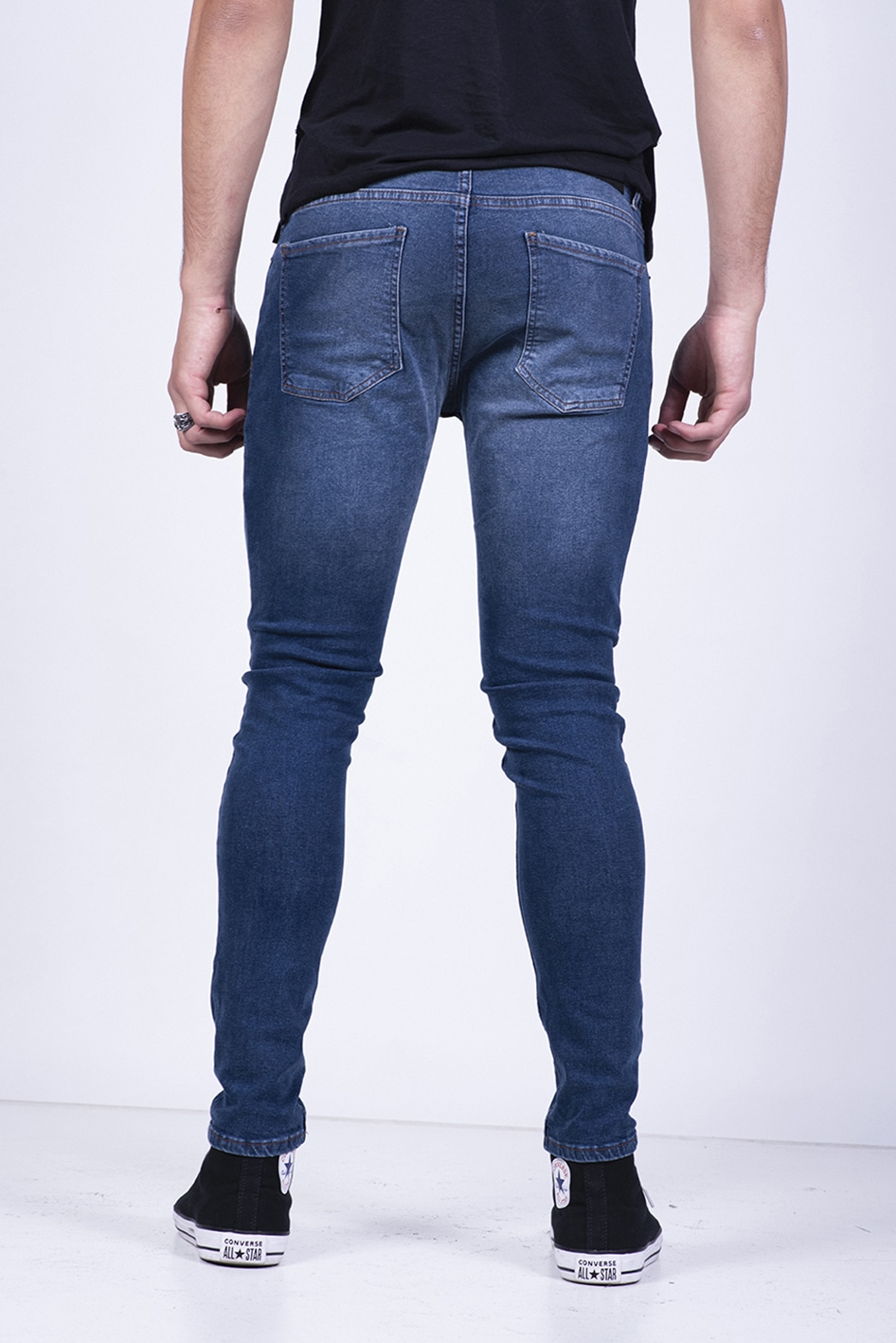Jean calce skinny, confeccionado en tejido super strech color azul medio, efecto simil desgastado color celeste con bigotes laser y localizado.