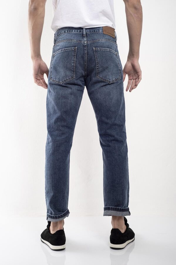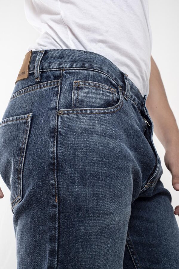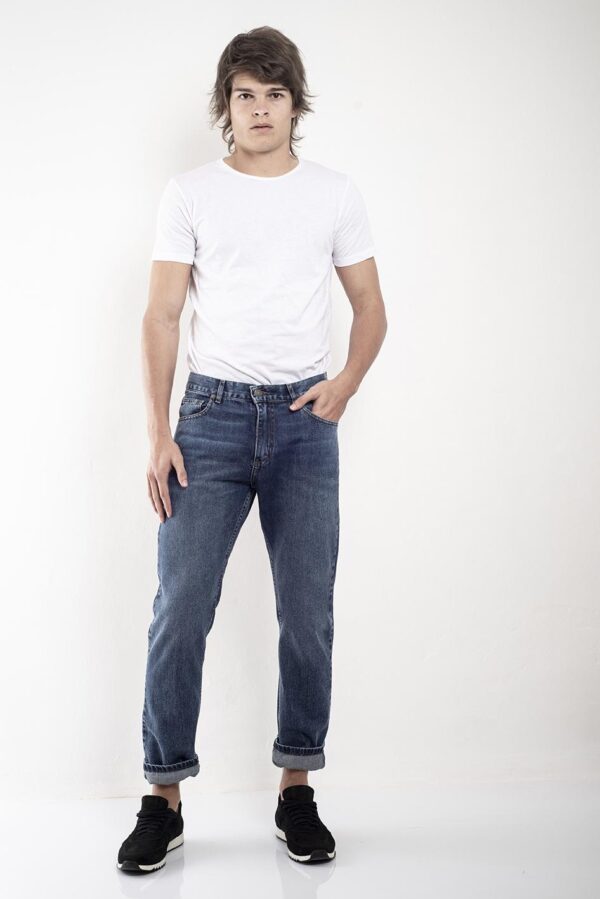 Jean recto relaxed fit con cinco bolsillos cierre frontal y botón metálico de marca.